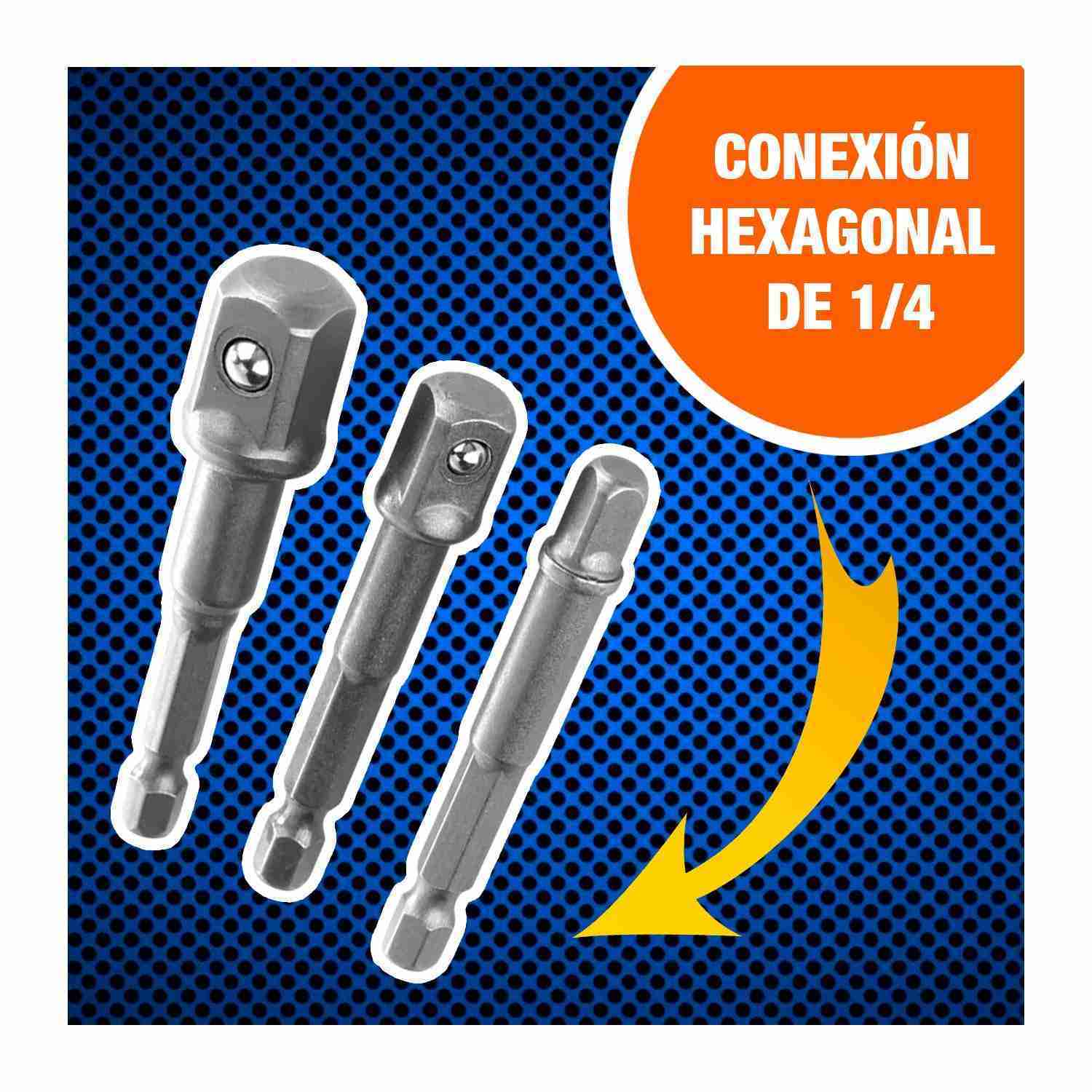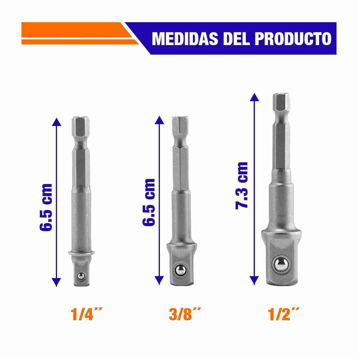 Set de tres adaptadores de dados (1/4″, 3/8″ y 1/2″) con vástago hexagonal universal de 1/4″, diseñados para cambios rápidos y seguros entre herramientas. Robustos, prácticos y listos para todo tipo de trabajos en taller o proyectos exigentes.