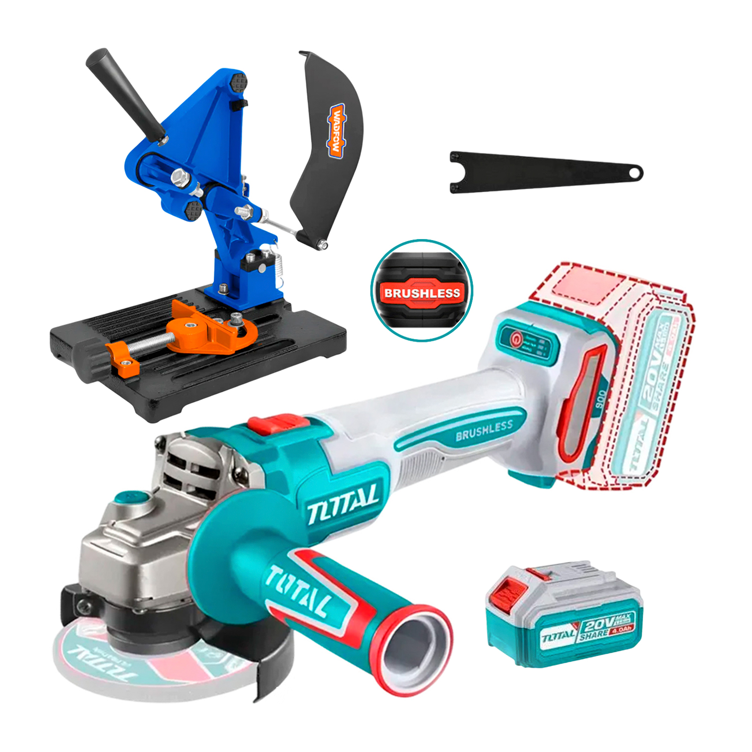 ESTE PRODUCTO INCLUYE: AMOLADORA INALÁMBRICA 20V 4 1/2 TOTAL + + 1 BATERÍA 4AH 20V + SOPORTE PARA AMOLADORA ANGULAR 4½" A 5" WADFOW