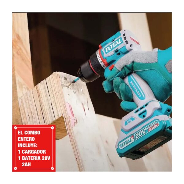 Este combo incluye un taladro atornillador inalámbrico de 20V con motor sin escobillas, acompañado de un set de accesorios prácticos para trabajos de carpintería y bricolaje. Contiene puntas de destornillador, brocas, extensiones flexibles, cargador, abrazaderas de sujeción, escuadras metálicas, cinta métrica y otras herramientas que facilitan la perforación, el ensamblaje y la medición con precisión.