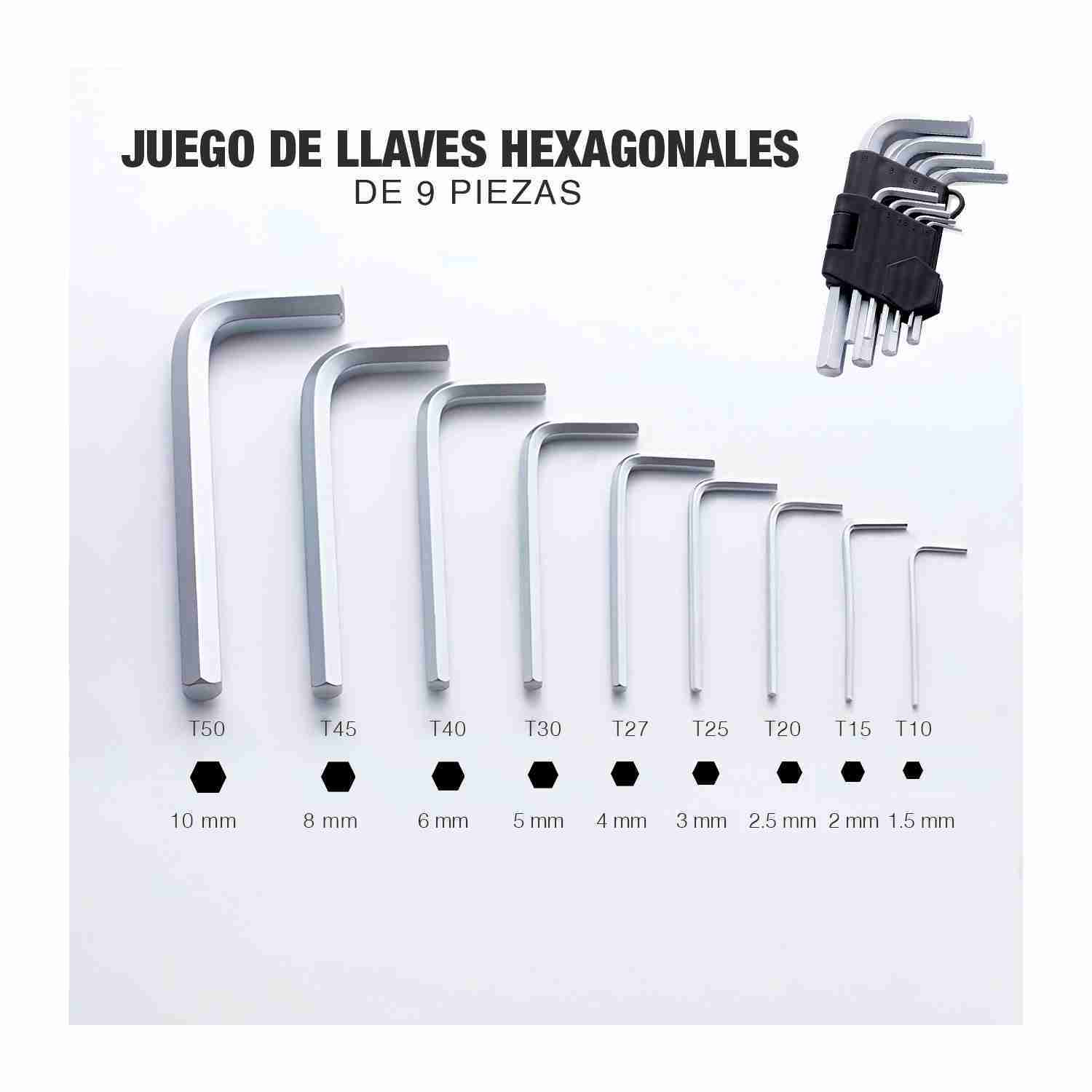 - Tamaño de llave hexagonal métrica de 9 piezas: 1. 0.197 in, 0.079 in, 2. 0.197 in, 0.118 in, 0.157 in, 0.197 in, 0.236 in, 0.315 in, 0.394 in.