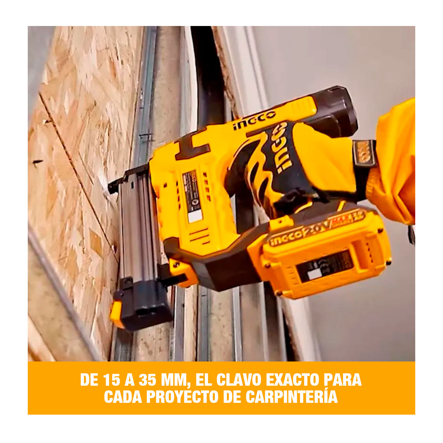 La clavadora inalámbrica INGCO CBNLI2005 de 20V es una herramienta práctica y potente diseñada para trabajos de carpintería, instalación y acabados. Funciona con batería de litio, permitiendo total libertad de movimiento sin necesidad de cables. Acepta clavos tipo F15 a F35, con una velocidad aproximada de 2 clavos por segundo y un cargador con capacidad de hasta 105 unidades. Su diseño compacto y ligero facilita el uso continuo, mientras que su maletín y accesorios incluidos la convierten en una solución eficiente y profesional para proyectos en madera y montaje rápido.