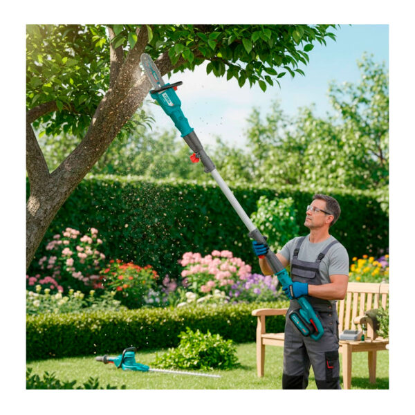 TPTS201681 es una herramienta inalámbrica 2 en 1 que combina una sierra de pértiga y una recortadora de setos, ideal para mantener jardines, árboles y arbustos en perfecto estado. Funciona con batería de 20 V, ofreciendo potencia y libertad de movimiento sin cables. Su diseño telescópico permite alcanzar ramas altas con facilidad, mientras que sus cuchillas de acero de alta calidad garantizan cortes precisos y rápidos. Perfecta para usuarios que buscan eficiencia, comodidad y resultados profesionales en tareas de poda y jardinería.