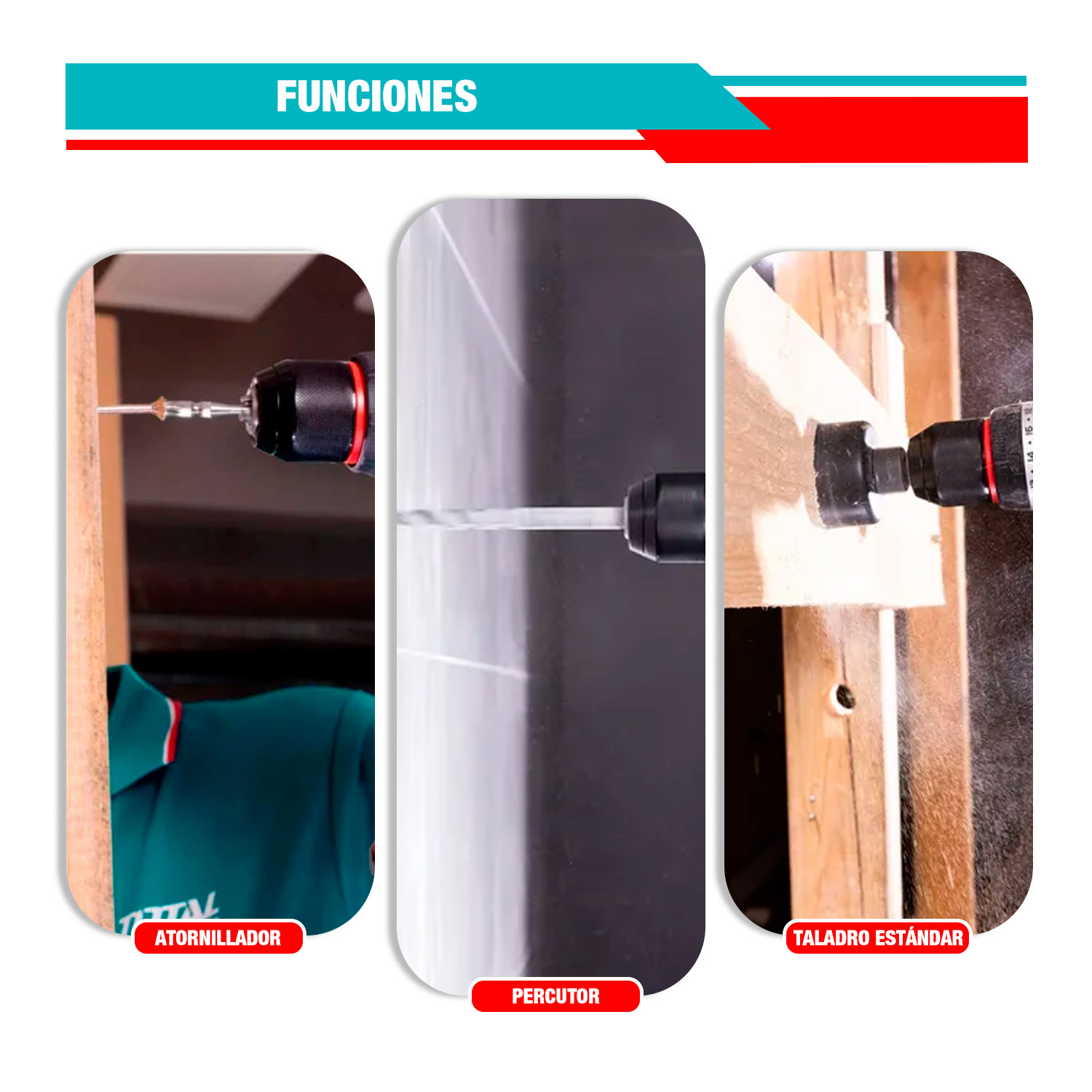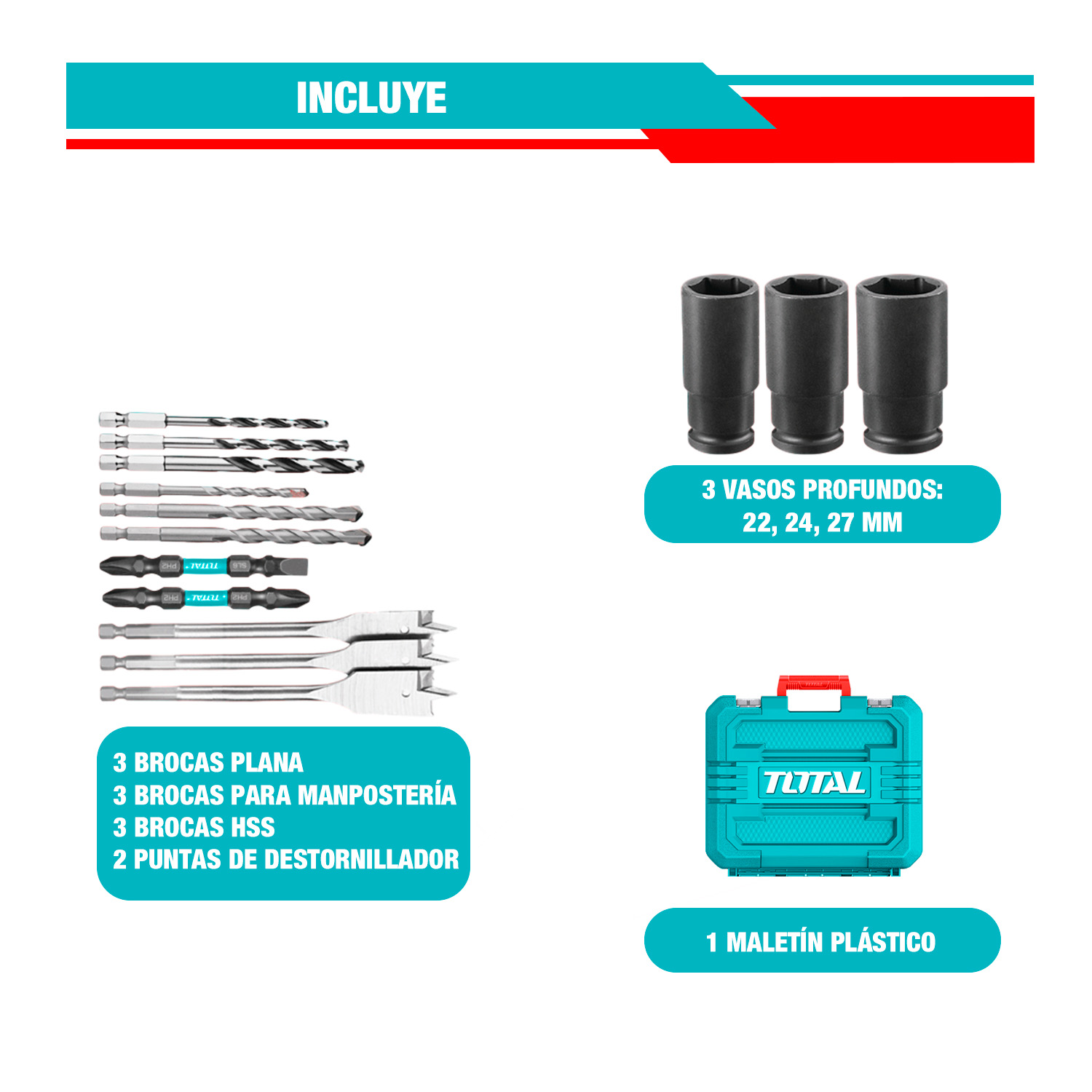 ESTE COMBO COMPLETO INCLUYE; 1 LLAVE DE IMPACTO; 1 TALADRO IMPACTO; 3 BROCAS PLANAS; 3 BROCAS MAMPOSTERÍA; 3 BROCAS HSS; 2 PUNTAS DESTORNILLADOR; 3 VASOS LARGOS; 2 BATERÍAS 4Ah; 1 CARGADOR.