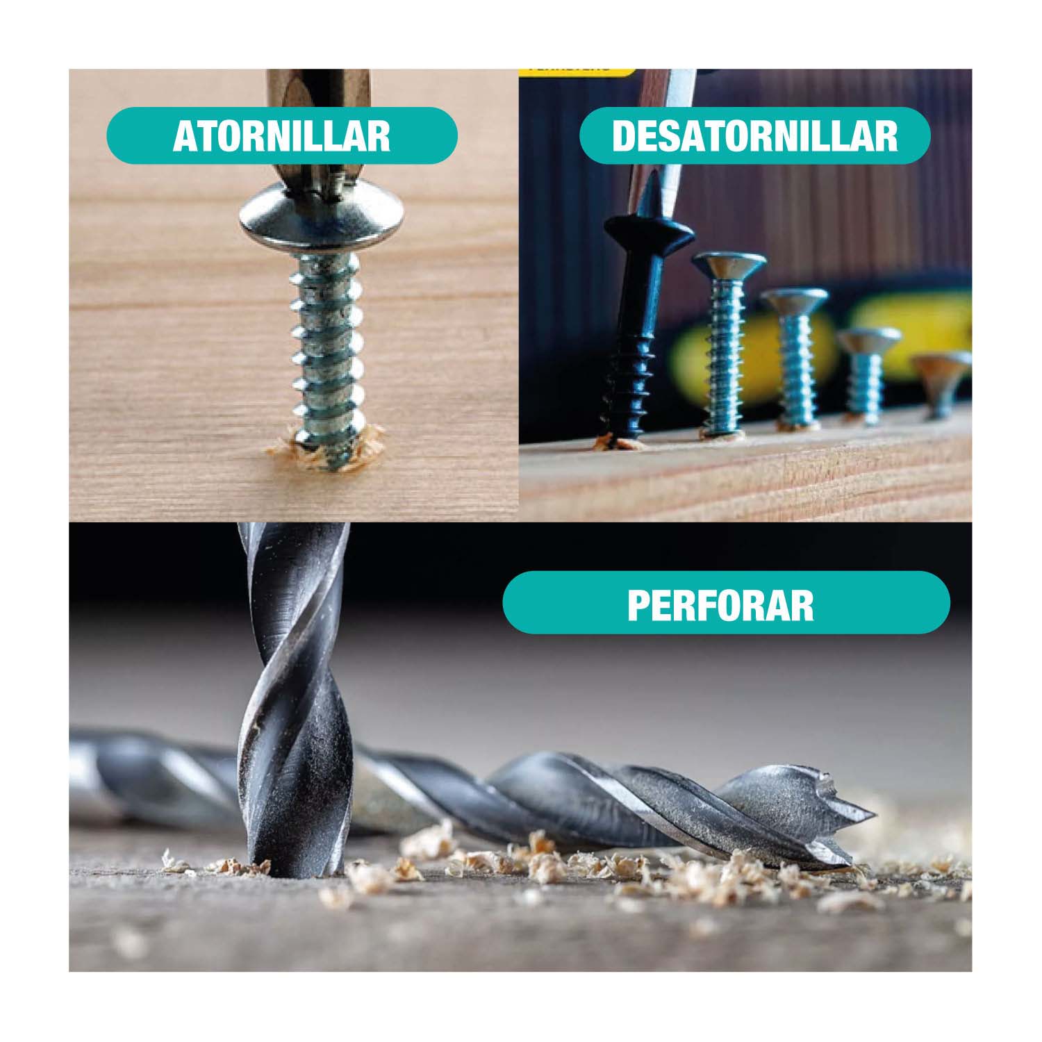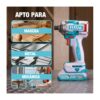 y fijación como para limpieza rápida en áreas de trabajo. Viene acompañado con baterías recargables, cargador, brocas, puntas y llaves de tuercas, lo que permite un uso inmediato y