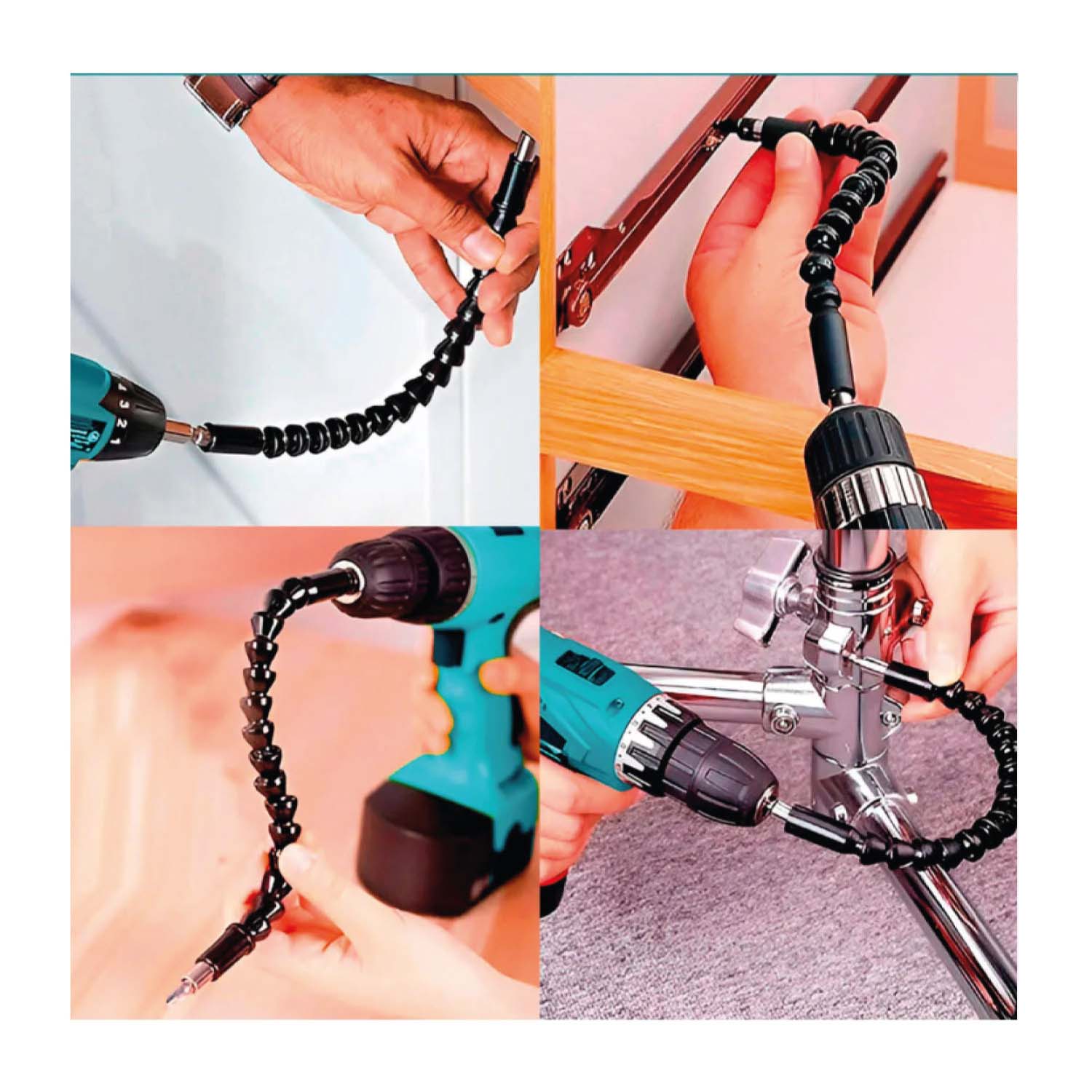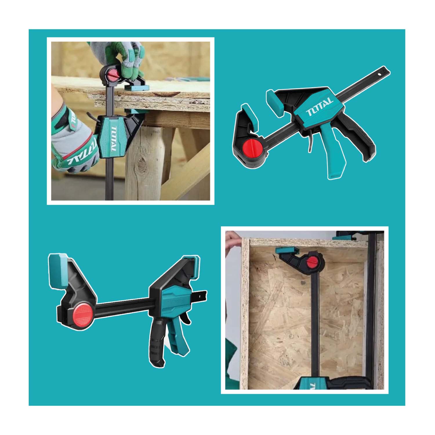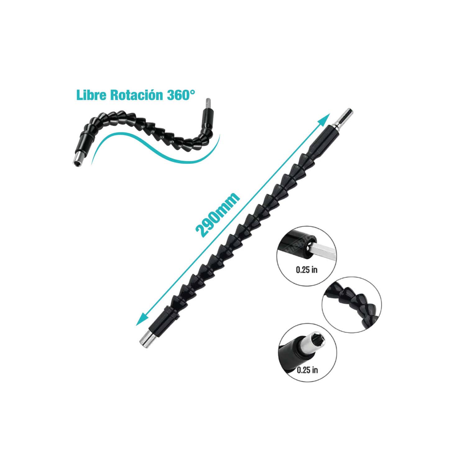 Este combo reúne accesorios prácticos para trabajos de carpintería y bricolaje. Incluye una extensión flexible que facilita el acceso a tornillos en lugares reducidos, una broca tipo Forstner para perforaciones limpias en madera, un juego de puntas intercambiables para diferentes tipos de tornillos, dos escuadras metálicas para uniones precisas a 90 grados, una prensa de apriete rápido de la marca Total, una escuadra metálica con nivel integrado para medir y alinear con exactitud, y una cinta métrica retráctil Total para obtener medidas precisas. Es un conjunto versátil que facilita tareas de ensamblaje, perforación y medición en proyectos de construcción o reparaciones.
