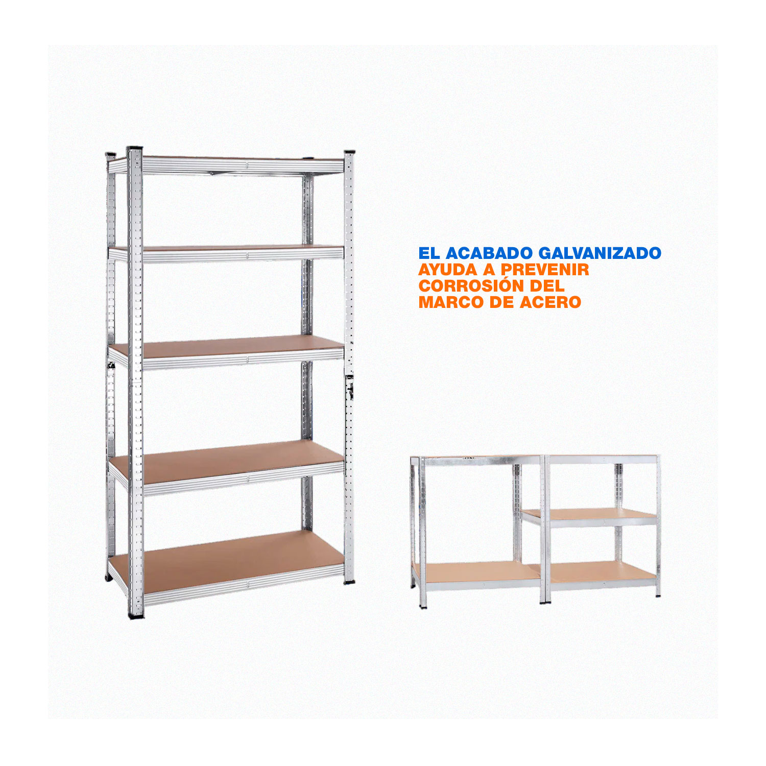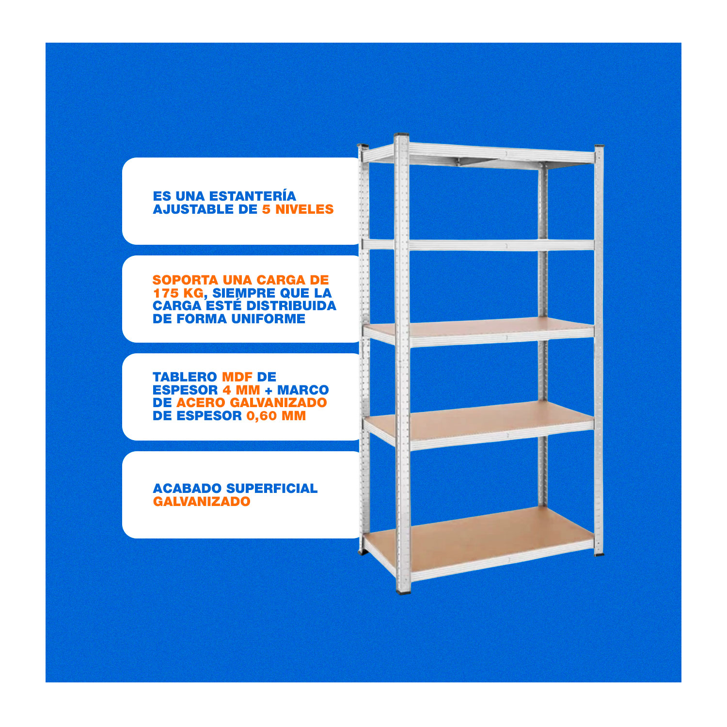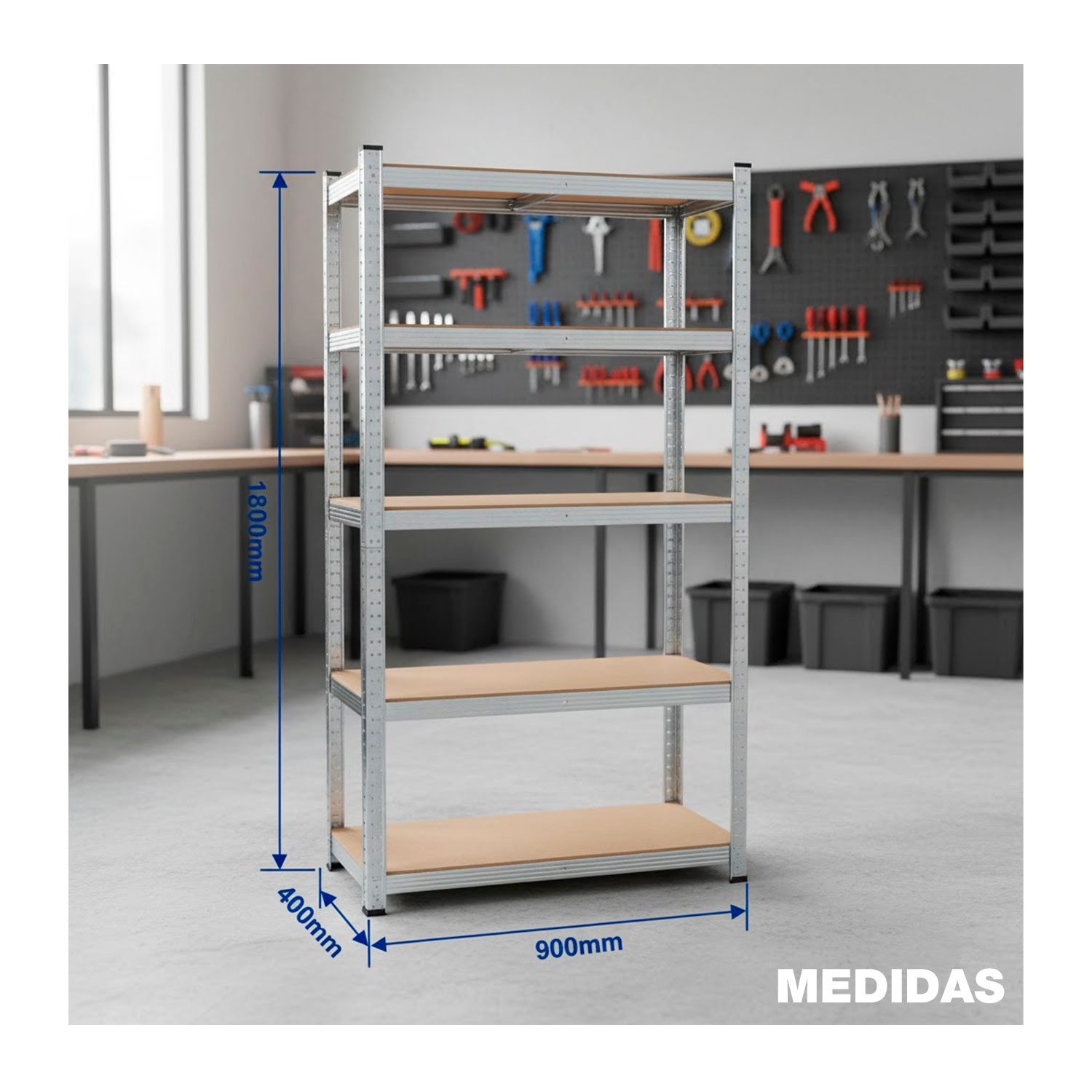 La estantería de 5 niveles WTS1A94 combina funcionalidad y robustez, con unas dimensiones de 900 mm de ancho, 400 mm de profundidad y 1 800 mm de altura, y es capaz de soportar hasta 175 kg en cada estante cuando la carga está distribuida de forma uniforme. Está construida con tableros de MDF de 4 mm de espesor y un marco de acero galvanizado de 0,60 mm, incluyendo soporte central en cada balda para mayor estabilidad. Su acabado galvanizado le aporta durabilidad y un aspecto limpio, haciéndola apta tanto para ambientes de taller, garaje u oficinas como para uso doméstico.