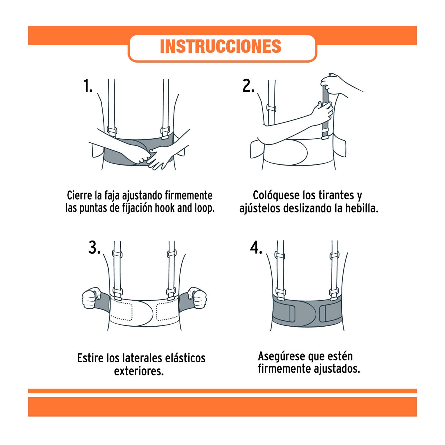 2.- Coloque los tirantes en sus hombros y ajustelos a su medida deslizando la hebilla. Asegurese que la faja le quede comoda.