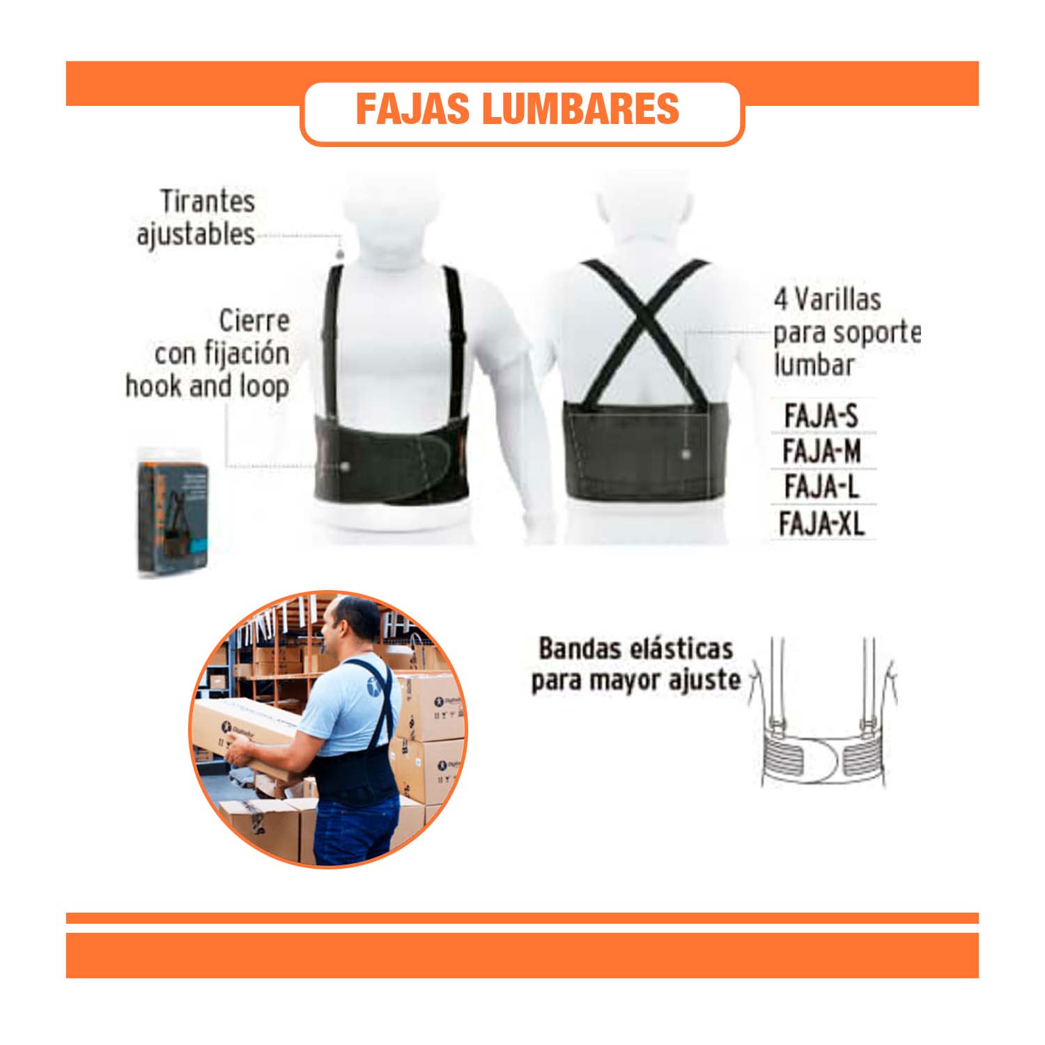 Caracteristicas : Faja sacrolumbar fabricada en poliester, el soporte frontal se acorta para mayor comodidad al inclinarse. Sus tirantes de elasteno son ajustables. Su refuerzo interior brinda un mayor soporte al momento del envion de carga al operario.