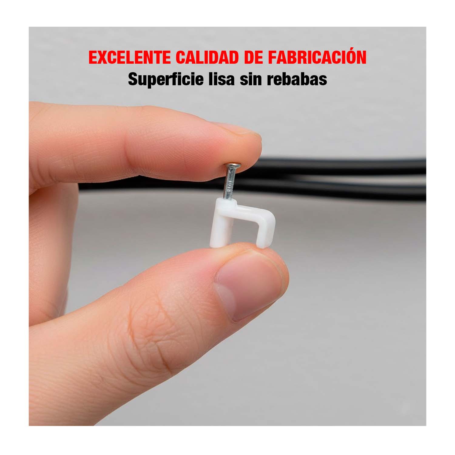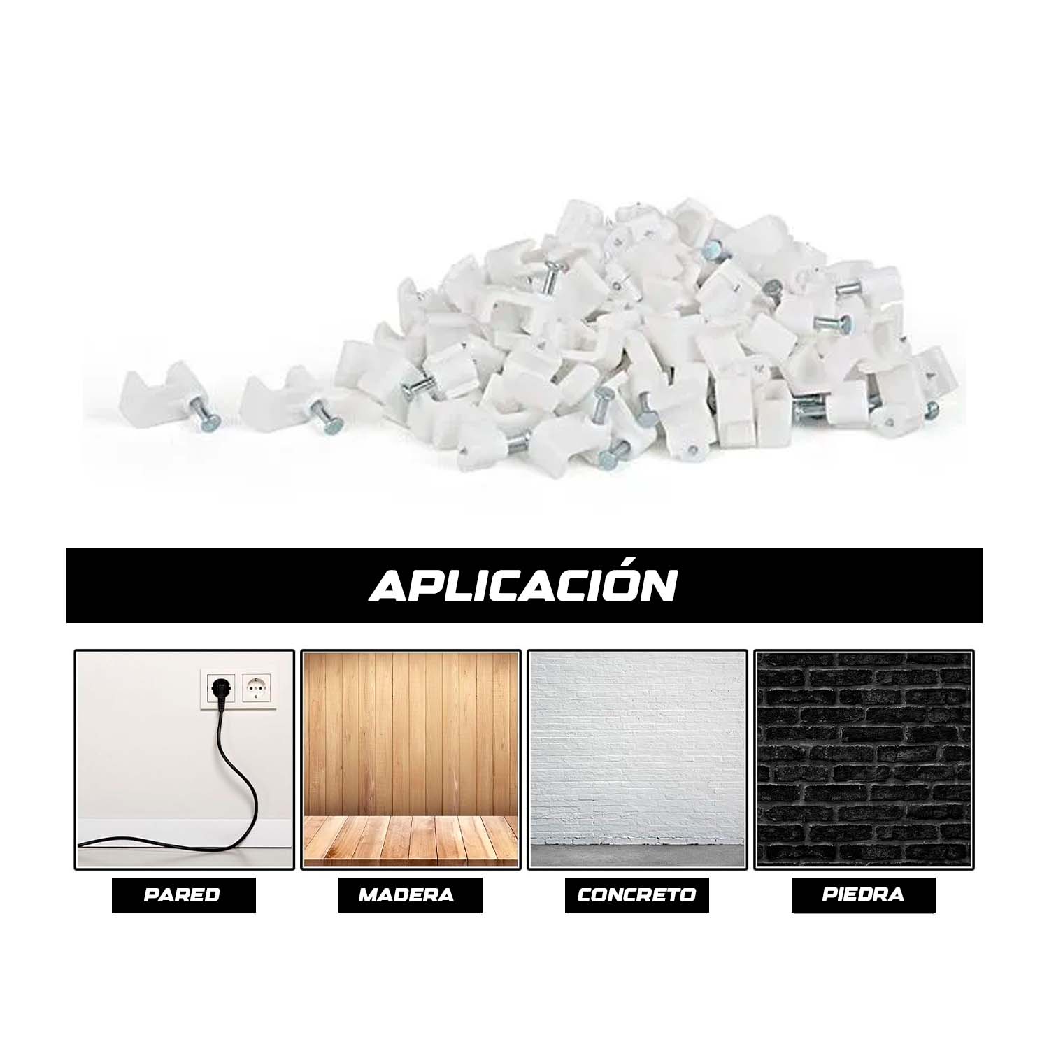 - Uso: Fijación de cables eléctricos en muros, madera o mampostería