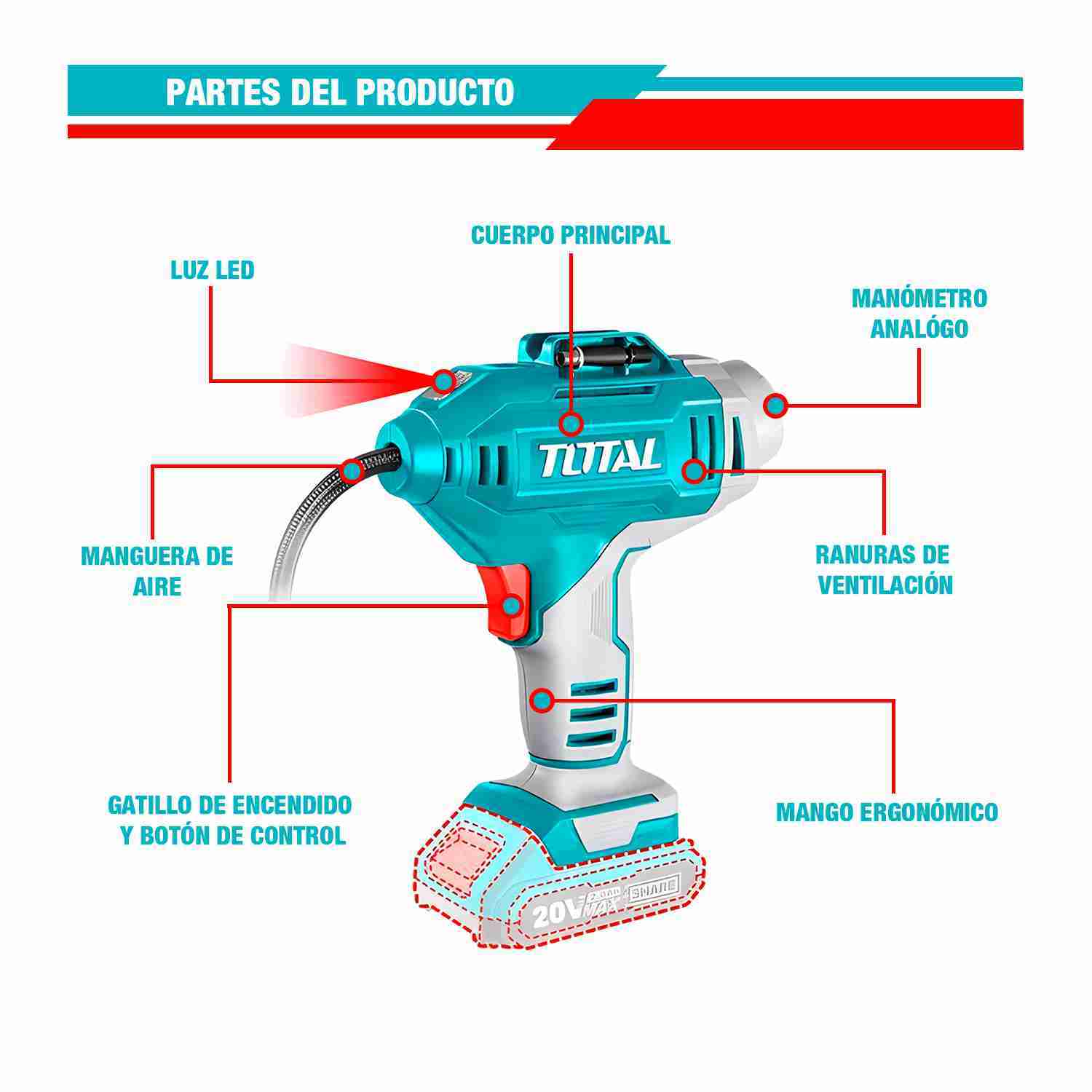 INFLADOR COMPRESOR INALÁMBRICO A BATERÍA 20V TOTAL - TACLI2018