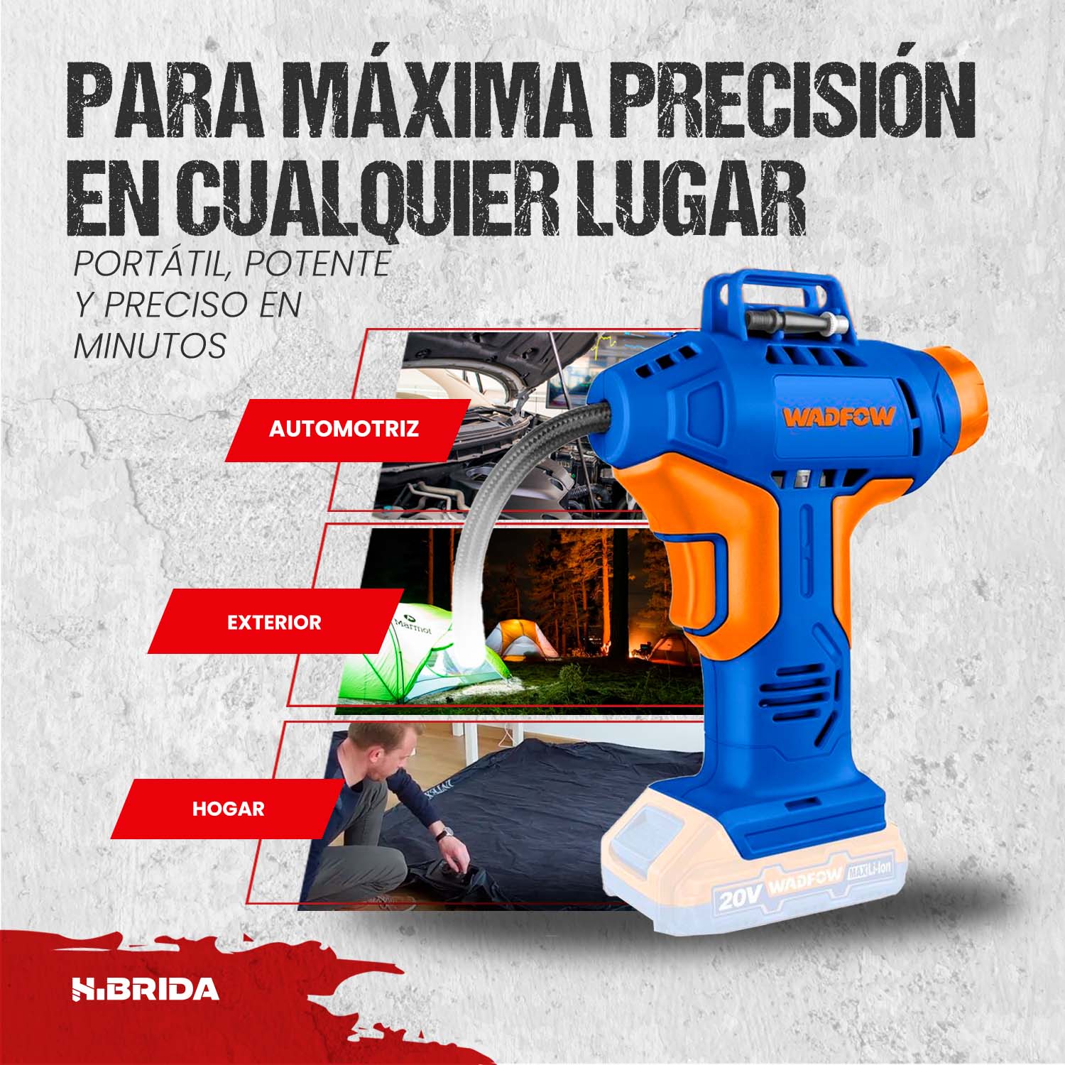 Compresor inflador portátil diseñado para brindar un rendimiento eficiente y práctico en todo tipo de tareas de inflado. Funciona con batería de 20V, ofreciendo una presión máxima de hasta 150 PSI (10.5 bar), ideal para llantas, bicicletas, balones y más. Su diseño ligero y compacto facilita el transporte y almacenamiento, convirtiéndolo en una herramienta indispensable tanto para el hogar como para uso ocasional profesional.