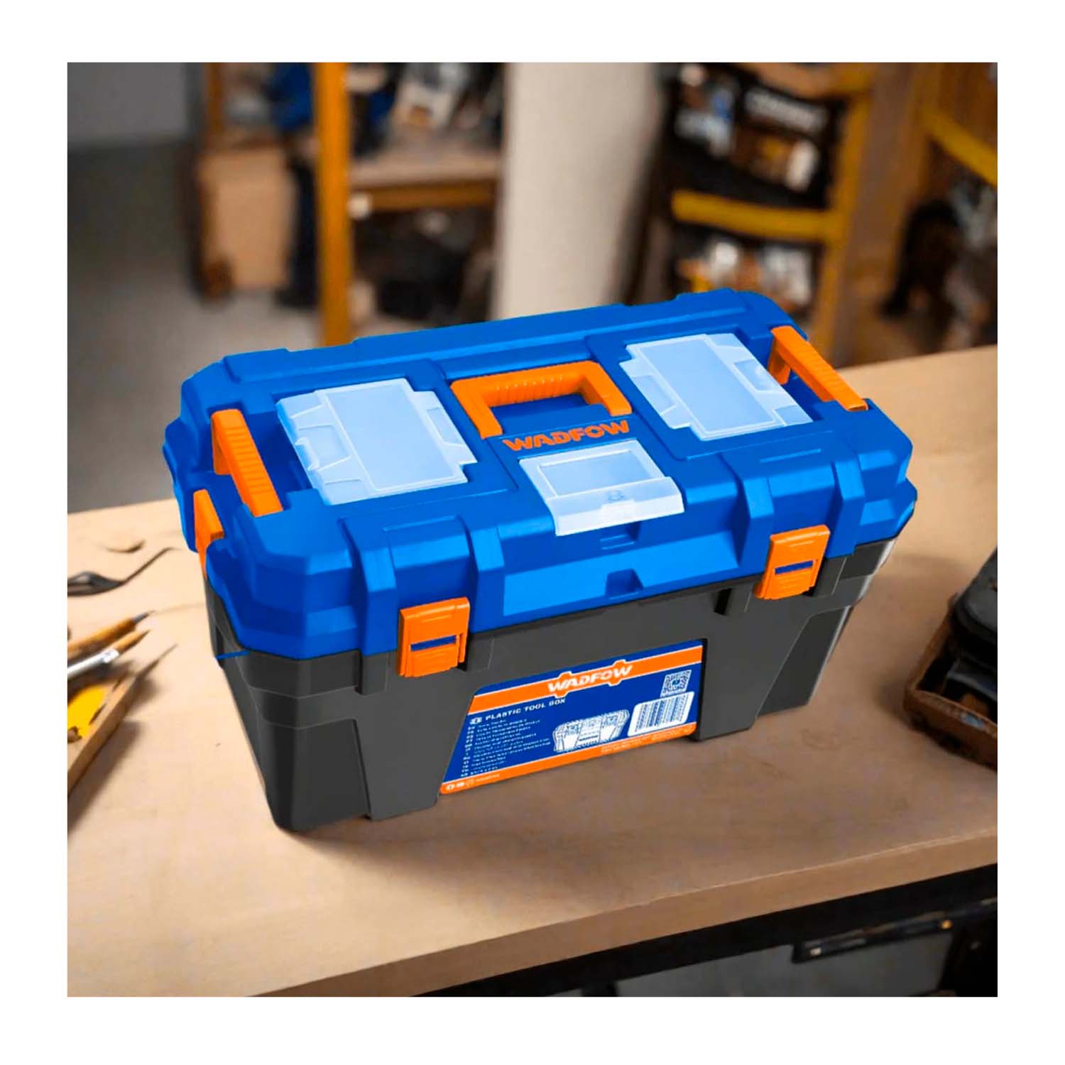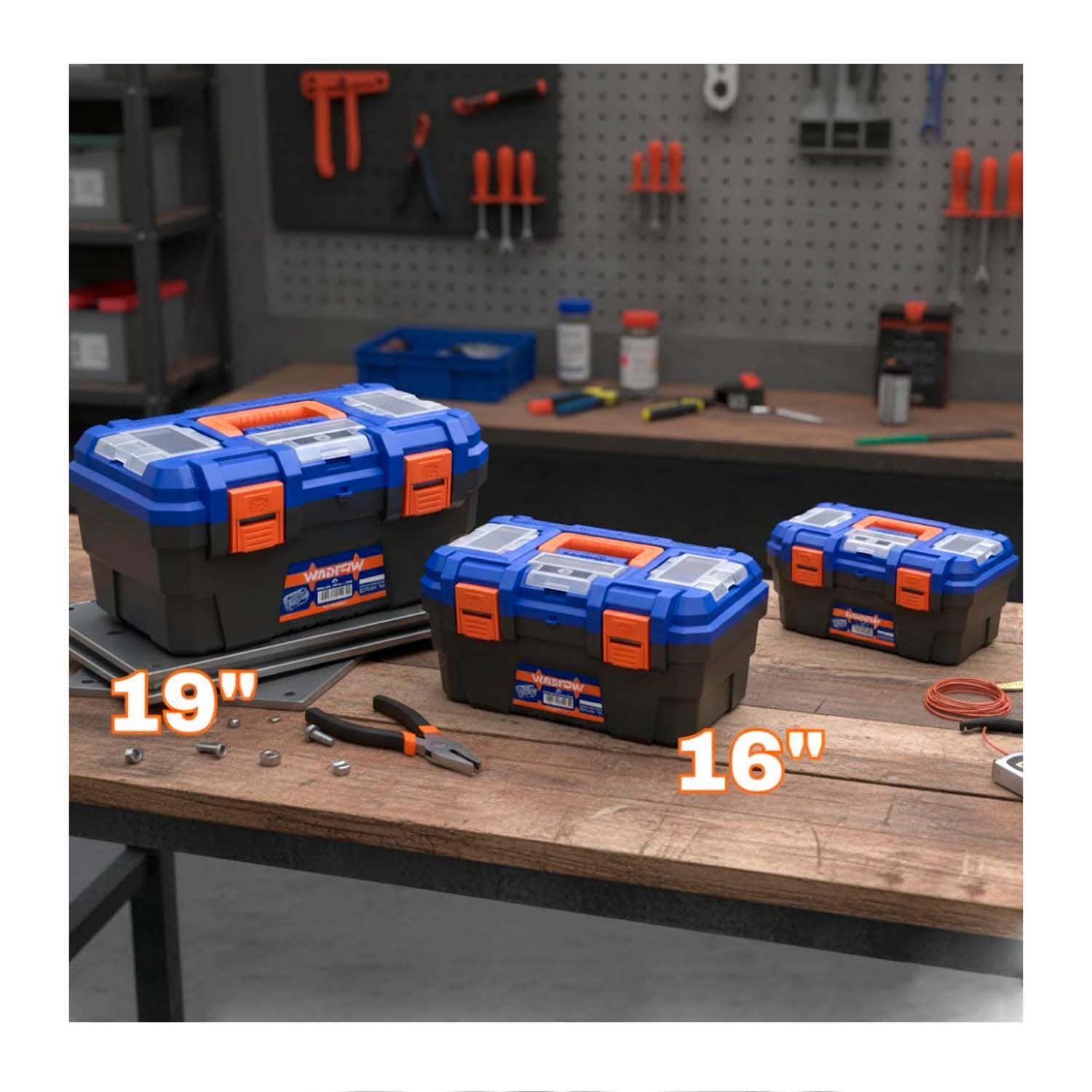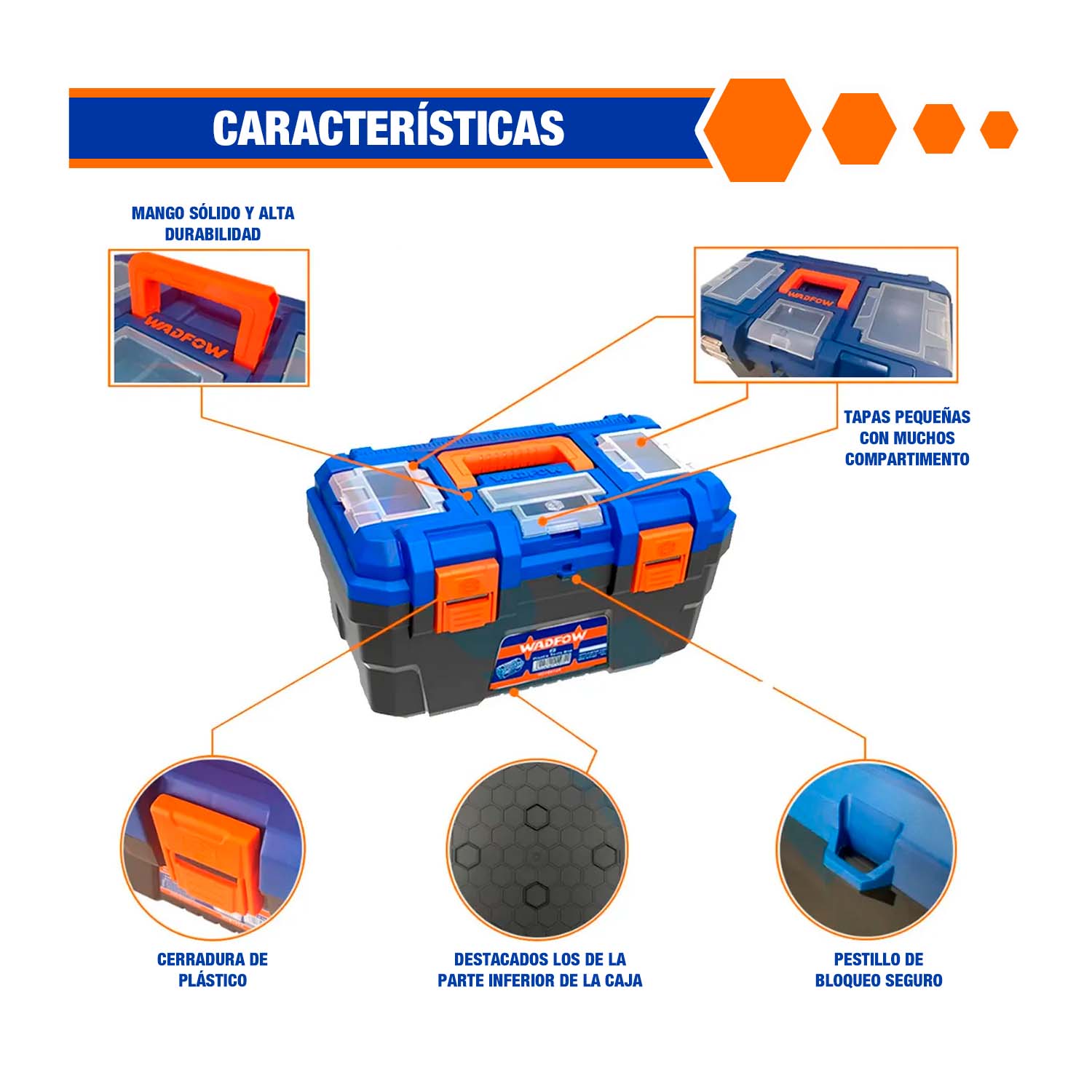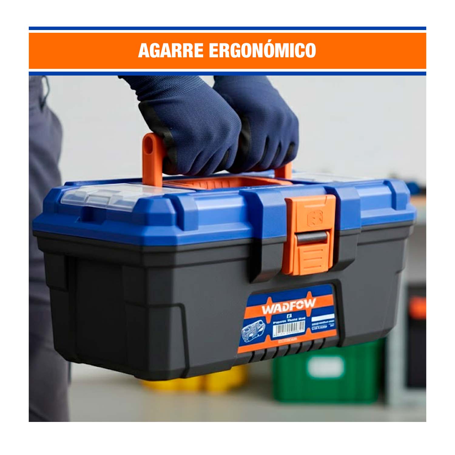 El Set de Caja de Herramientas 3 en 1 WADFOW incluye tres tamaños de cajas organizadoras (13", 16" y 19"), fabricadas en plástico PP resistente y equipadas con hebillas plásticas y asas de alta durabilidad. Cada caja cuenta con una cubierta superior con compartimentos para almacenamiento adicional y una bandeja interna para organización de piezas. Este conjunto está diseñado para facilitar el almacenamiento y transporte de herramientas, ideal para uso doméstico, talleres y proyectos de