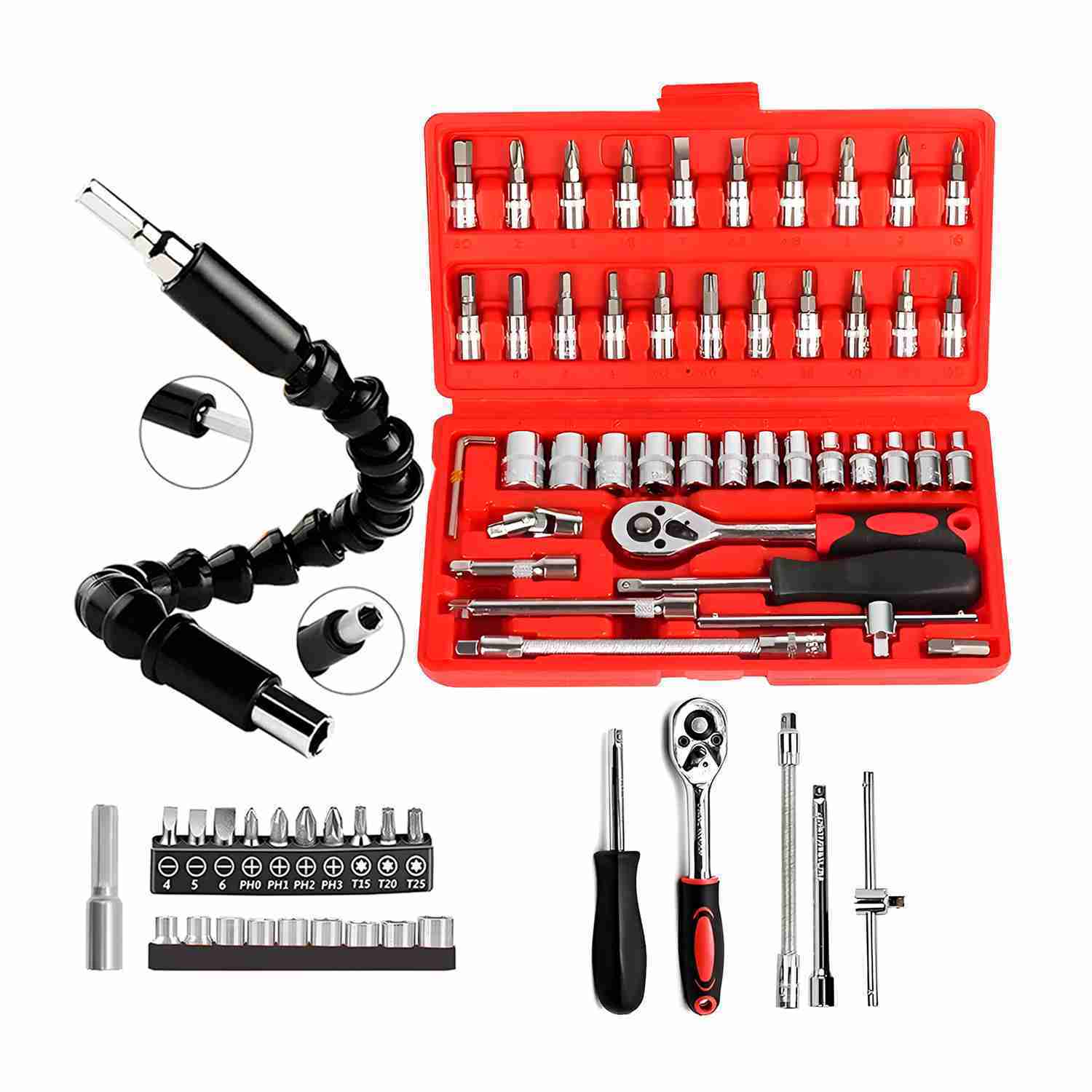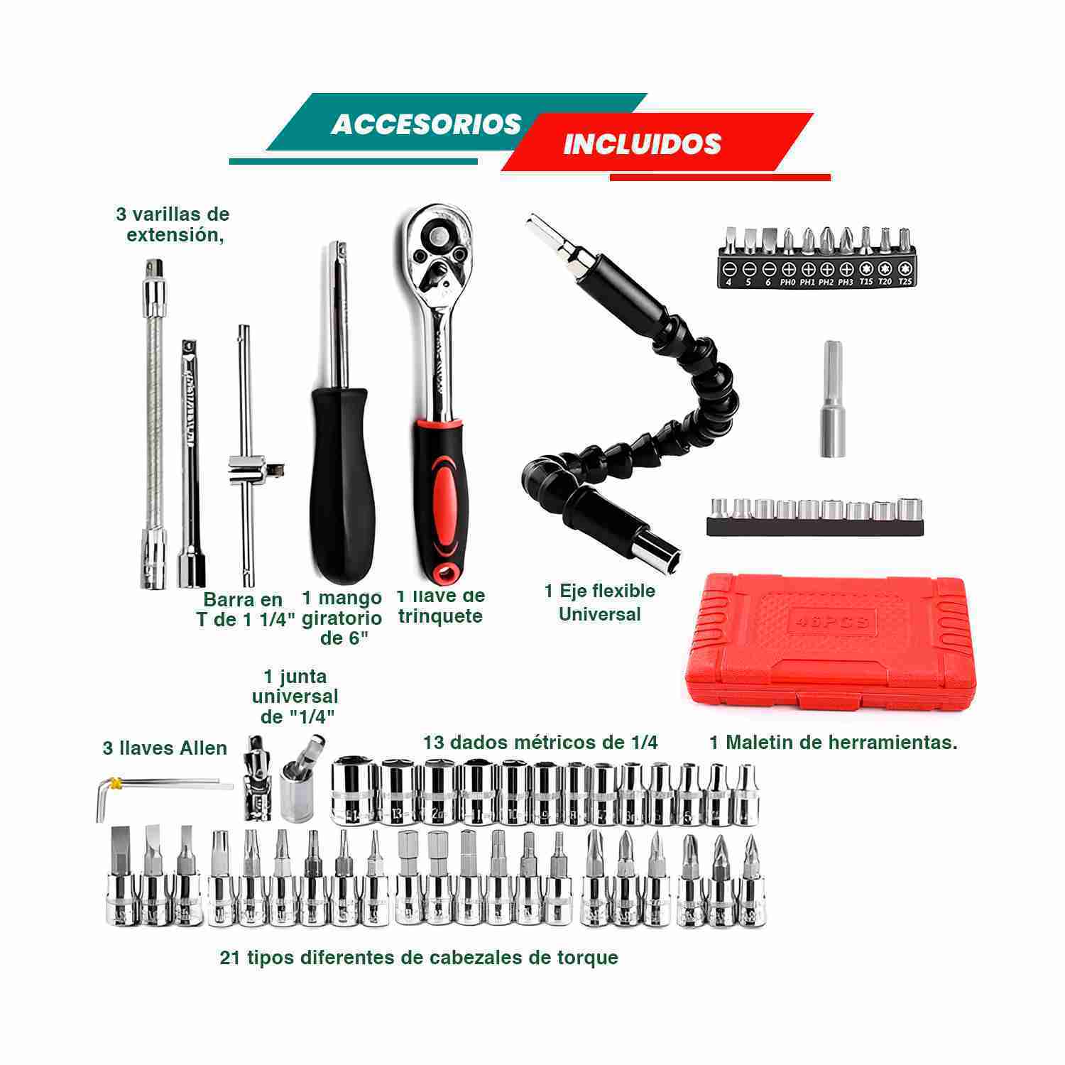 Este combo incluye un set mecánico de 46 piezas y un kit de 21 accesorios con extensor para taladro. Perfecto para reparaciones en casa, taller o vehículo.