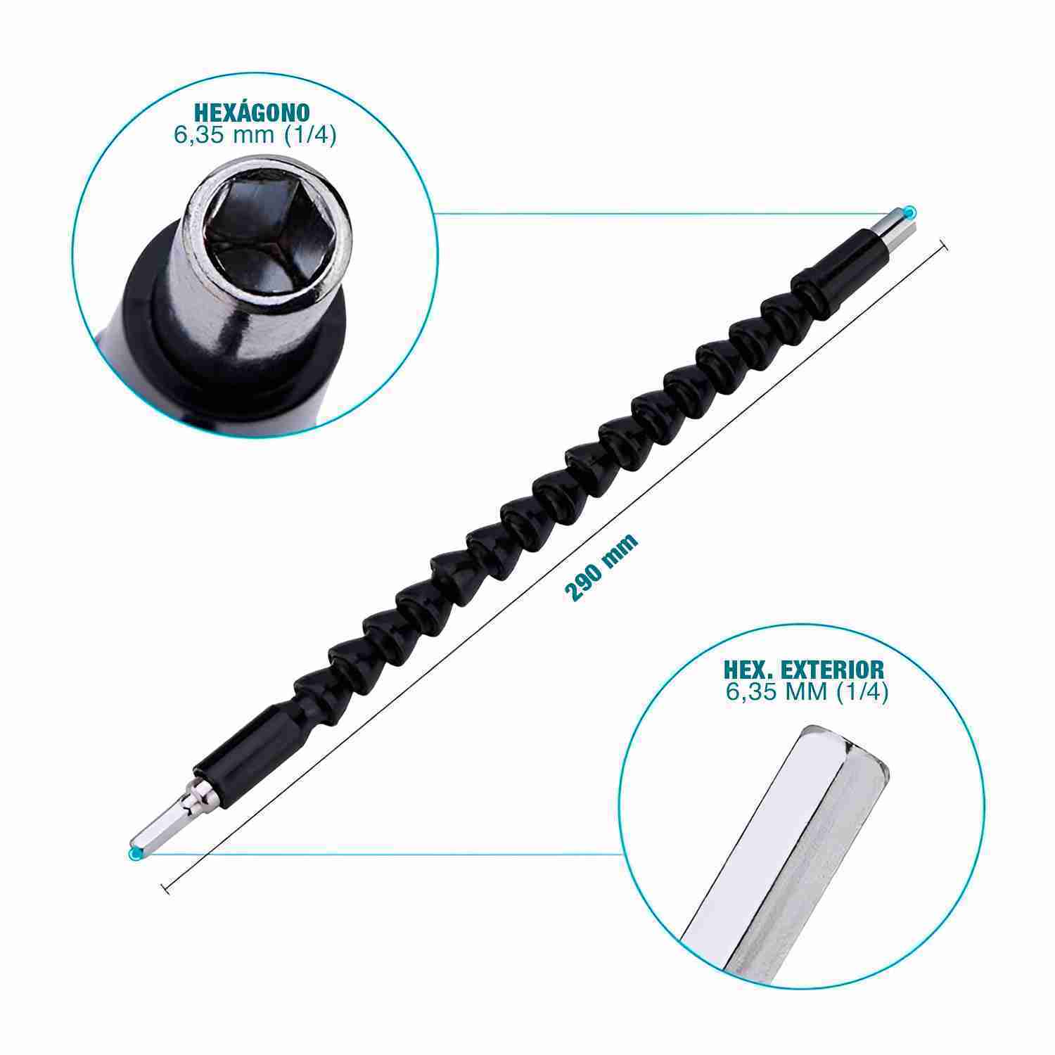 - 1 Eje flexible Universal (hexagonal), utilizado para Portabrocas de mano tipo eje cardán y destornillador eléctrico.