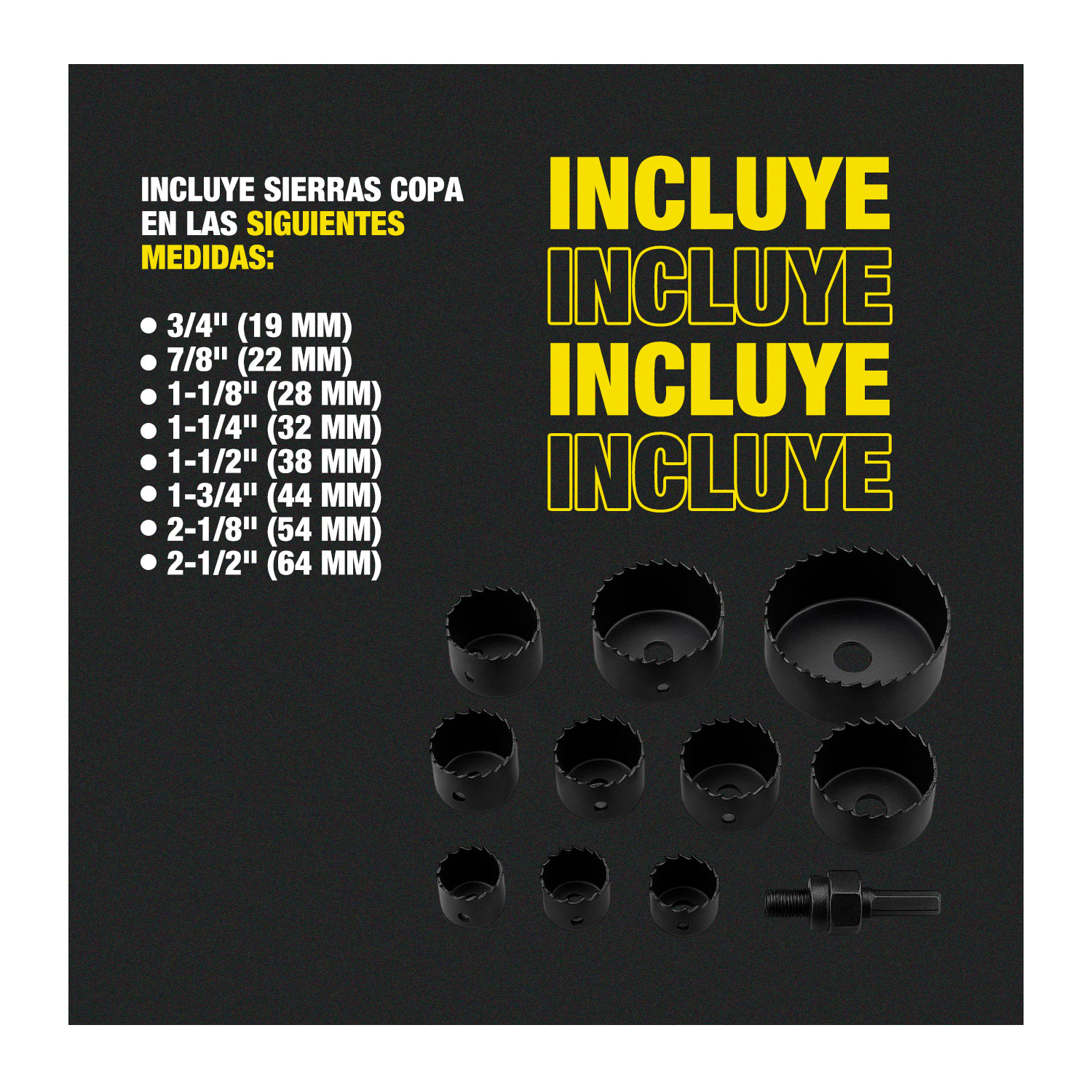 • Medidas de Sierras (19,22,29,32,38,44,51 y 64mm)
