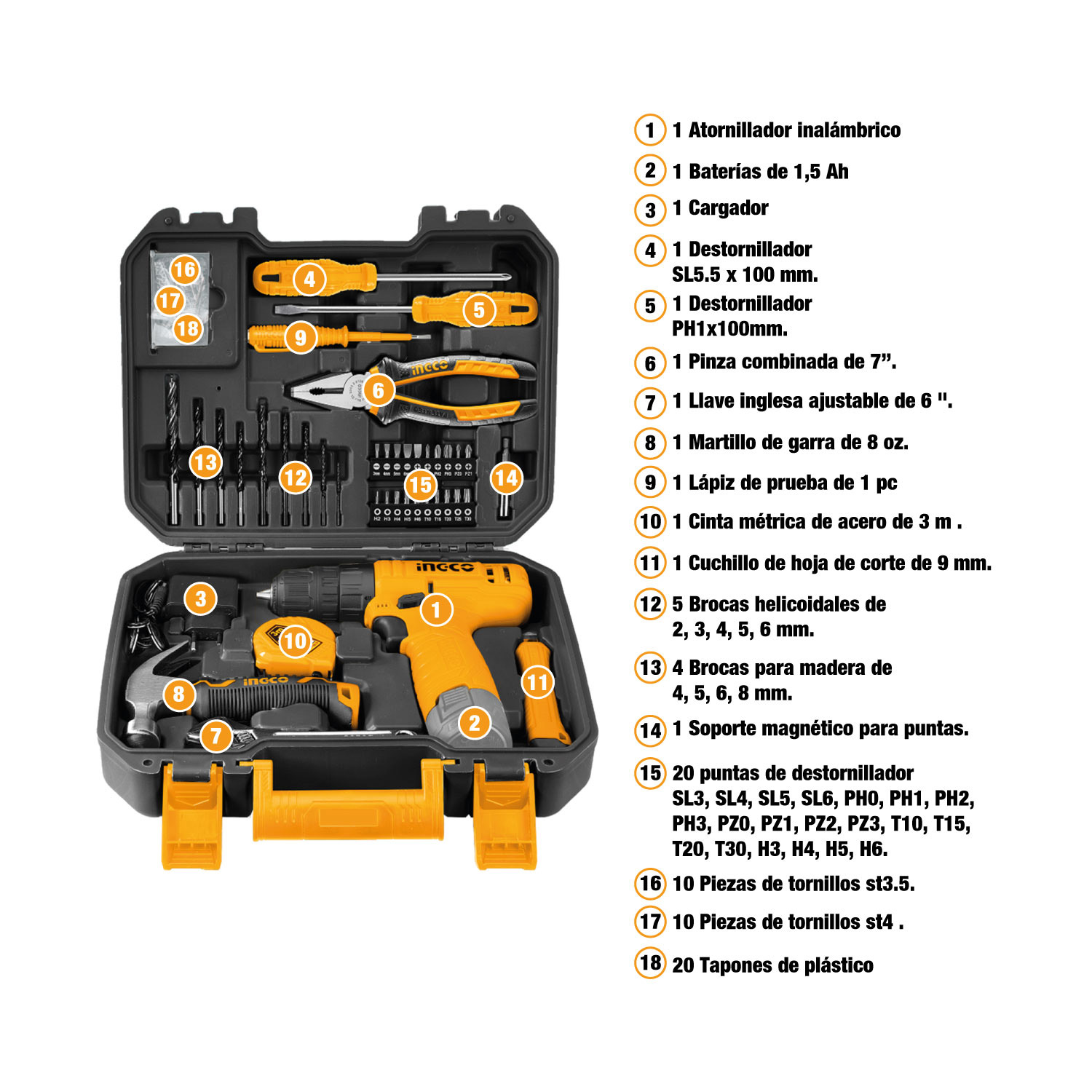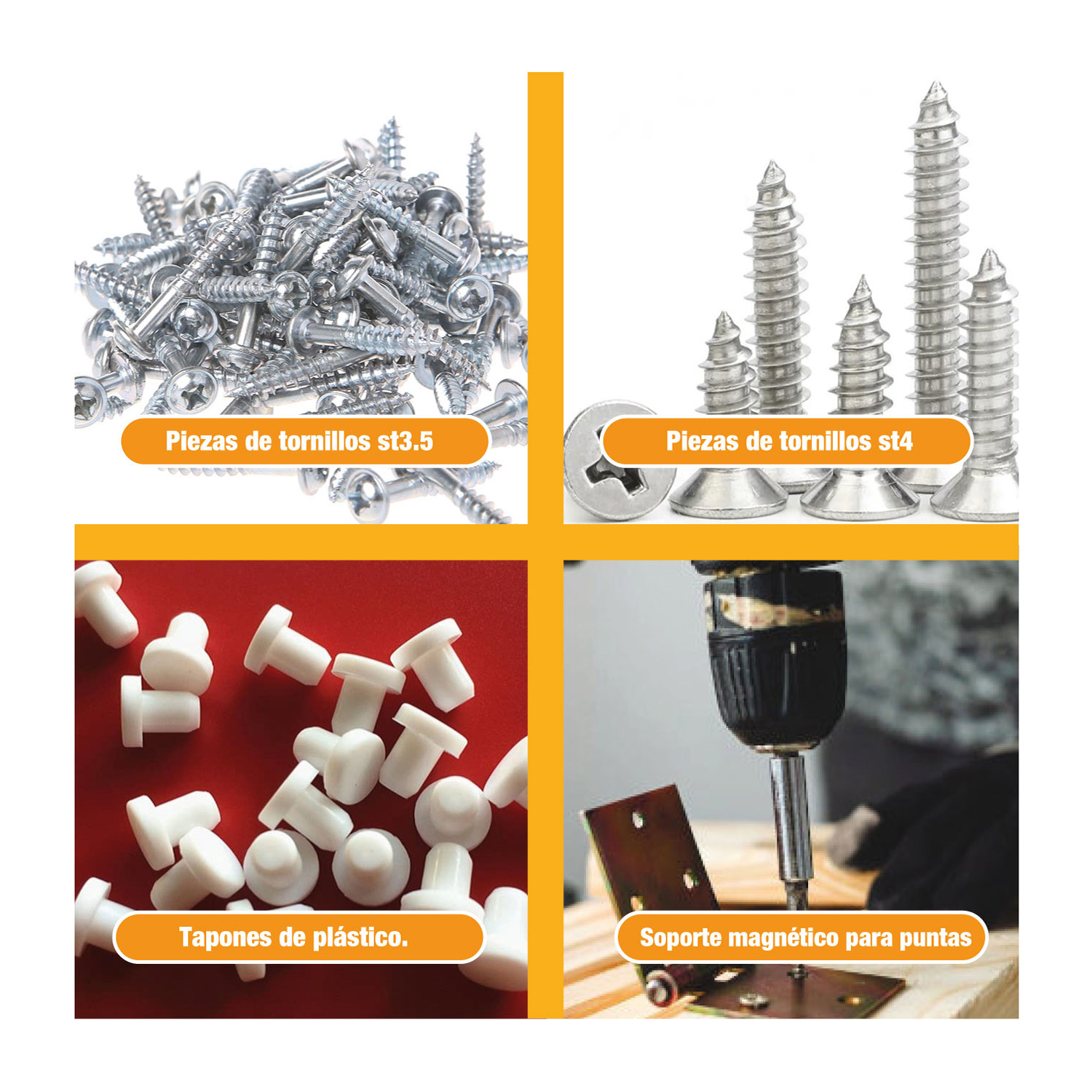 Este set integra desde herramientas manuales básicas hasta accesorios útiles para diferentes aplicaciones, lo que lo convierte en una solución versátil tanto para el hogar como para el uso profesional.