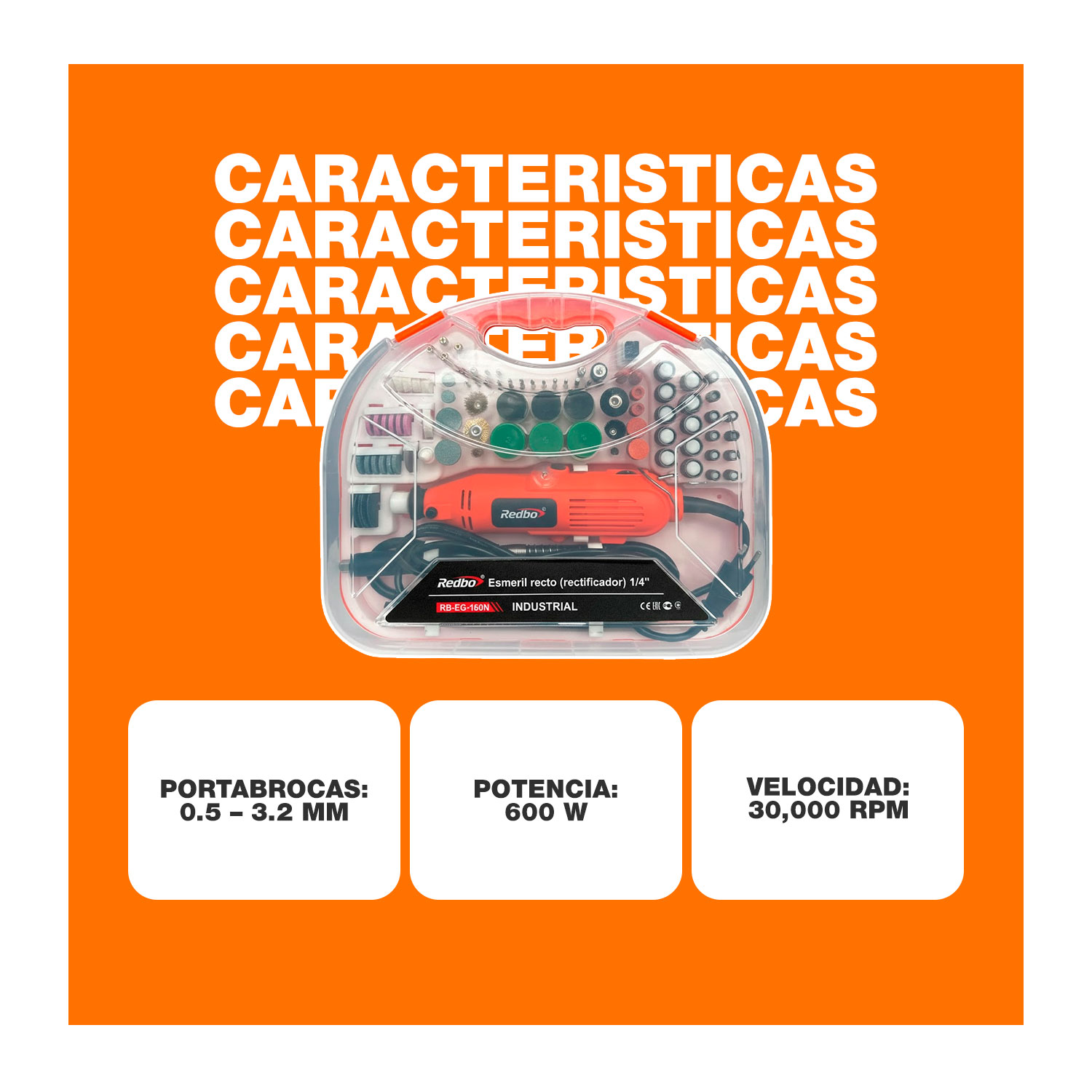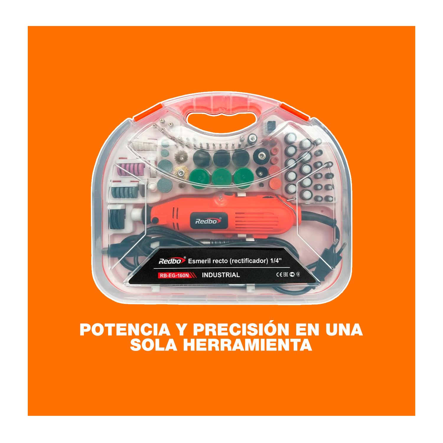 El esmeril recto (rectificador) RB-EG-160N de Redbo es una herramienta eléctrica multipropósito diseñada para trabajos de precisión como lijado, pulido, corte, grabado y desbaste en diversos materiales como metal, madera y plástico. Destaca por su diseño compacto y ergonómico que permite un manejo cómodo y mayor control en tareas detalladas, además de su alta velocidad de rotación que garantiza acabados profesionales. Incluye un completo kit de accesorios que amplía su versatilidad y lo convierte en una solución ideal tanto para uso profesional como para bricolaje, ofreciendo eficiencia, precisión y rendimiento en cada aplicación