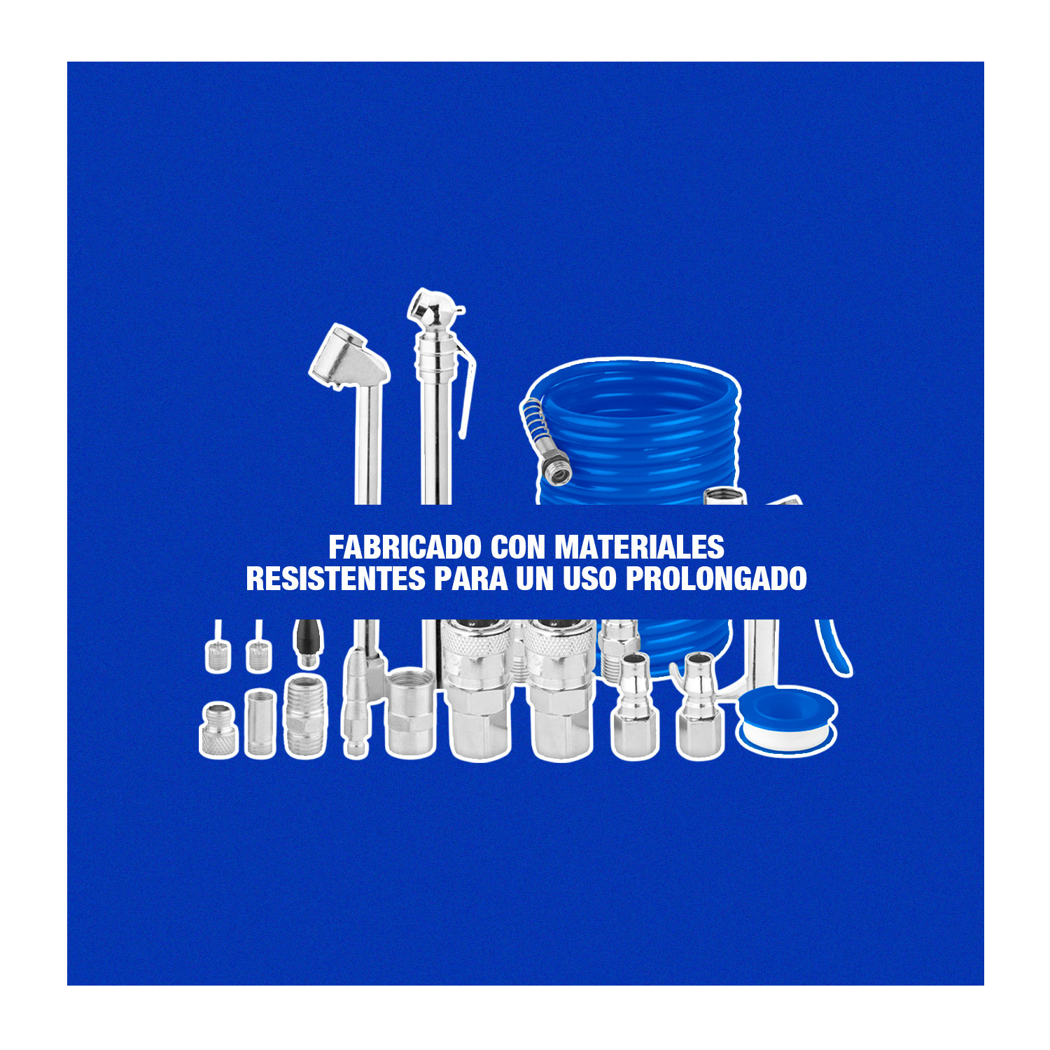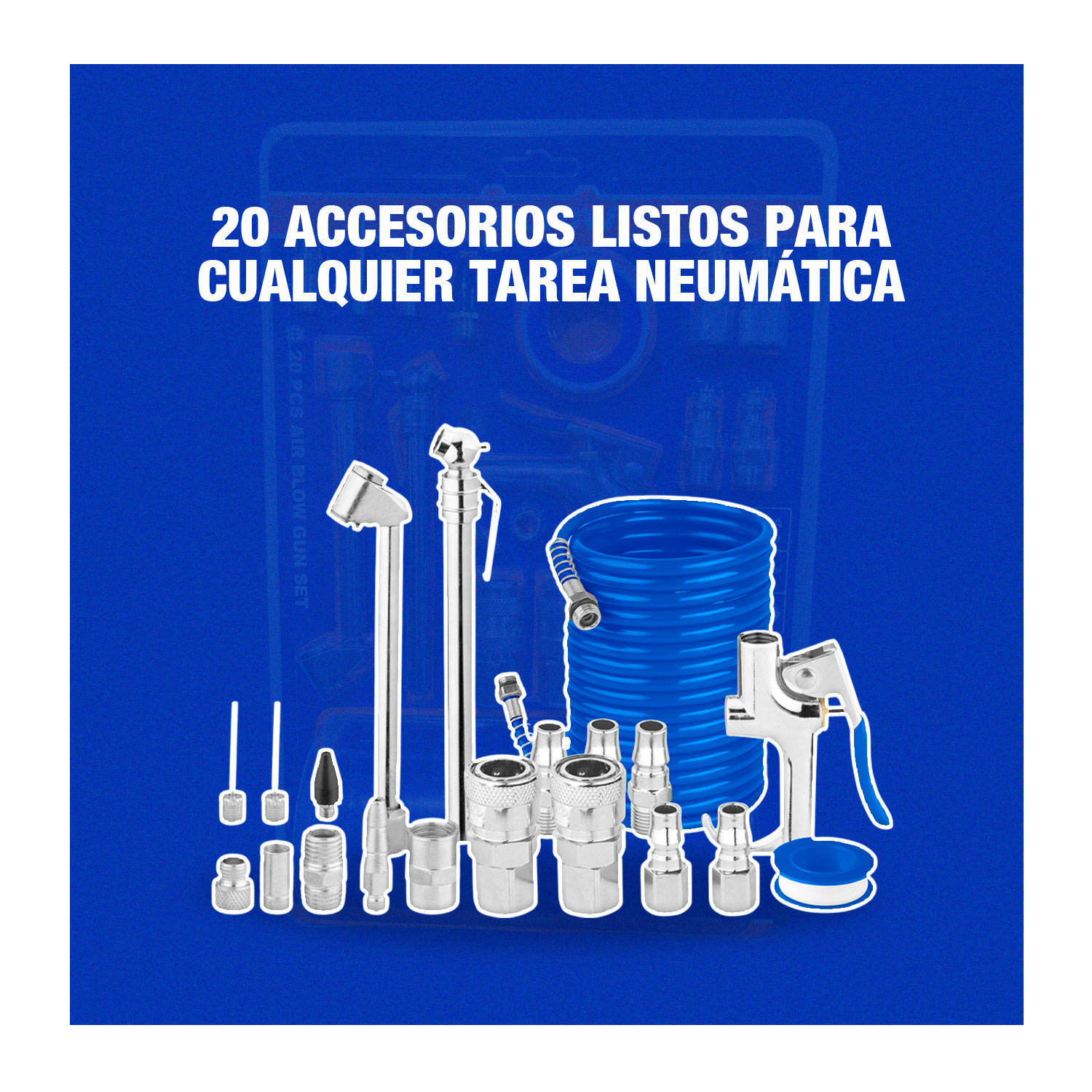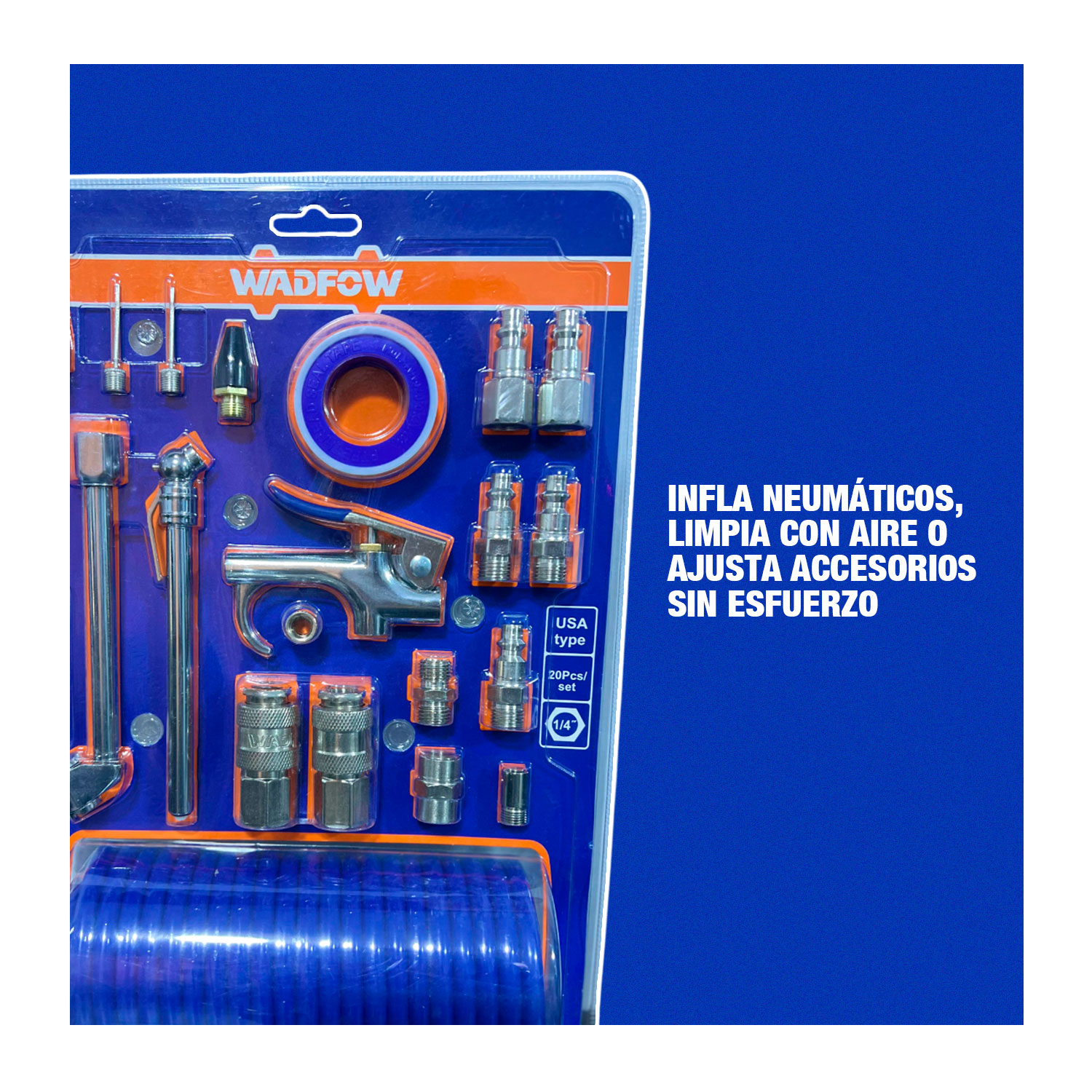 El WQP9431 es un kit de boquillas y accesorios de aire comprimido de 20 piezas, diseñado para sistemas neumáticos con conectores rápidos de 1/4″ (tipo americano), perfecto para inflado, soplado y trabajos generales con aire comprimido