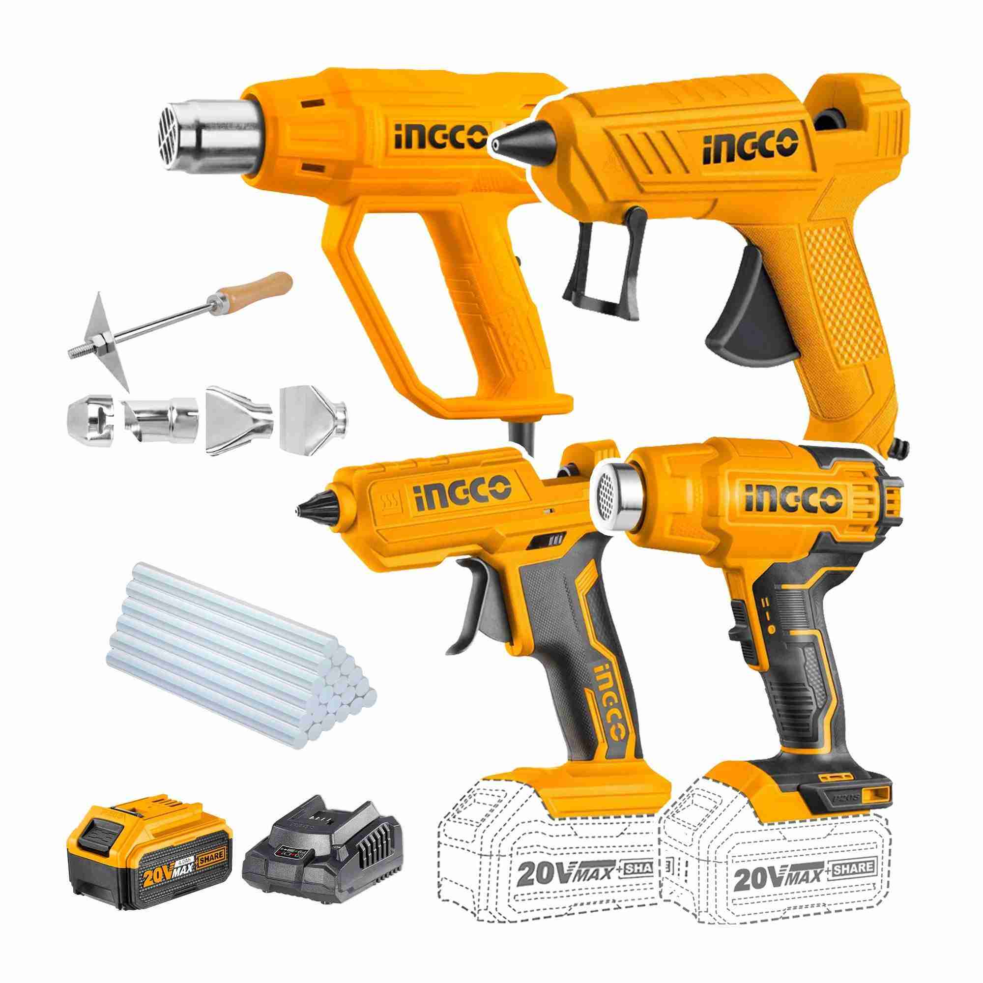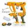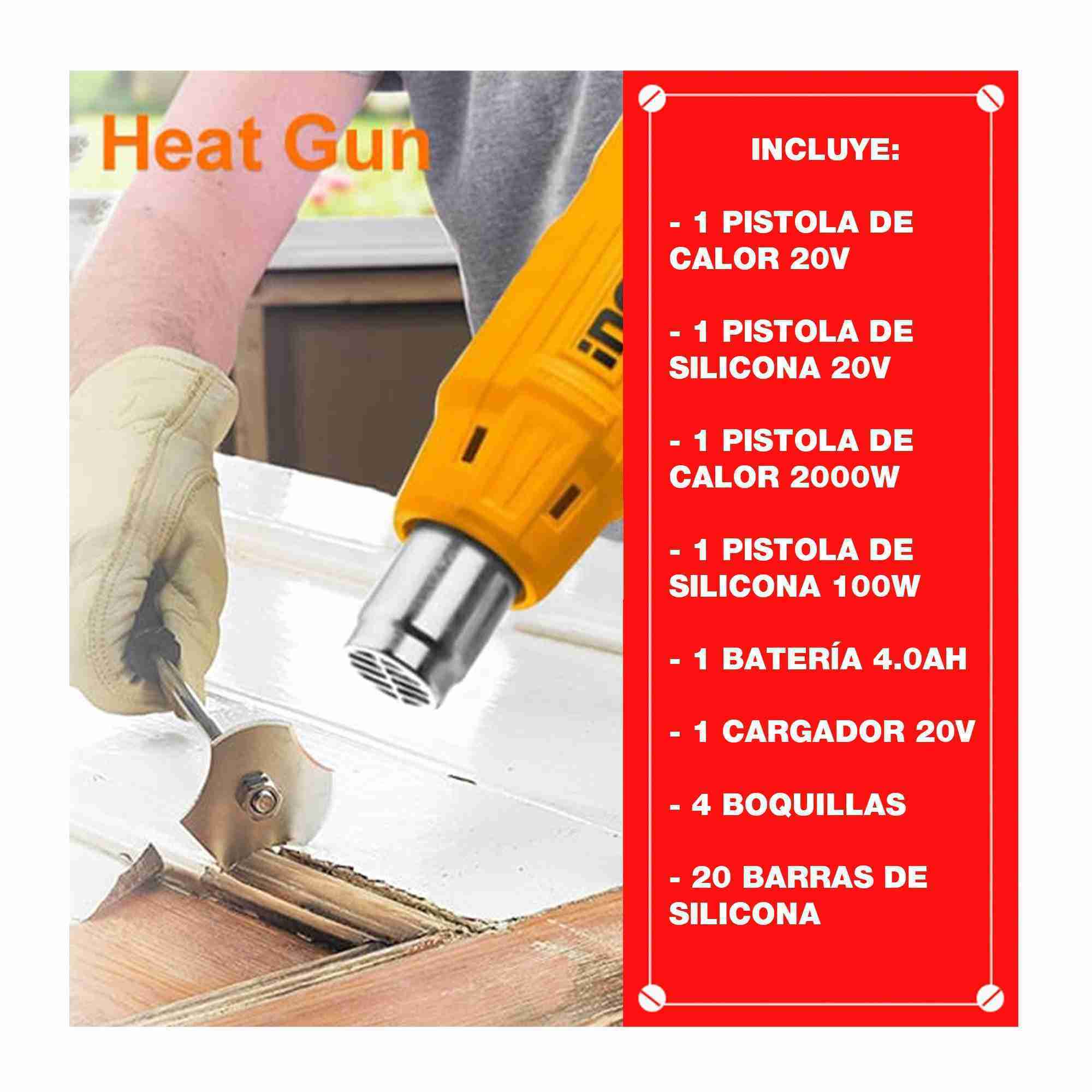 ESTE COMBO COMPLETO INCLUYE: 1 PISTOLA DE CALOR ELÉCTRICA DE 2000W, 1 PISTOLA DE SILICONA 100W; 1 PISTOLA DE CALOR 20V; 1 PISTOLA DE SILICONA 20V; 4 BOQUILLAS ; 20 BARRAS DE SILICONA; 1 BATERÍA 4.0AH; 1 CARGADOR RÁPIDO.