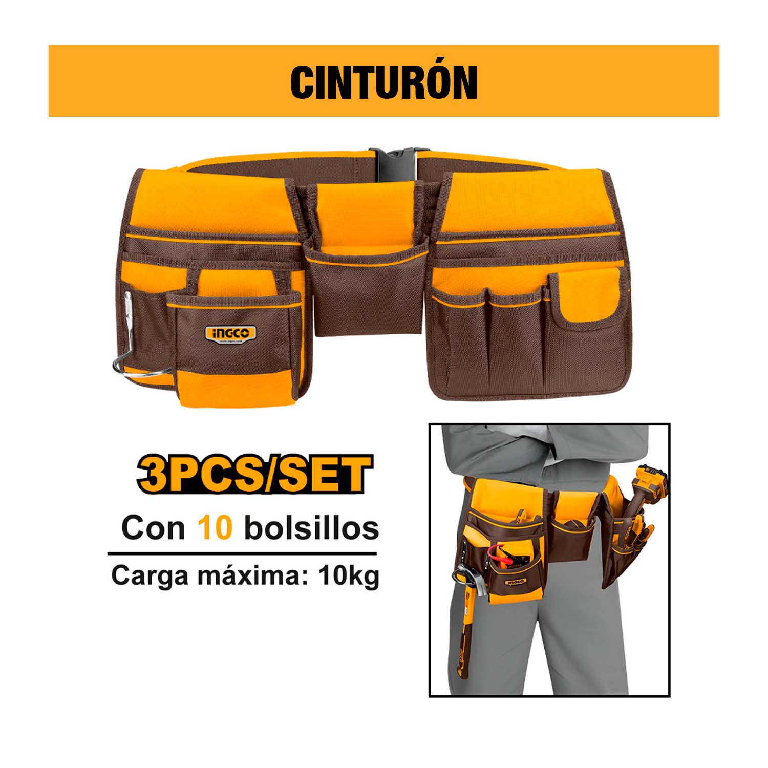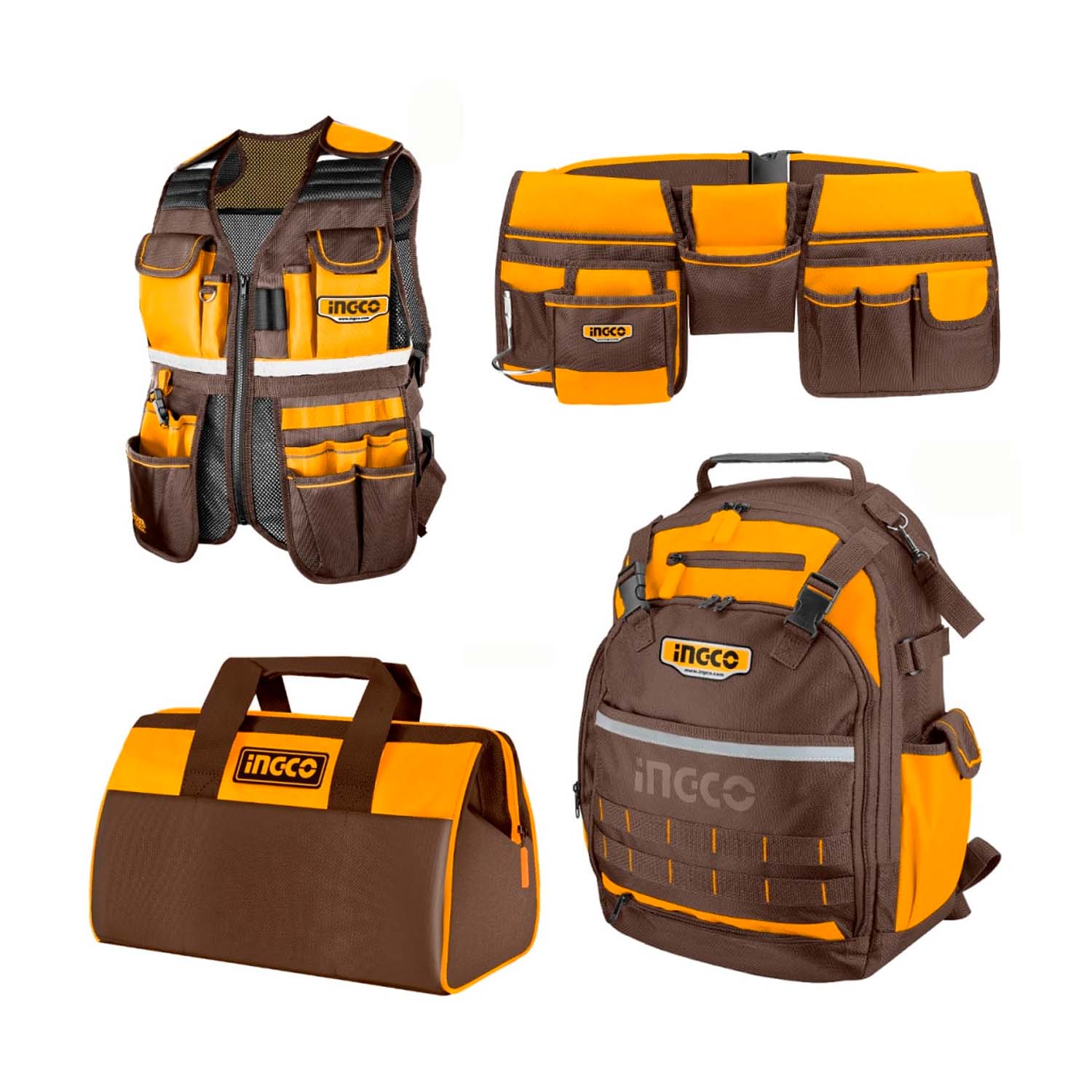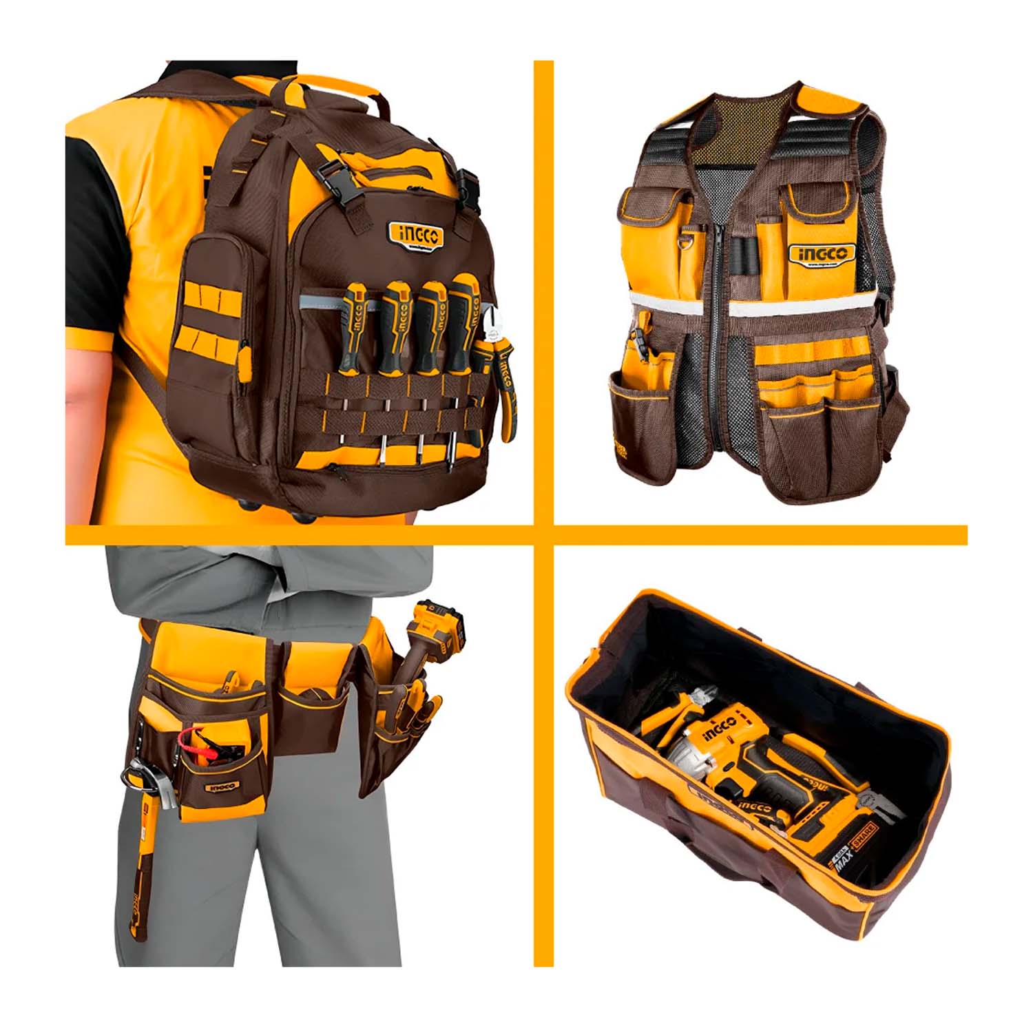 FICHA TÉCNICA: KIT 4 PORTA HERRAMIENTAS INGCO CHALECO + MOCHILA + BOLSO + CINTURÓN COS230908