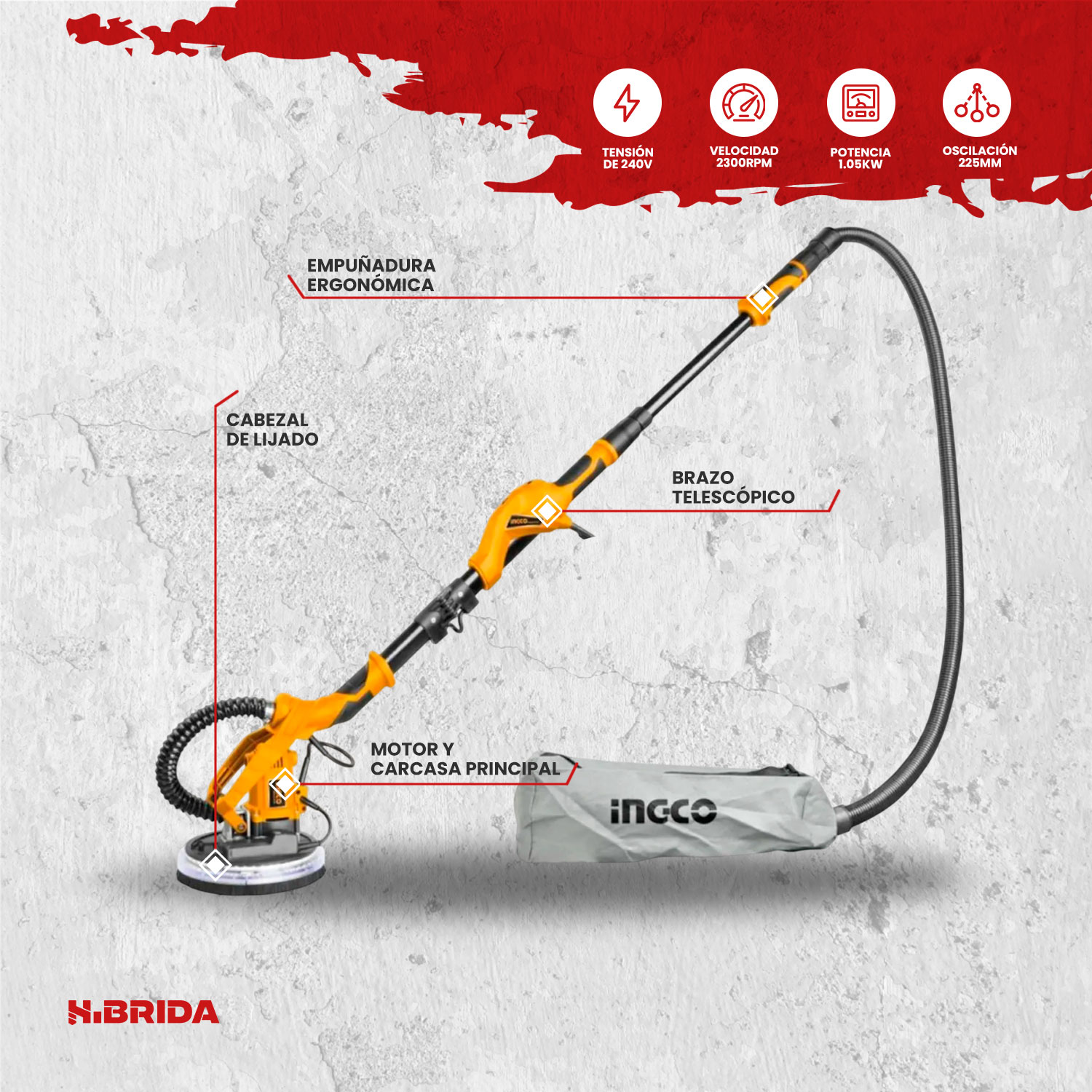 La INGCO DWS10501 es una lijadora telescópica de alto rendimiento diseñada específicamente para acabados en paredes de drywall, techos y superficies de yeso. Con un potente motor de 1050W y velocidad ajustable, permite un lijado eficiente y uniforme, mientras que su anillo de luz LED integrado facilita la detección de imperfecciones en tiempo real. Su diseño ergonómico incluye un sistema de succión automática que dirige el residuo hacia una bolsa recolectora, garantizando un entorno de trabajo más limpio y reduciendo el esfuerzo físico en jornadas prolongadas.