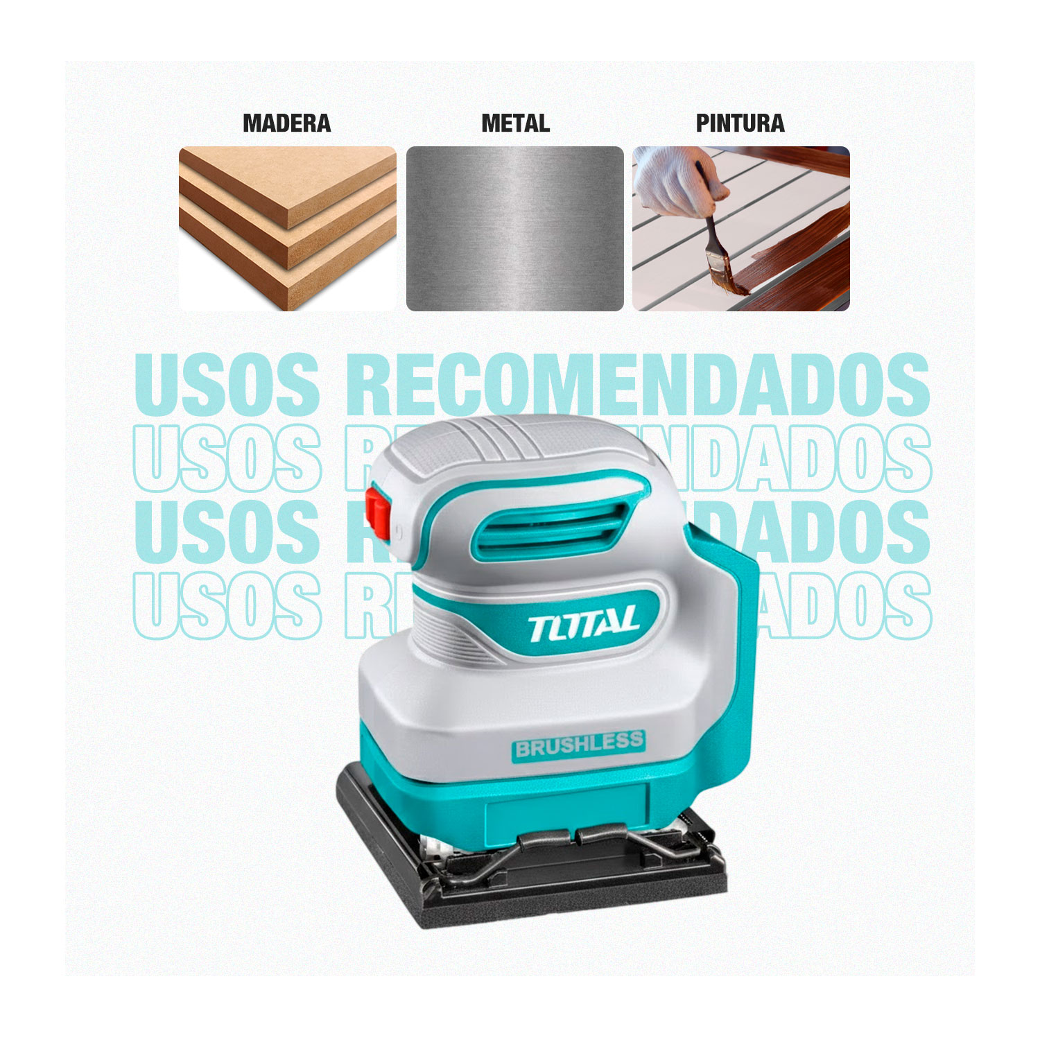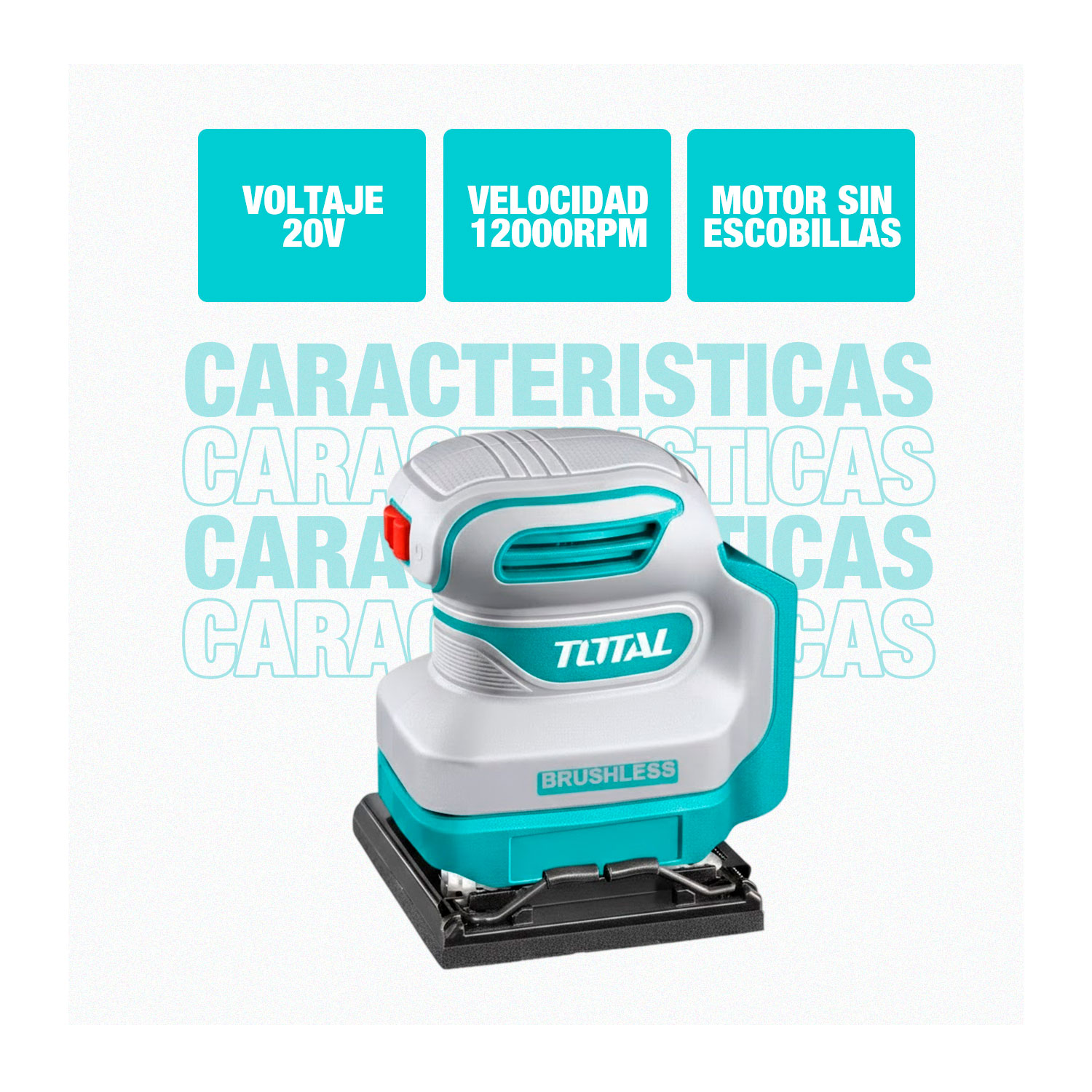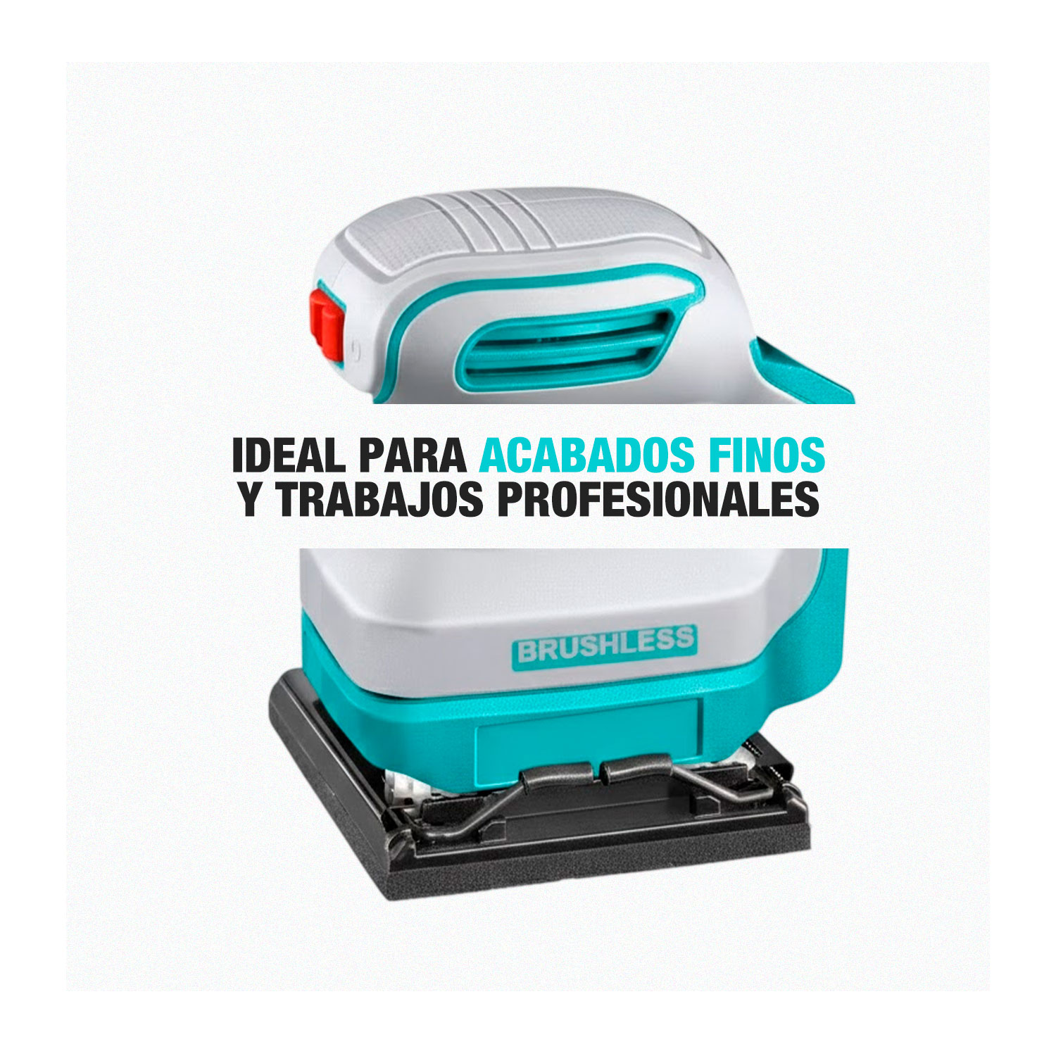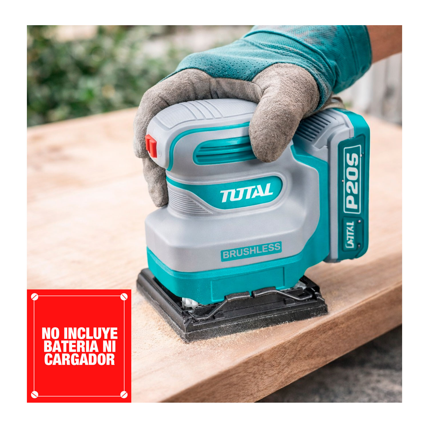 Es una herramienta de acabado portátil diseñada para ofrecer lijado rápido y uniforme en superficies de madera, metal y plástico sin la molestia de cables. Funciona con baterías de la serie 20 V de Total Tools, lo que proporciona una autonomía razonable para tareas de carpintería, bricolaje o mantenimiento general. Su base de lijado de aproximadamente 110 × 100 mm y su alta velocidad sin carga alrededor de 12 000 rpm permiten un lijado eficiente y consistente, mientras que su diseño ergonómico con empuñadura antideslizante facilita el manejo prolongado y cómodo. La herramienta es compacta y liviana, ideal para trabajar en espacios reducidos o con una sola mano, y suele venir acompañada de varios papeles de lija para comenzar a usarla inmediatamente (aunque la batería y el cargador normalmente se venden por separado).