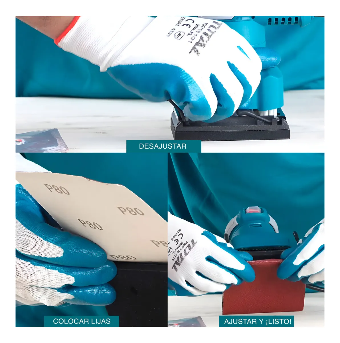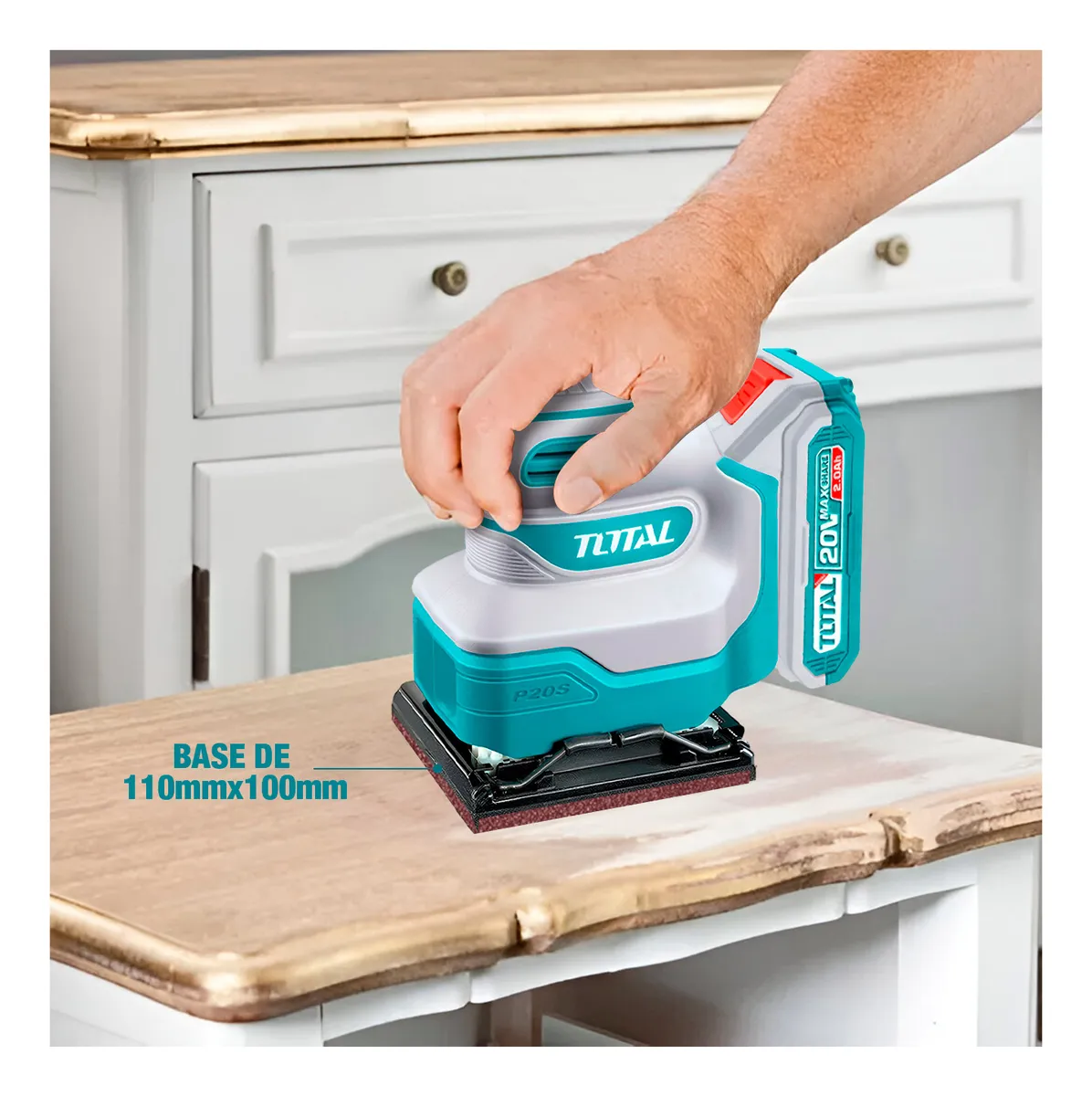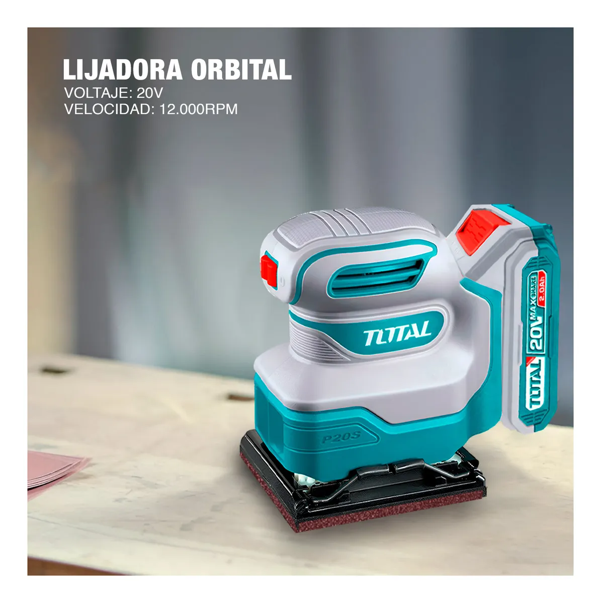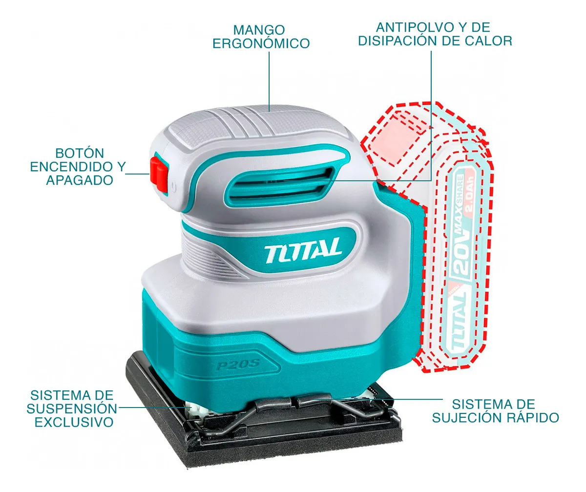 ESTE COMBO COMPLETO INCLUYE: 1 LIJADORA PALMA 20V TOTAL; 1 BATERÍA 20V 2.0AH; 1 CARGADOR 20V; 9 PZAS DE LLAVES EXAGONAL TIPO L.