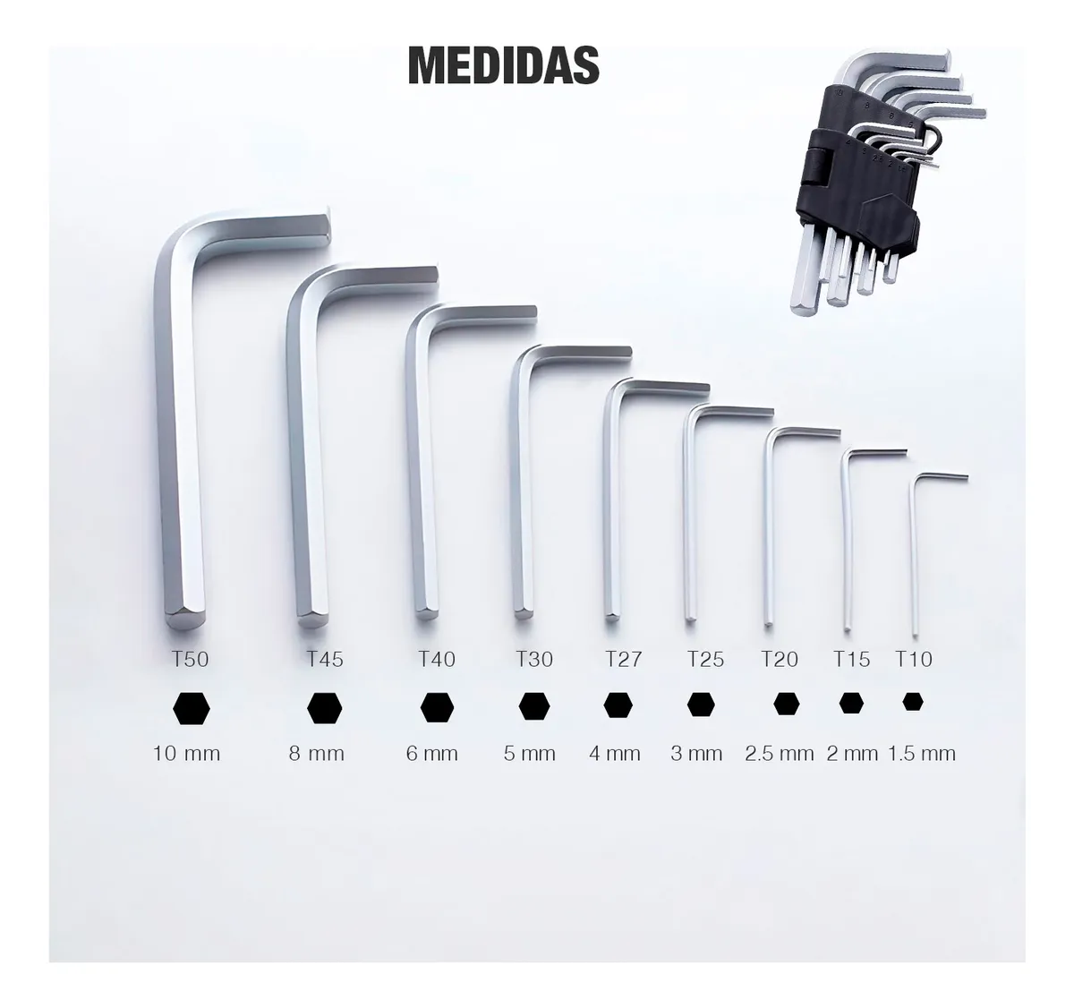 -Tamaño de llave hexagonal métrica de 9 piezas: 1. 0.197 in, 0.079 in, 2. 0.197 in, 0.118 in, 0.157 in, 0.197 in, 0.236 in, 0.315 in, 0.394 in.