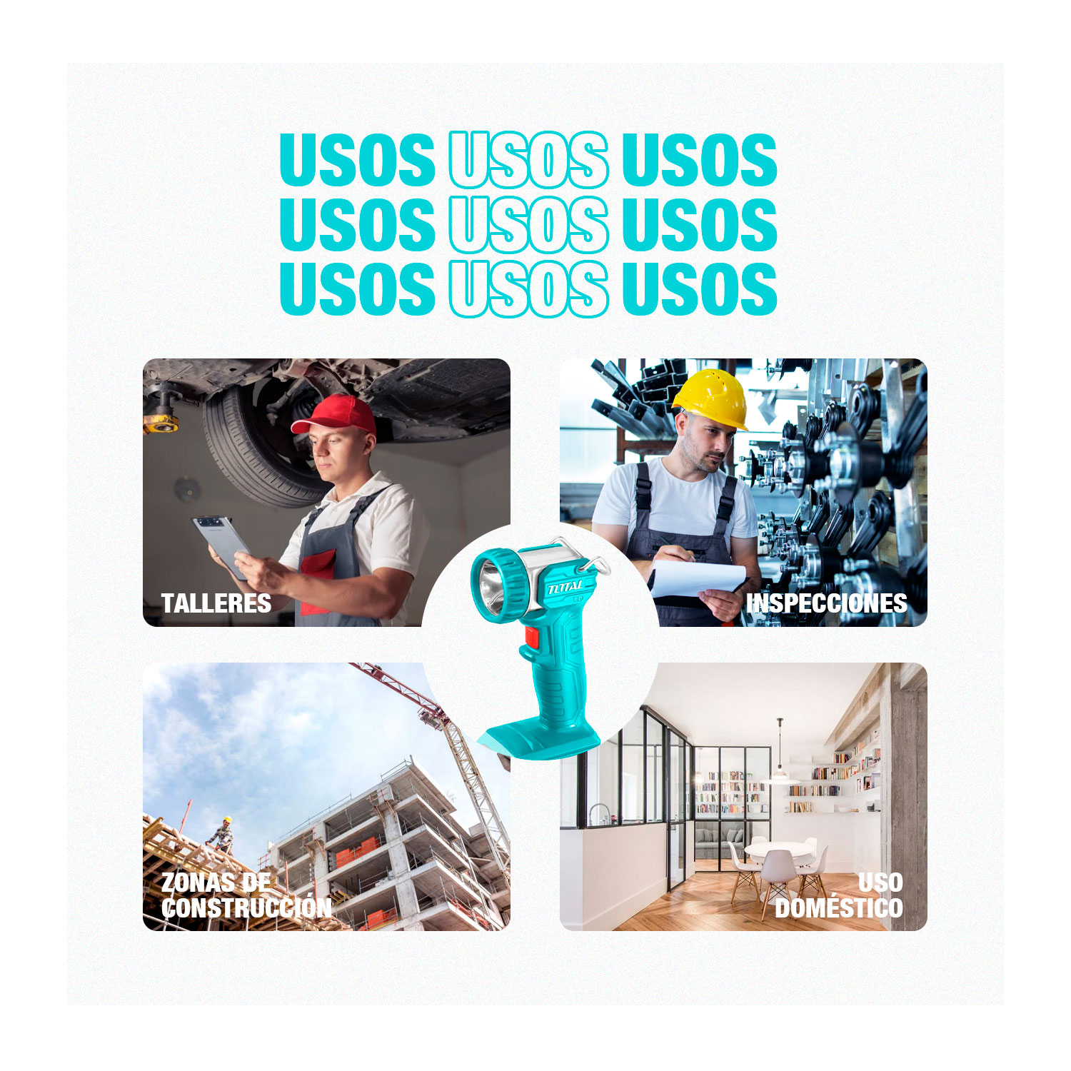 La linterna inalámbrica TOTAL TWLI2038 es una herramienta práctica y potente diseñada para ofrecer una iluminación brillante y precisa en cualquier entorno. Funciona con baterías de 20V del sistema Total Share, lo que permite usar la misma batería en múltiples herramientas de la marca. Su diseño ergonómico y liviano facilita el agarre y transporte, mientras que su cabezal ajustable permite dirigir la luz donde se necesite. Ideal para trabajos en talleres, reparaciones, actividades al aire libre o situaciones de emergencia.