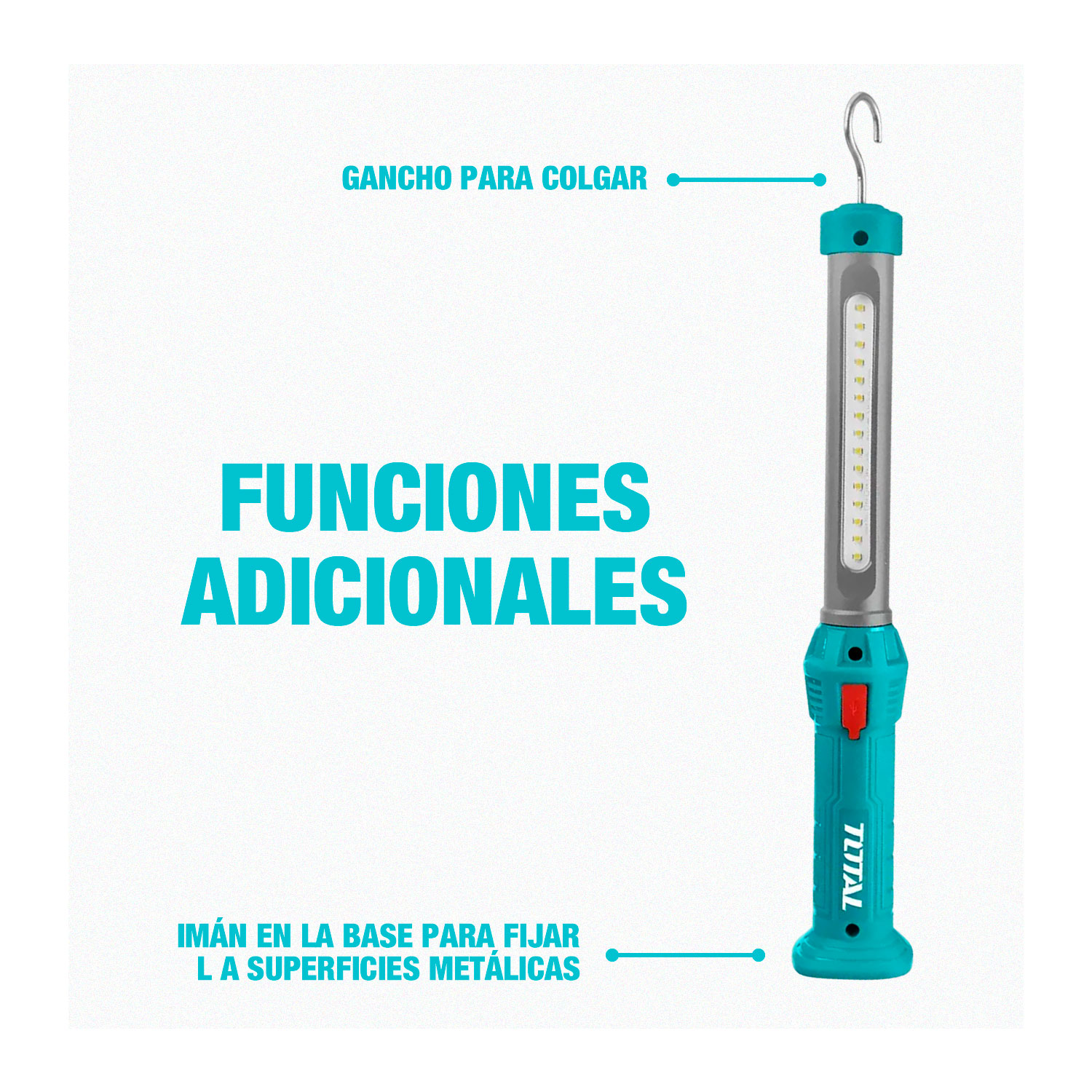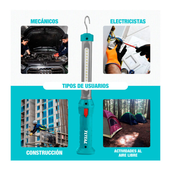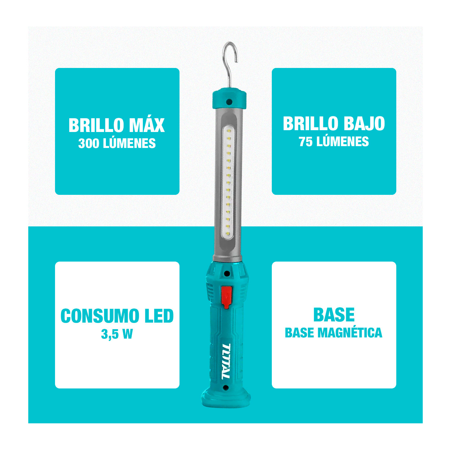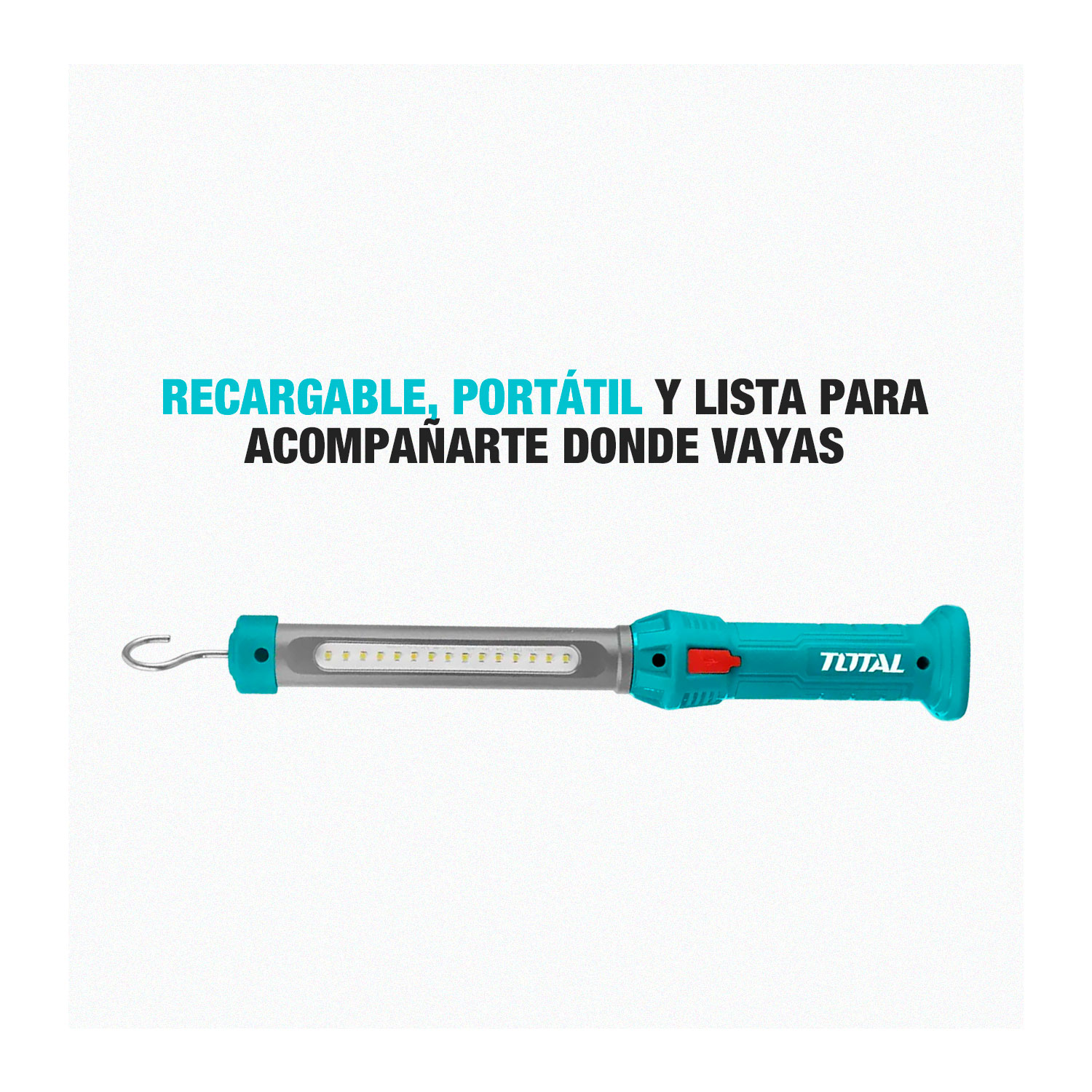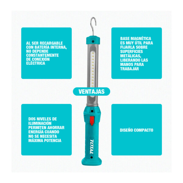 La lámpara recargable LED TWLI35261 es una herramienta práctica y versátil, ideal para trabajos de taller, emergencias o uso doméstico. Con una potencia de 300 lúmenes y batería de litio recargable de 3.6V, ofrece una iluminación potente y estable por hasta 4 horas continuas, cargándose fácilmente mediante puerto USB. Su diseño portátil y ligero la hace cómoda de llevar y manipular, siendo una excelente opción para quienes necesitan una luz confiable y duradera en cualquier situación.