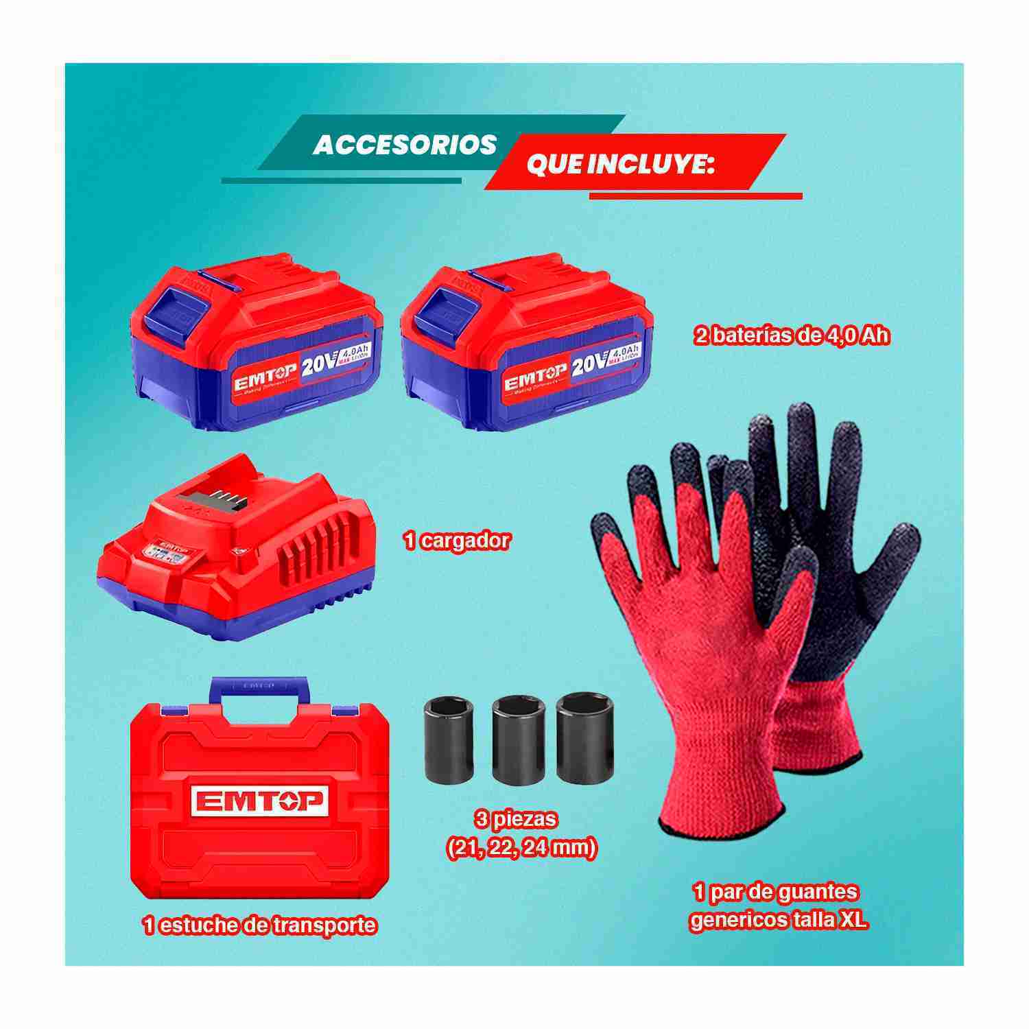 ESTE COMBO ENTERO INCLUYE; 1 ATORNILLADOR DE IMPACTO; 2 BATERÍAS 4.0AH; 1 CARGADOR 20V; 1 MALETIN; 1 PAR DE GUANTES XL; DADOS.
