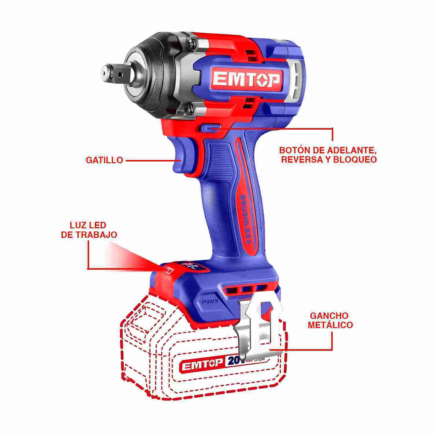 Se trata de una pistola de impacto muy ligera que funciona a batería, alcanzando un voltaje de 20V y un par de apriete máximo de 500 Nm. Posee un motor Brushless, es decir, no posee escobillas, por lo que el mantenimiento será menor y otorgará una vida útil mayor.