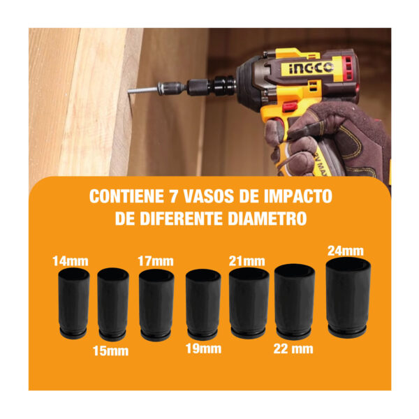 -7 llaves de vaso (14, 15, 17, 19, 21, 22 y 24 mm).