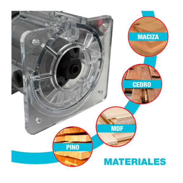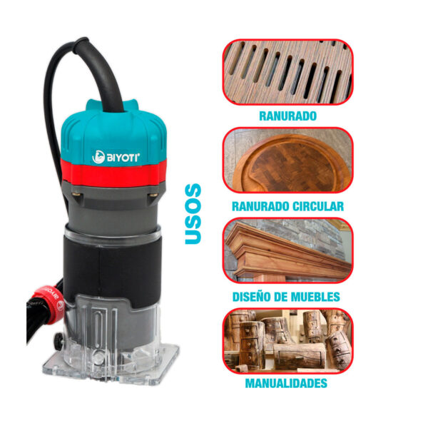 El modelo BYT-WT370 es una ruteadora compacta y práctica, diseñada para realizar cortes y acabados de precisión en trabajos de carpintería y bricolaje. Su diseño ligero y ergonómico permite un manejo cómodo, incluso en sesiones prolongadas, ofreciendo un control estable y seguro en todo momento. Es ideal para tareas como rebajes, ranurados, biselados, cortes decorativos y ajustes en piezas de madera, MDF o aglomerado, logrando terminaciones limpias y profesionales.
