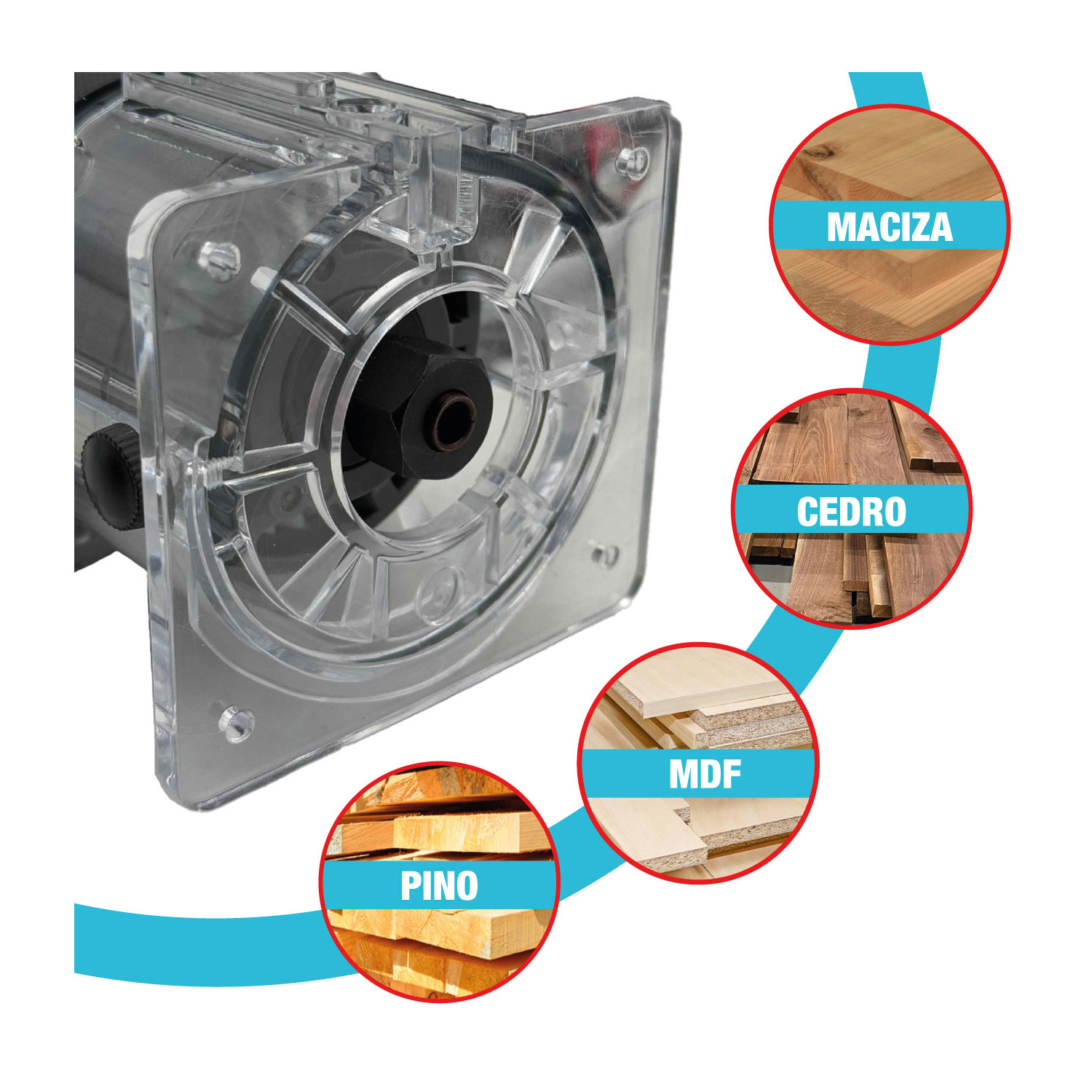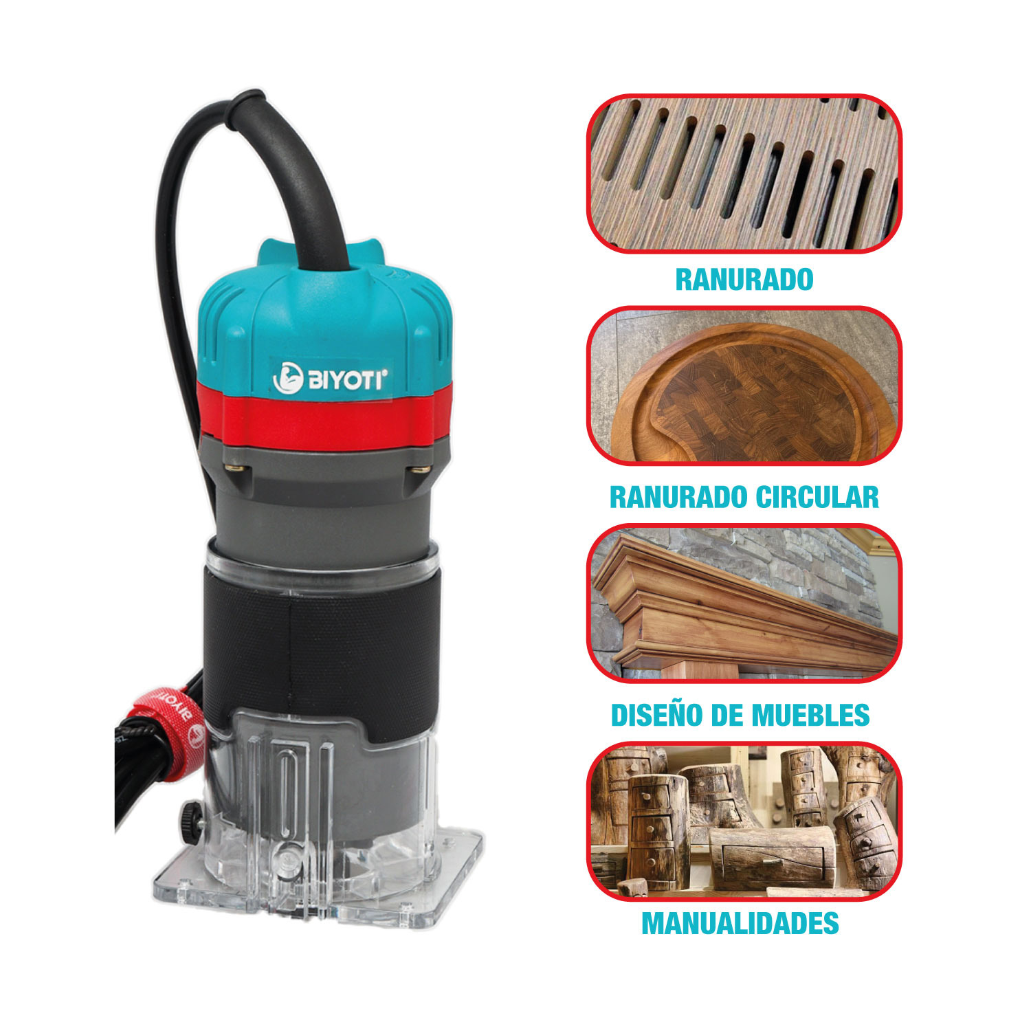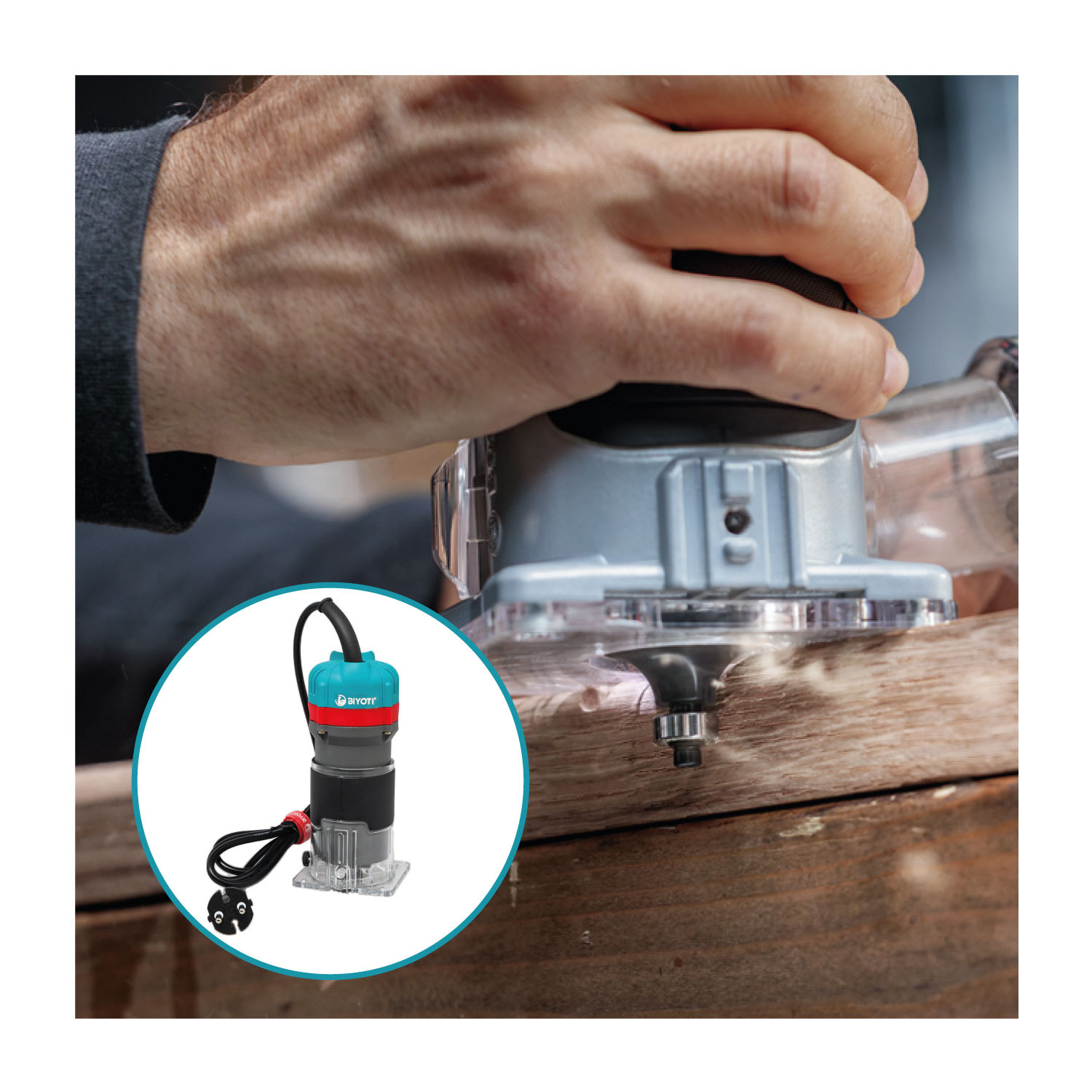 El modelo BYT-WT370 es una ruteadora compacta y práctica, diseñada para realizar cortes y acabados de precisión en trabajos de carpintería y bricolaje. Su diseño ligero y ergonómico permite un manejo cómodo, incluso en sesiones prolongadas, ofreciendo un control estable y seguro en todo momento. Es ideal para tareas como rebajes, ranurados, biselados, cortes decorativos y ajustes en piezas de madera, MDF o aglomerado, logrando terminaciones limpias y profesionales. Su estructura resistente garantiza durabilidad, mientras que su tamaño portátil la hace fácil de transportar y almacenar.