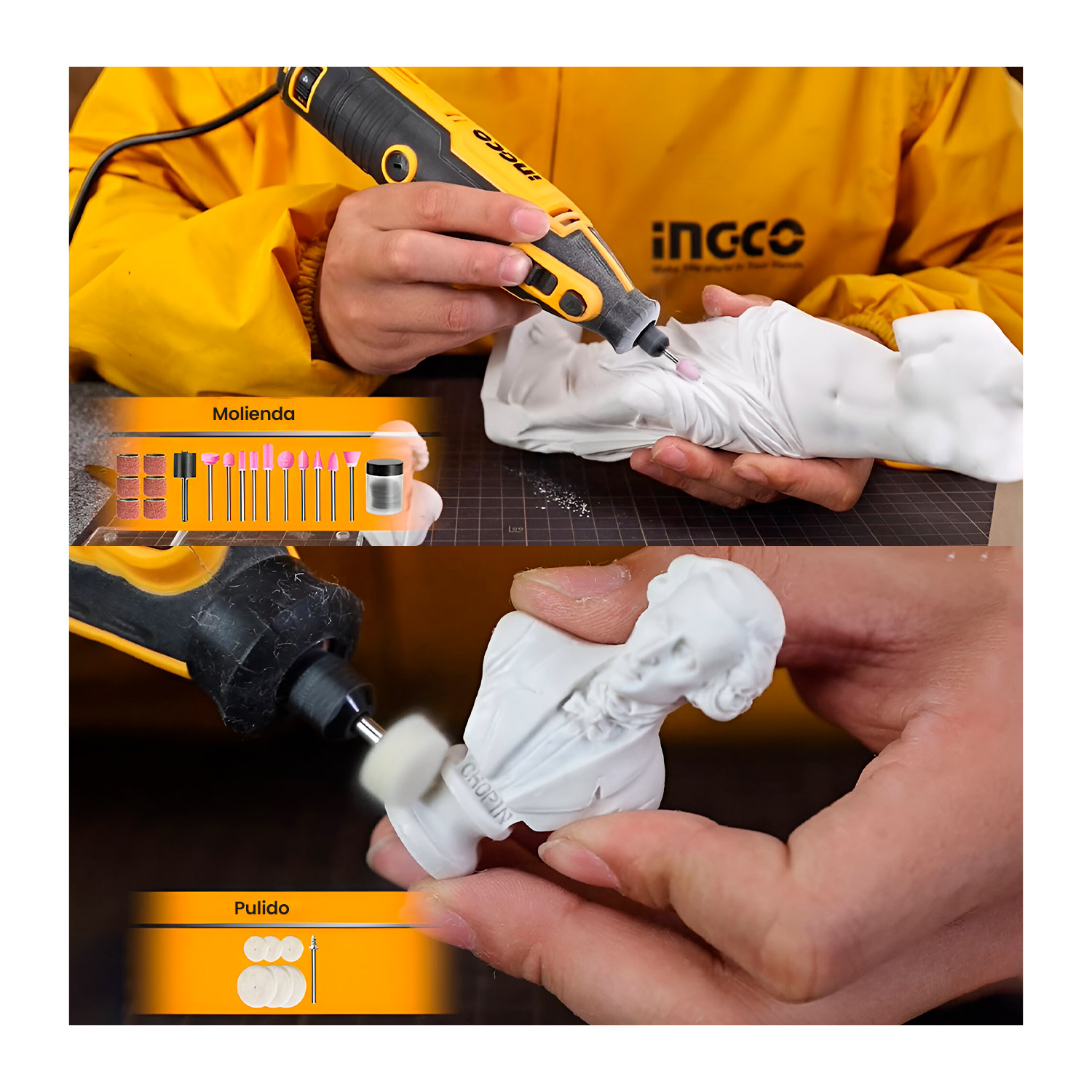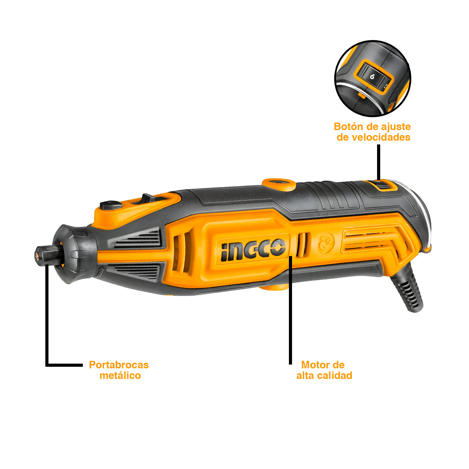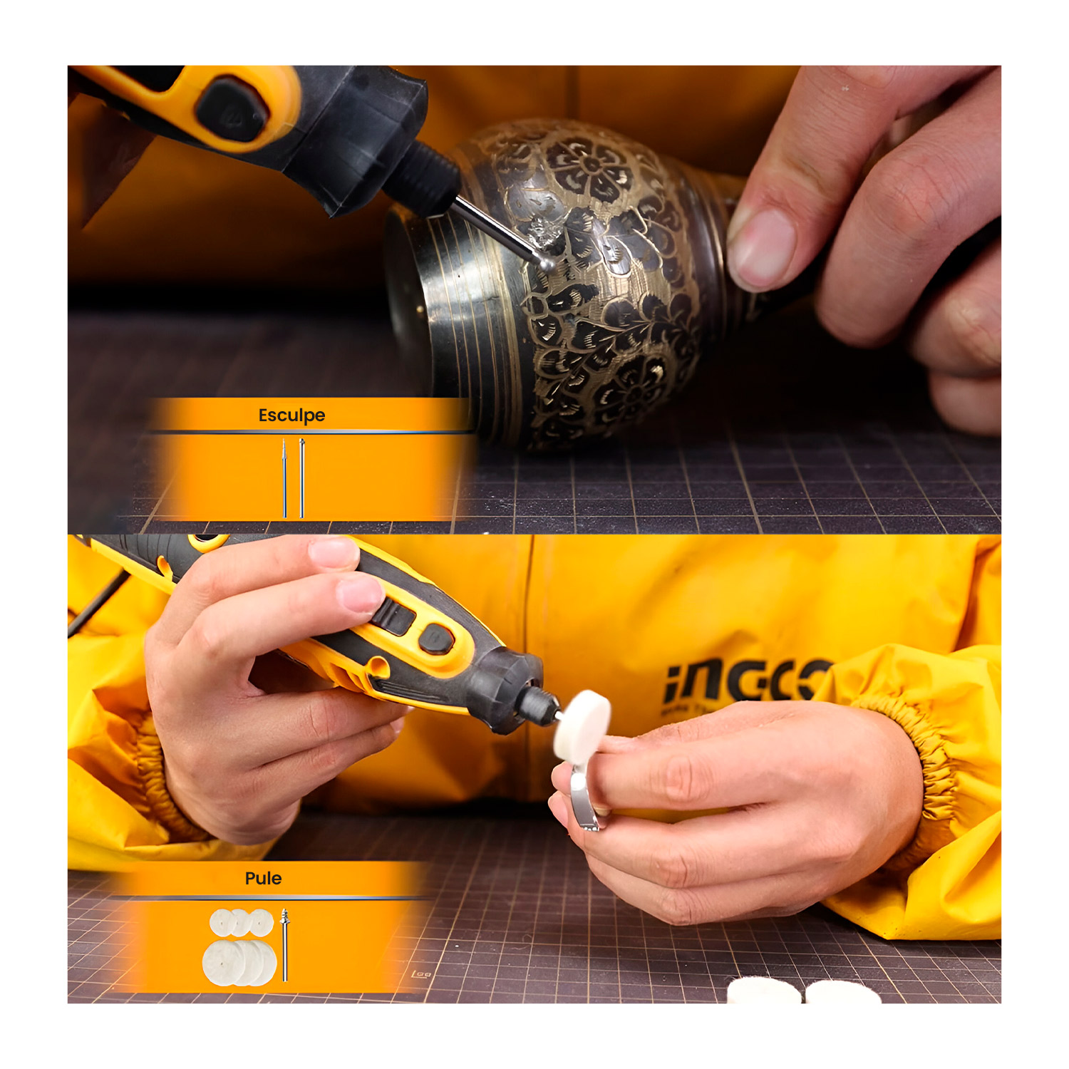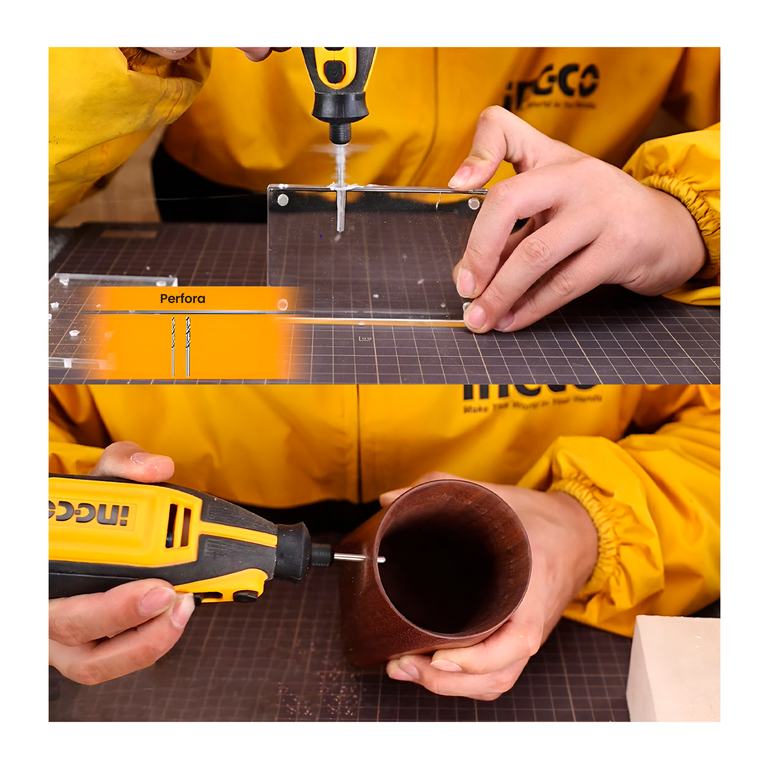 Mini torno de 130W con velocidad variable de 10 000 a 35 000 rpm y pinzas de 3.2/2.3 mm, ideal para trabajos de tallado, pulido y corte. Incluye eje flexible y 251 accesorios, todo en práctica valija para mantener tus herramientas organizadas y listas para cualquier proyecto.