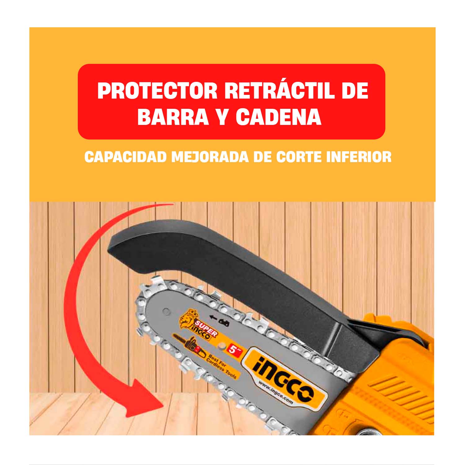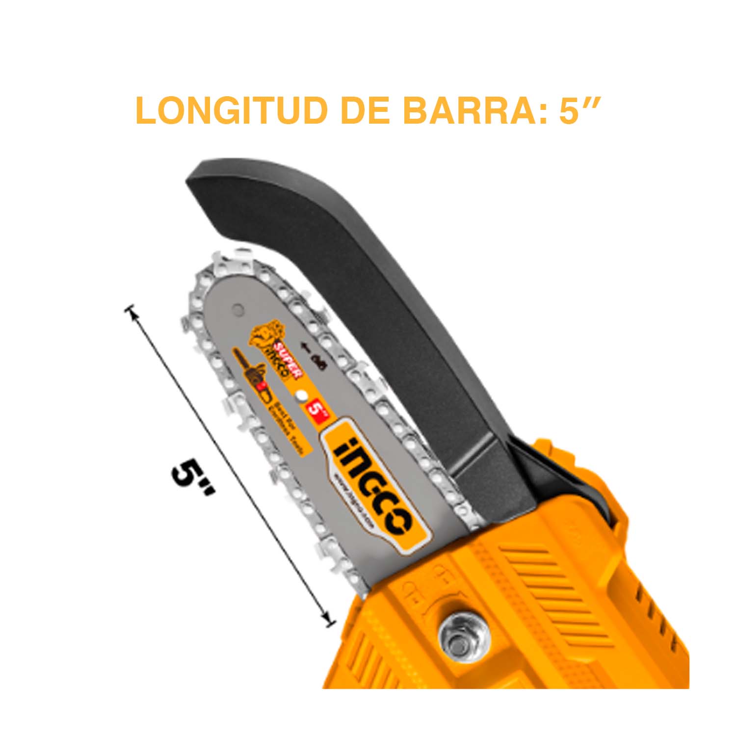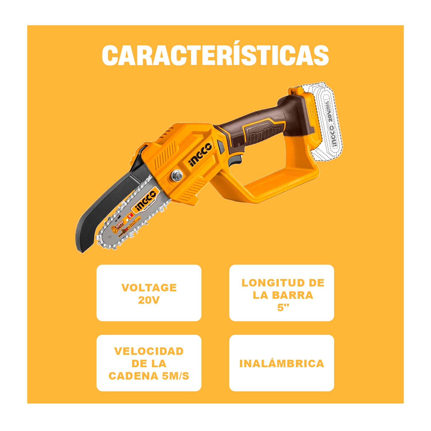 Equipada con una barra de 5 pulgadas (13 cm) y una velocidad de cadena de 5 m/s, garantiza cortes rápidos y controlados, logrando un rendimiento eficiente en madera y ramas de tamaño moderado. Su voltaje de 20V proporciona la potencia necesaria para un desempeño estable y confiable.