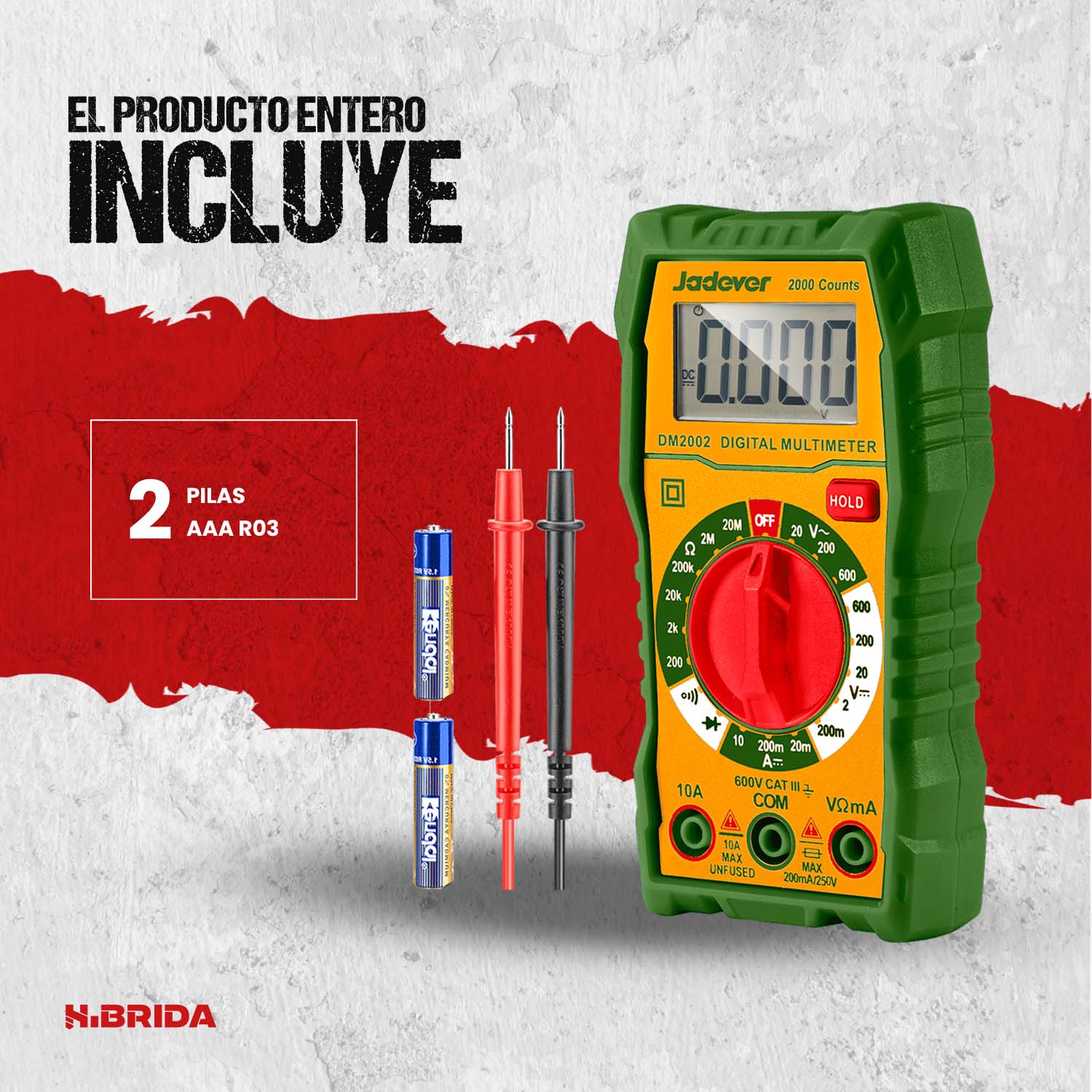 - Incluye: puntas de prueba, batería AA y manual de usuario