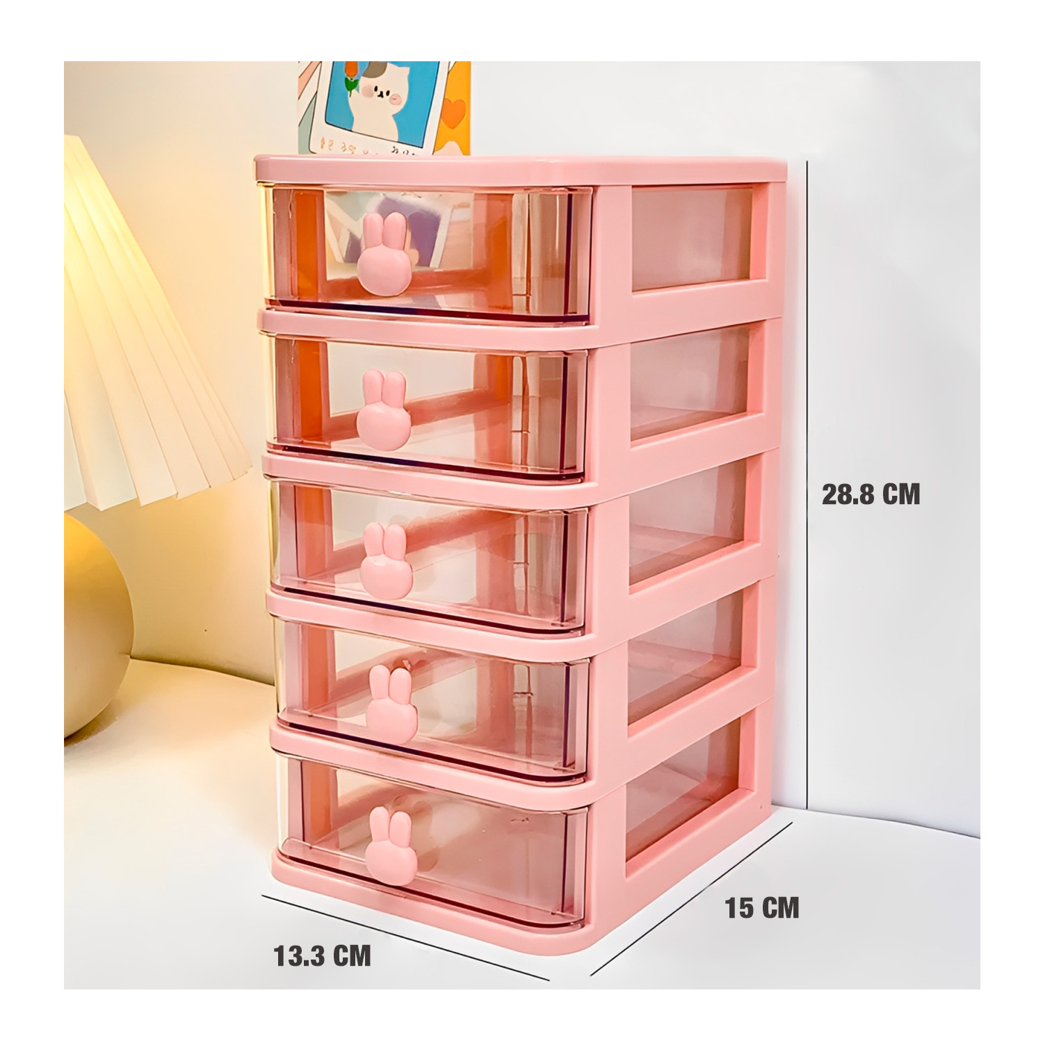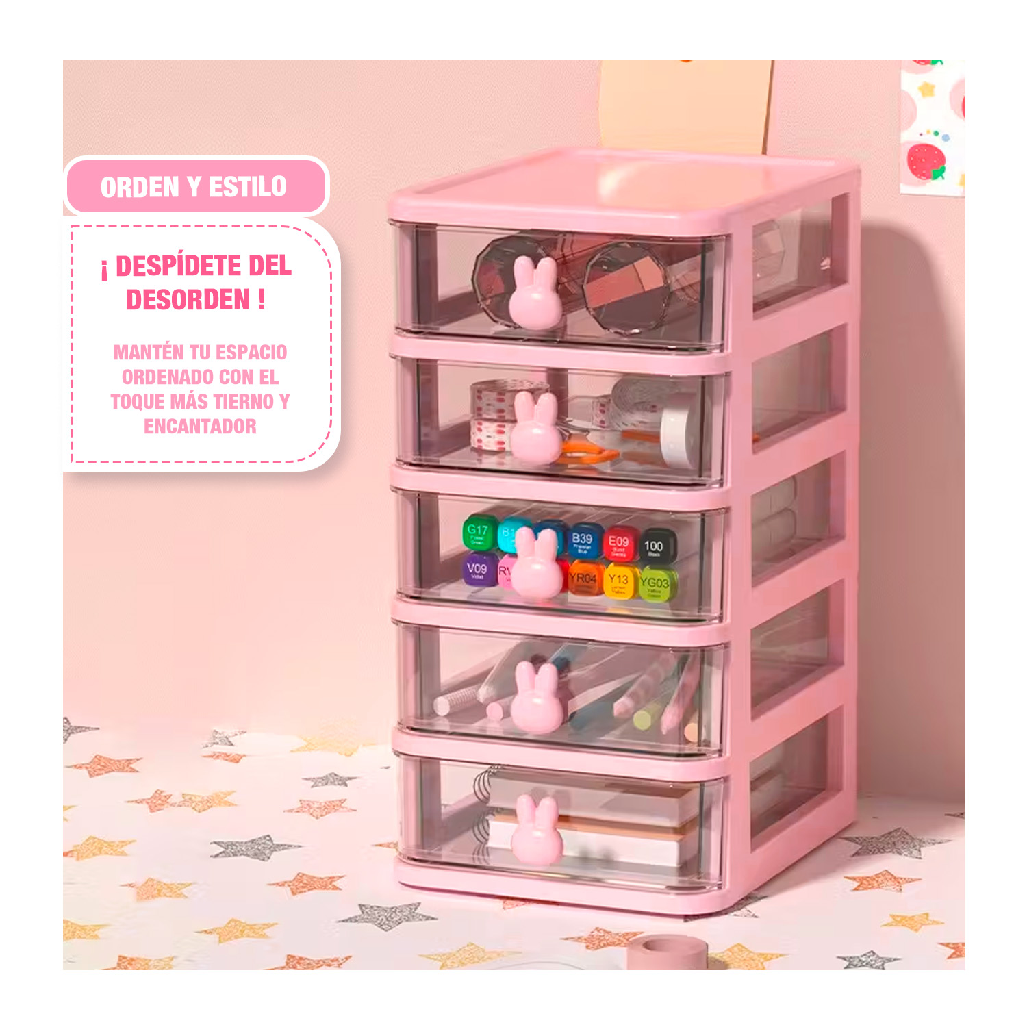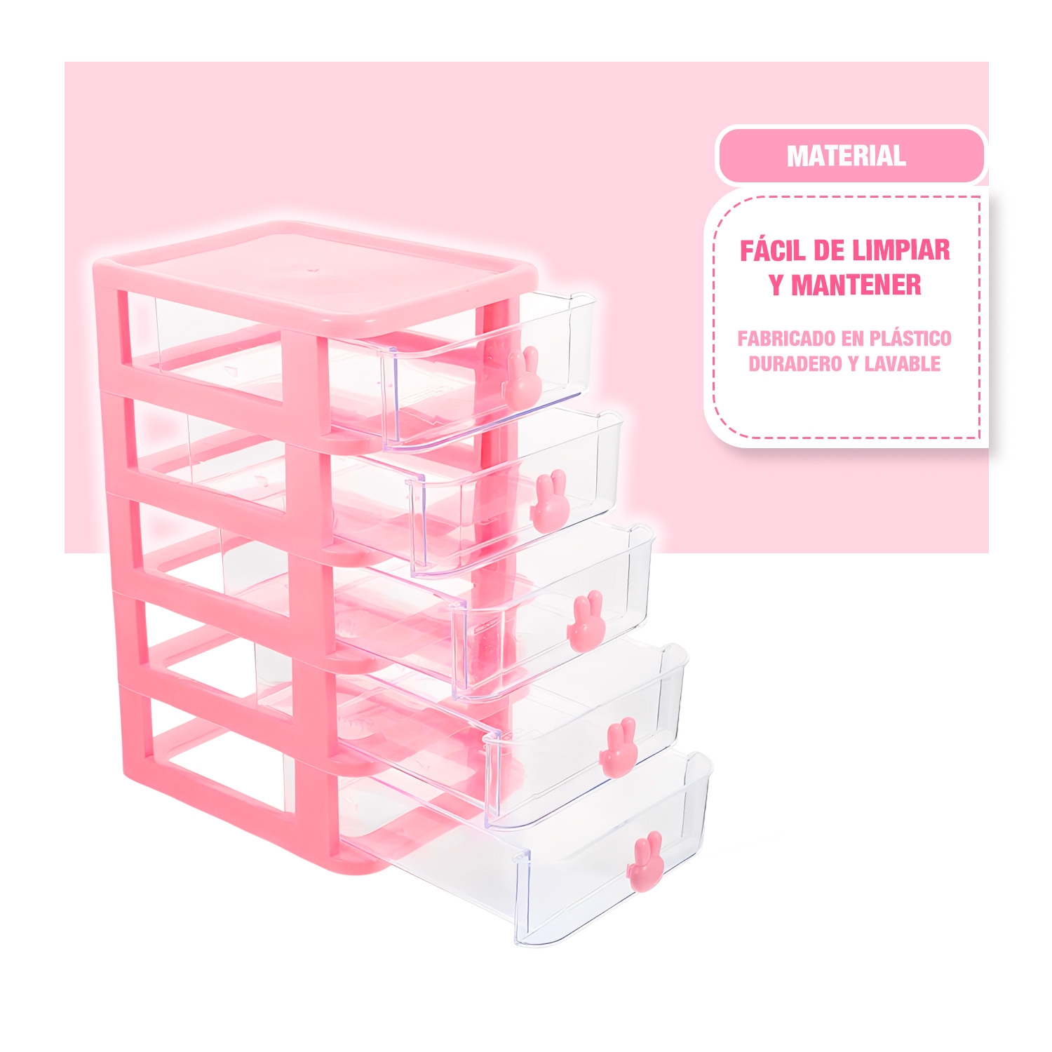 Dale un toque tierno y ordenado a tu espacio con este encantador organizador de cajones rosado. Su diseño compacto y delicado te permite mantener todo en su lugar sin ocupar mucho espacio. Con cinco prácticos compartimentos y tiradores con forma de conejito, podrás guardar desde accesorios, maquillaje y joyas, hasta útiles de oficina o artículos de papelería. Además, su estilo transparente te permite ver fácilmente lo que hay dentro, haciendo que encontrar tus cosas sea rápido y sencillo. Perfecto para escritorios, tocadores o cualquier rincón que quieras mantener bonito y organizado.