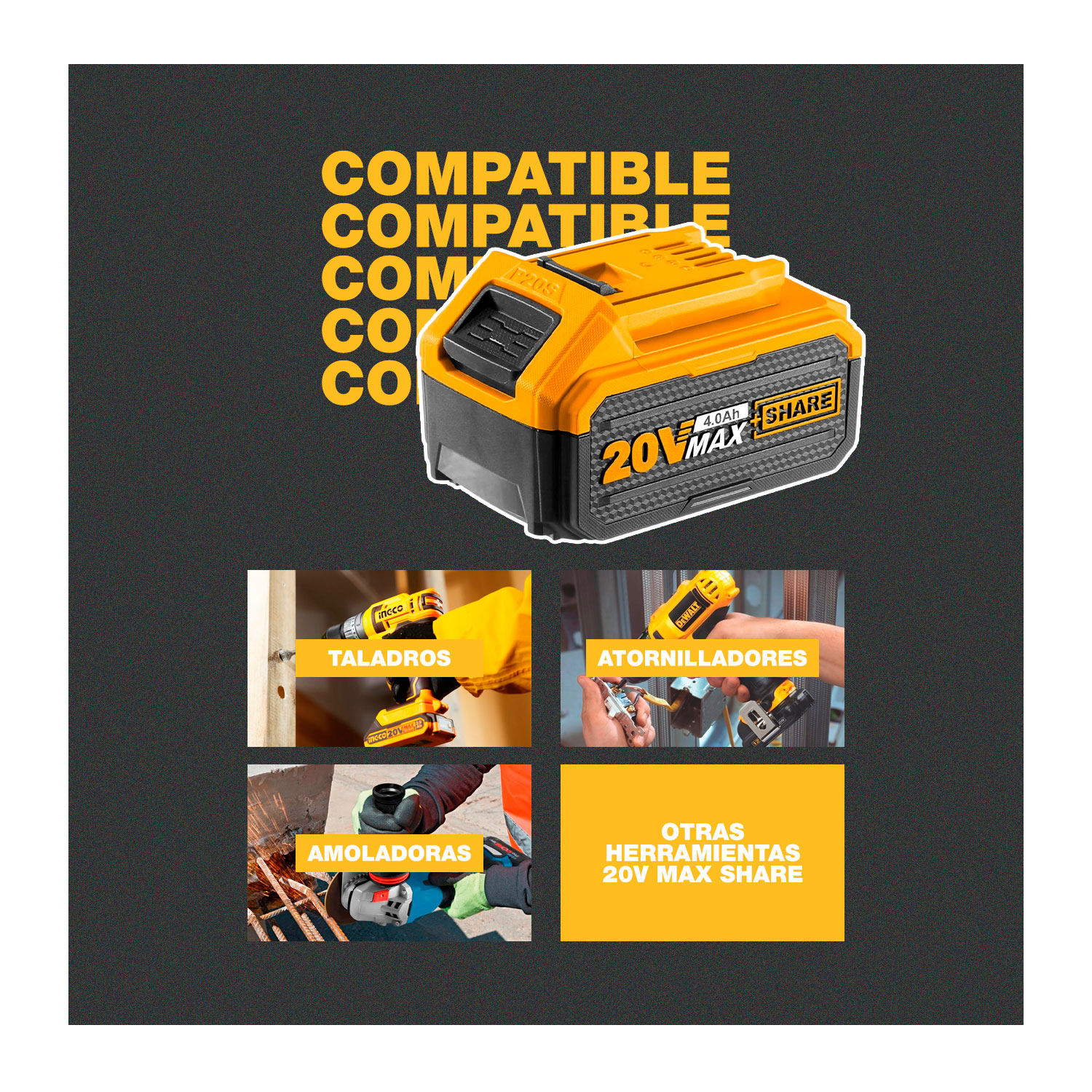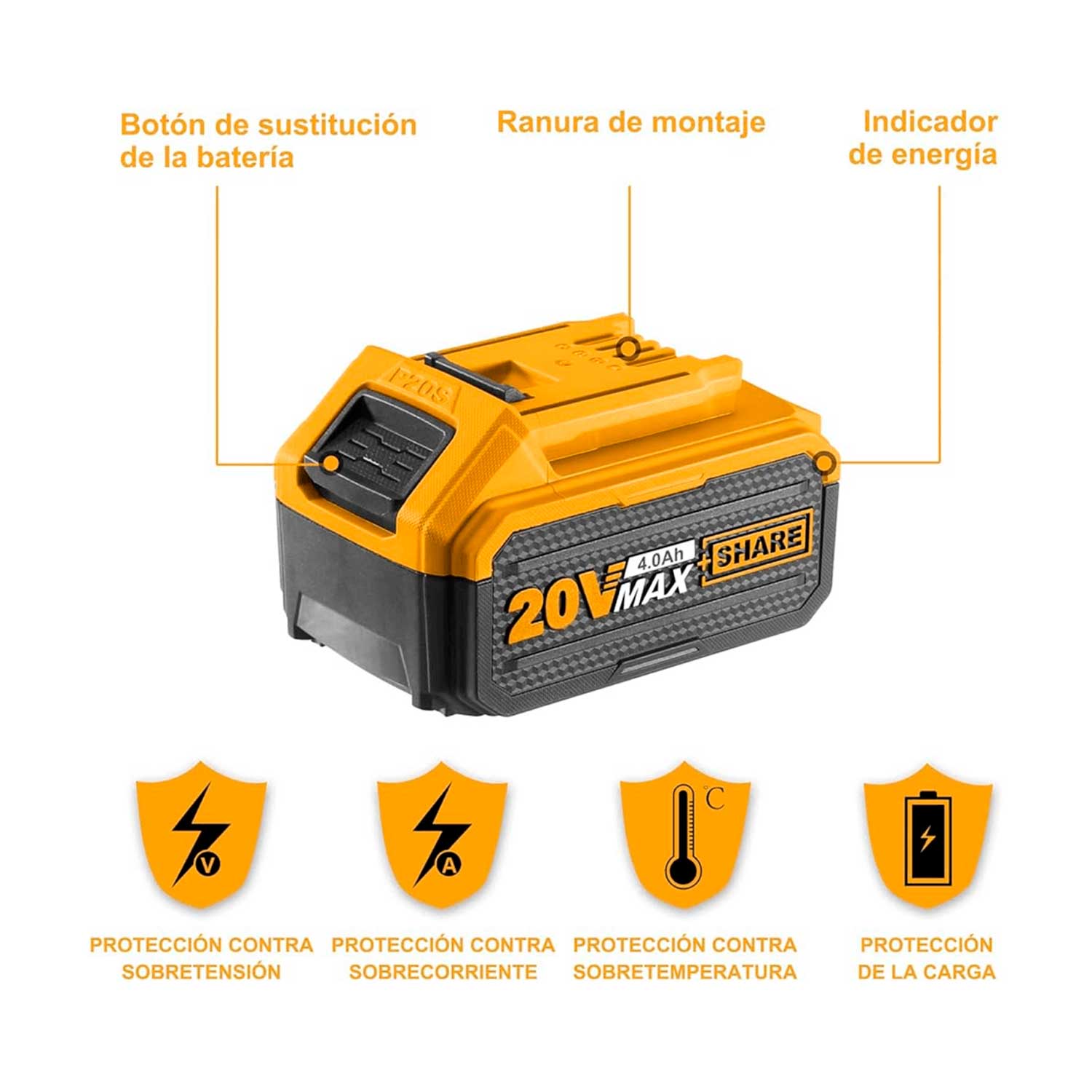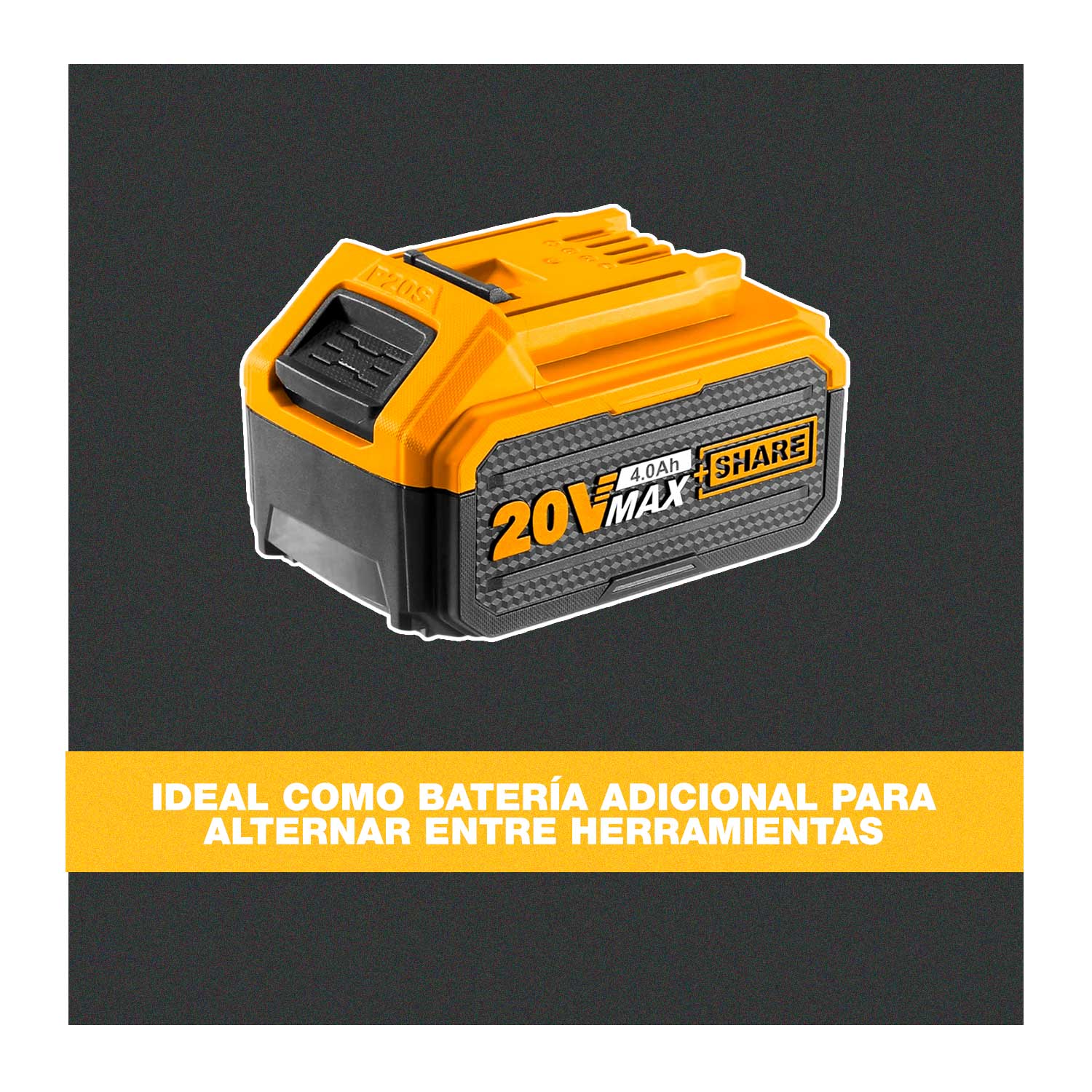 La batería de litio 20V MAX 4.0Ah (MOD-FBLI2002) es una fuente de energía recargable de alta capacidad diseñada para herramientas eléctricas inalámbricas del sistema SHARE, ofreciendo potencia constante, mayor autonomía y rendimiento eficiente en una amplia variedad de aplicaciones, desde bricolaje en el hogar hasta trabajos profesionales; su diseño compacto y liviano incluye protección electrónica contra sobrecargas y temperaturas extremas, lo que la convierte en una opción confiable y duradera para maximizar la productividad de tus herramientas sin cables.