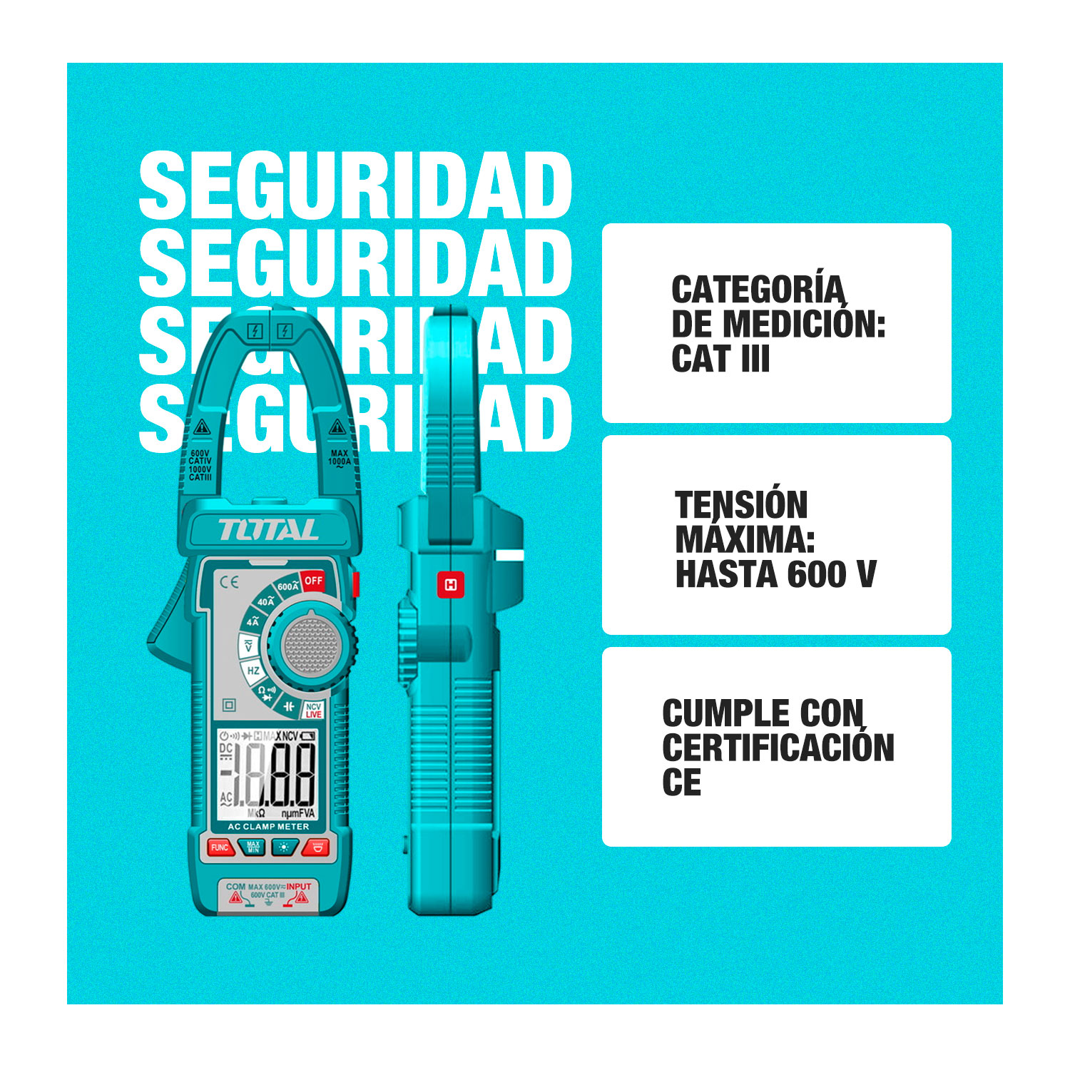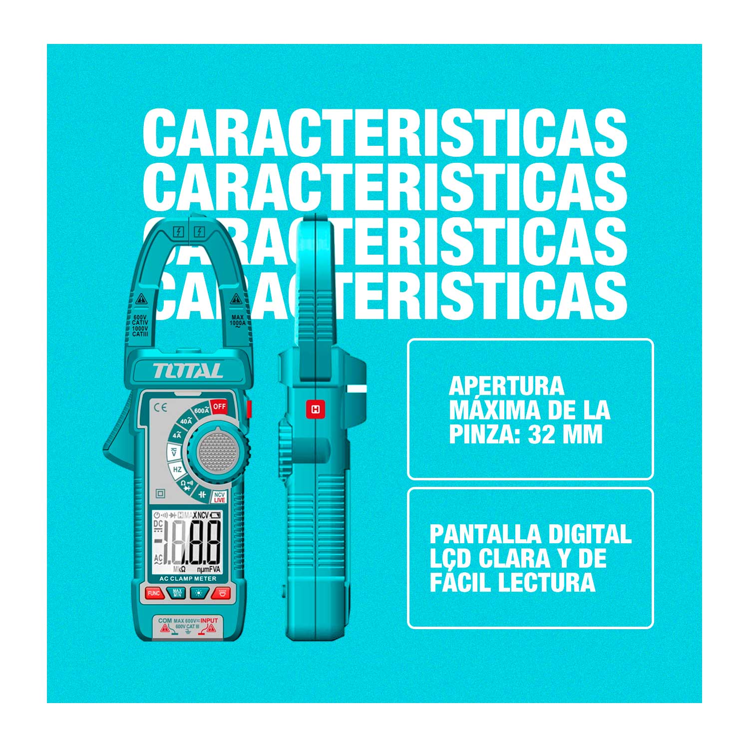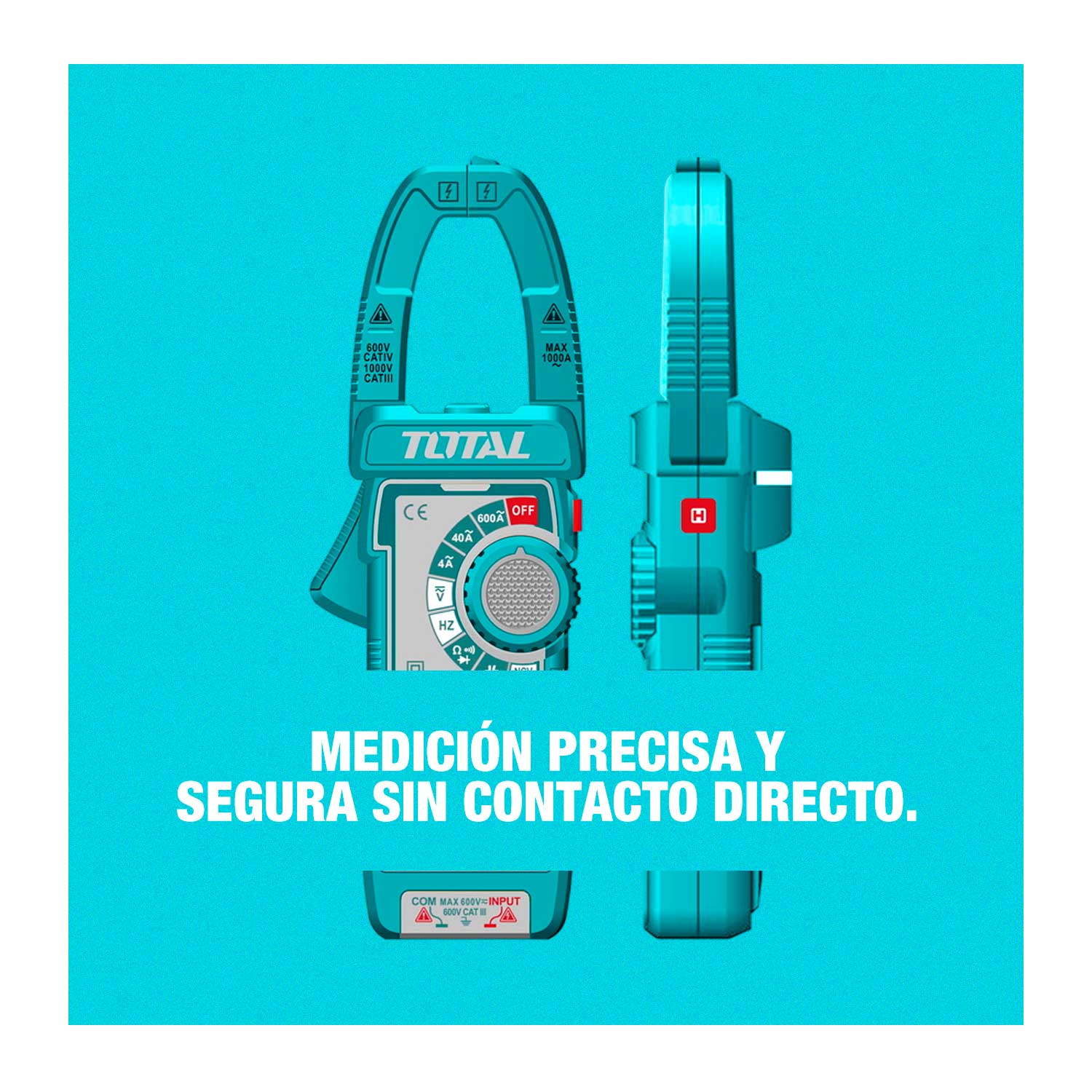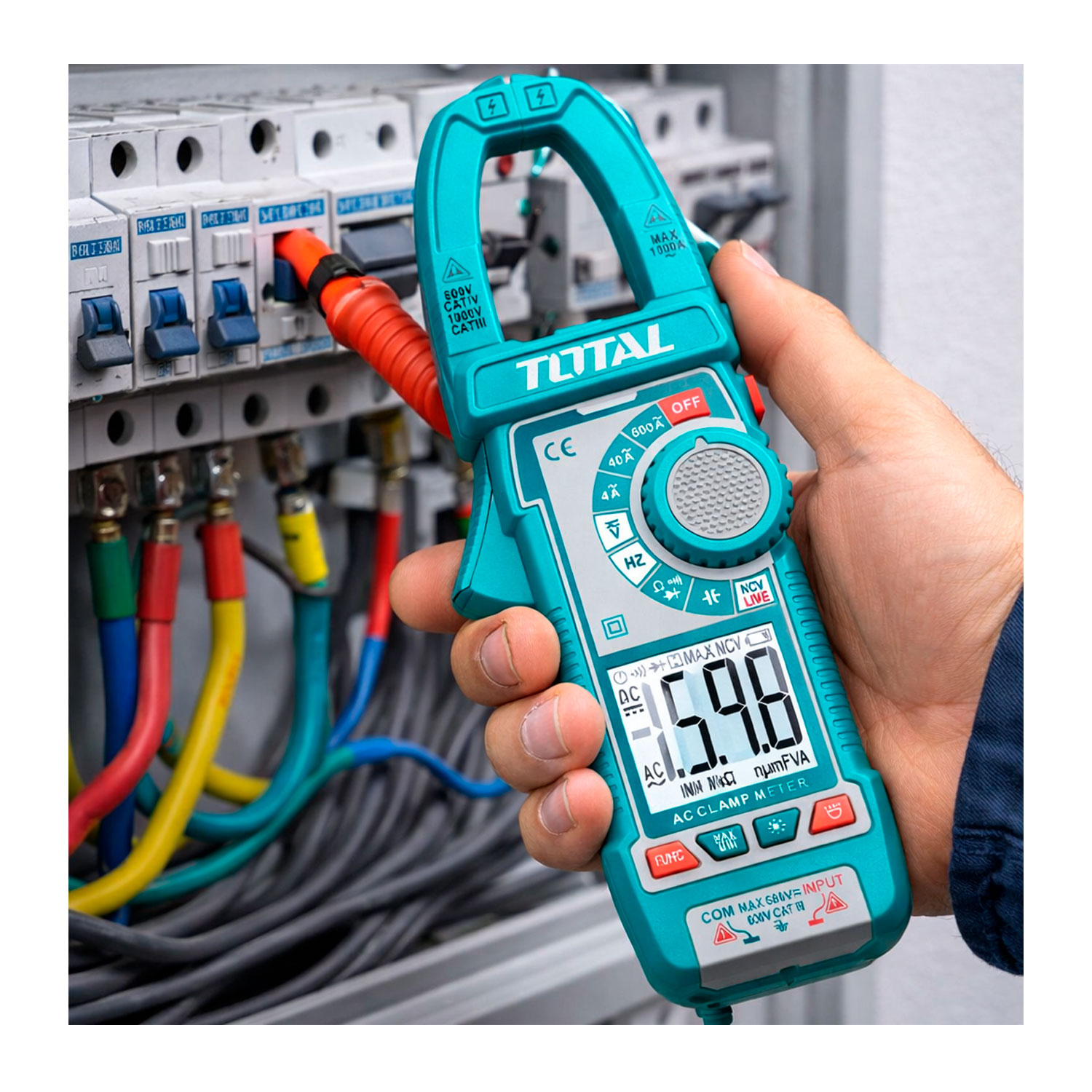 La TOTAL TMT766001 es una pinza amperimétrica digital de grado industrial diseñada para medir con precisión corrientes de hasta 600A AC y voltajes de 600V (AC/DC) mediante tecnología True RMS. Este versátil multímetro destaca por incluir funciones avanzadas de seguridad y diagnóstico, como la detección de voltaje sin contacto (NCV), medición de baja impedancia (LowZ) para eliminar voltajes fantasma, y capacidad para medir resistencia, capacitancia y frecuencia. Su diseño ergonómico cuenta con una pantalla retroiluminada de 4000 cuentas, linterna integrada y clasificación de seguridad CAT III 600V, lo que la convierte en una herramienta esencial y confiable para electricistas profesionales en 2026.