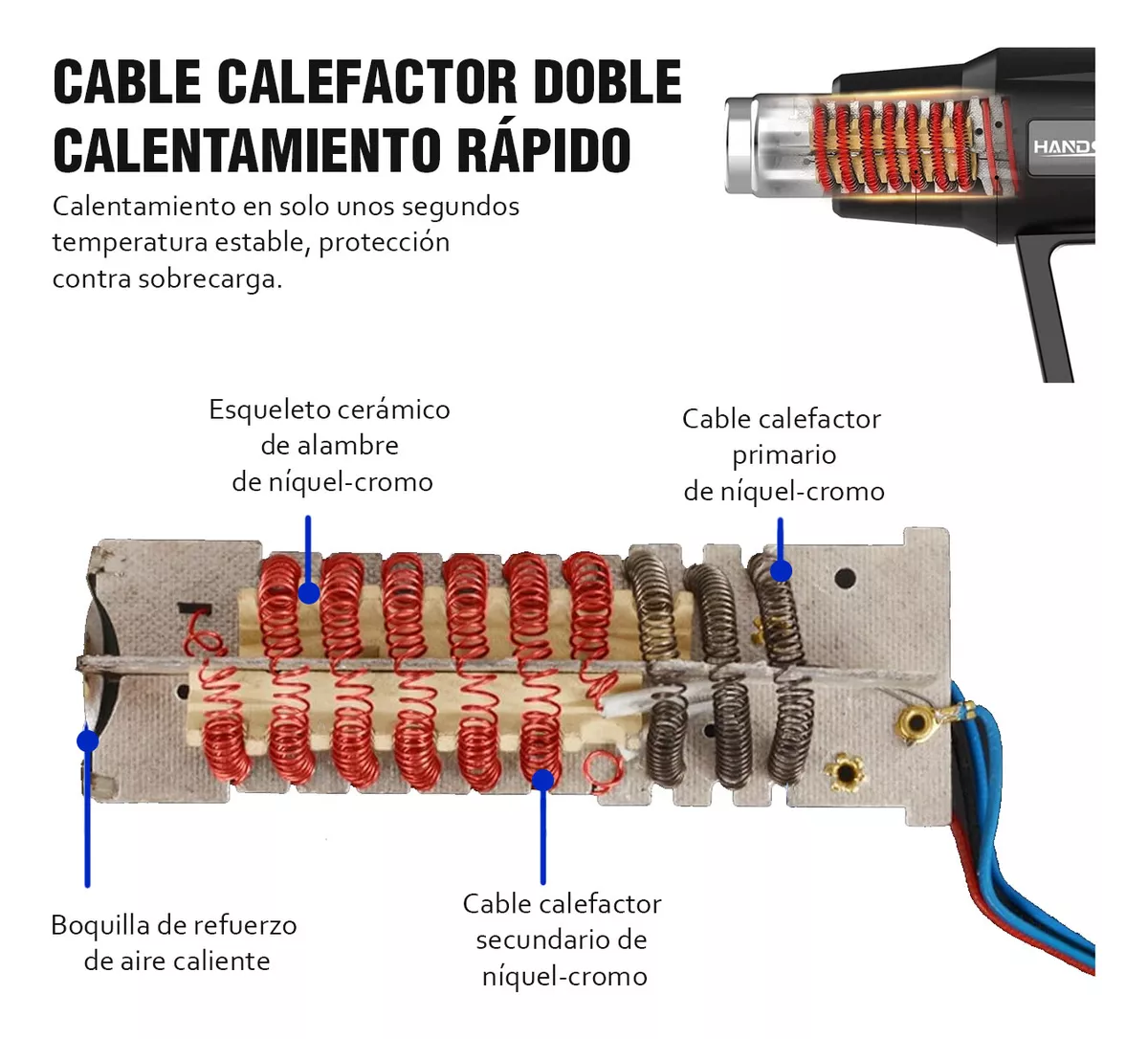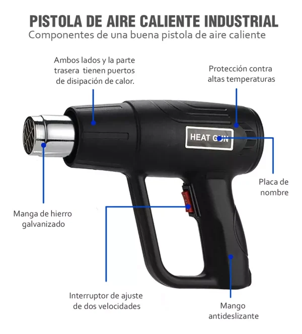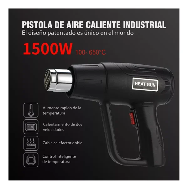 Es una herramienta indispensable para los profesionales que buscan eficiencia y calidad. Con una potencia de 2000 W y un voltaje de 220 V, es capaz de alcanzar una temperatura de 100 a 650 °C, lo que lo hace ideal para una variedad de aplicaciones.