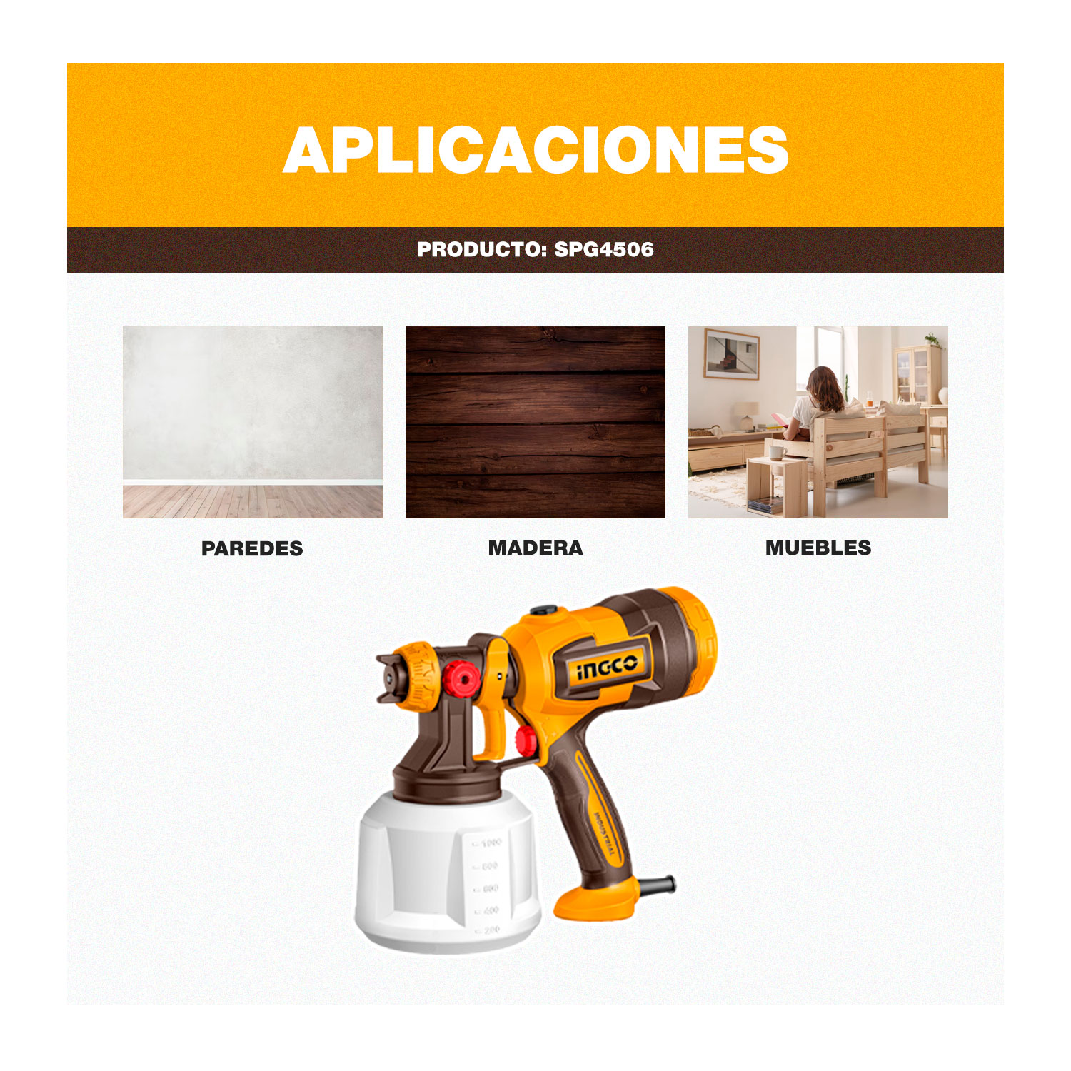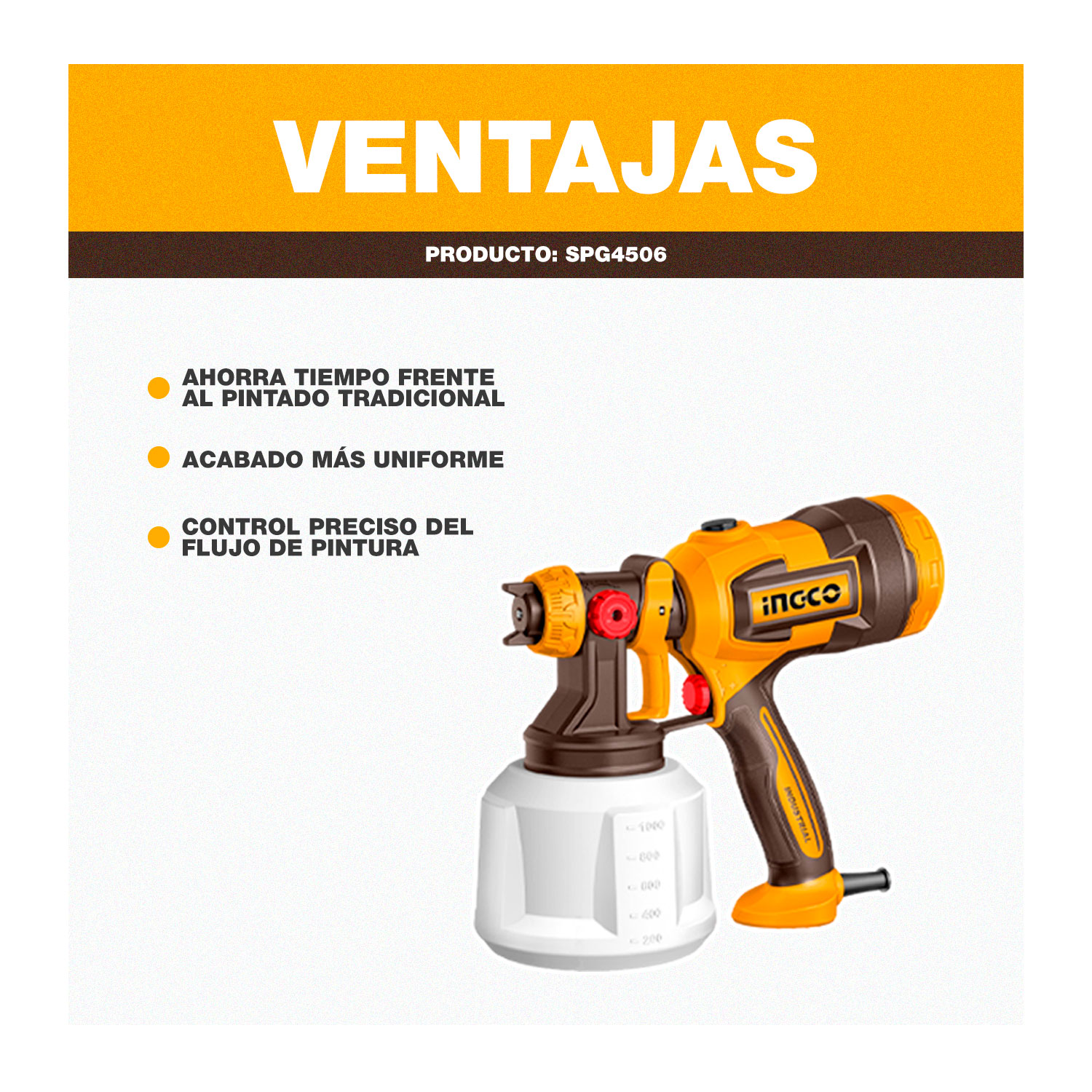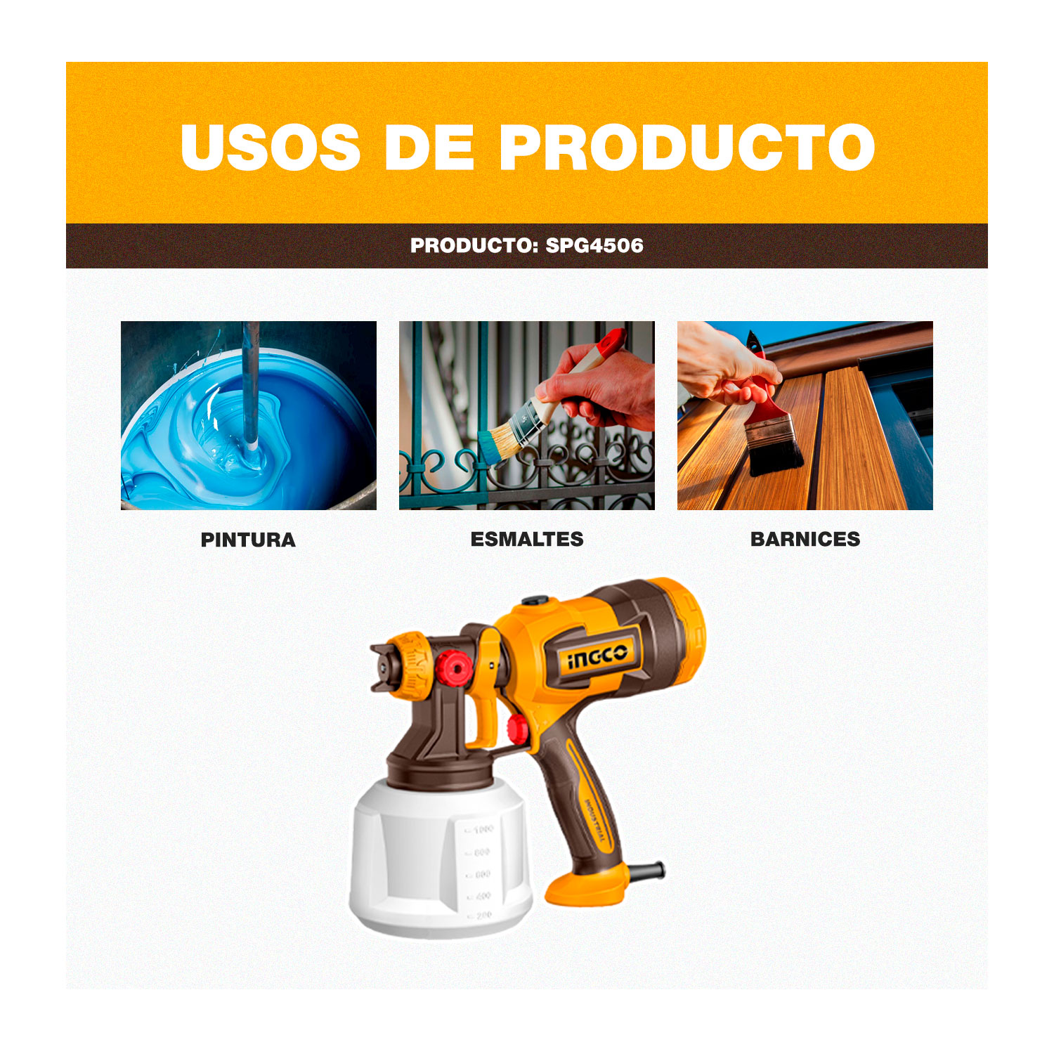 La pistola de pintar eléctrica INGCO SPG4506 de 530 W es una herramienta práctica y eficiente, ideal para trabajos de pintura en el hogar y uso semi-profesional. Su sistema eléctrico tipo HVLP permite una aplicación uniforme y controlada sin necesidad de compresor, logrando un mejor aprovechamiento de la pintura y acabados más limpios. Es adecuada para pintar paredes, muebles, puertas y superficies de madera o metal, ofreciendo facilidad de uso, buen rendimiento y resultados consistentes. Su diseño ergonómico y funcionamiento continuo la convierten en una excelente opción para proyectos de mantenimiento, remodelación y decoración.