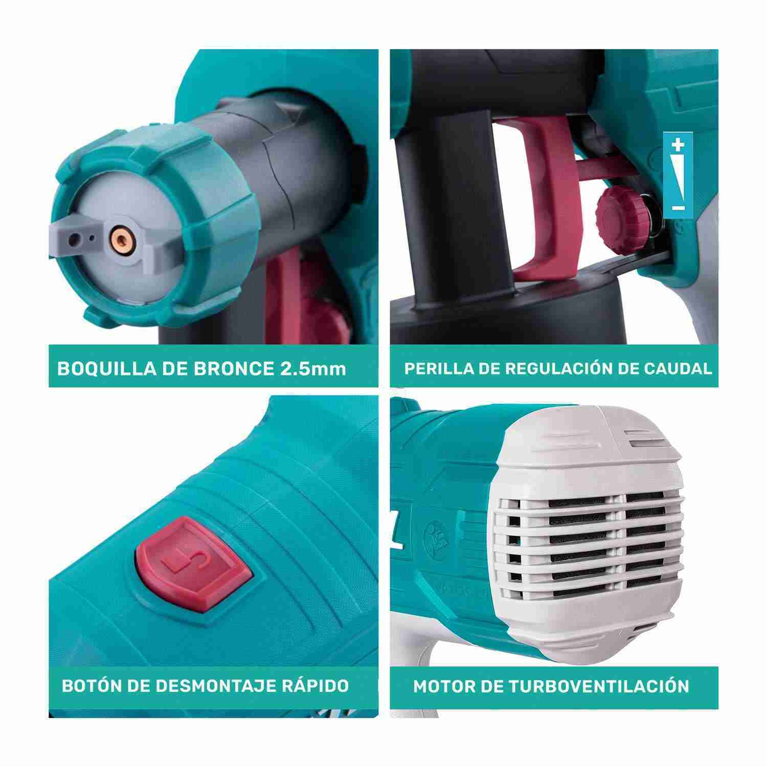Pistola para pintar inalámbrica, diseño ergonómico para mayor comodidad. Ideal para carpintería y remodelación, ahorra esfuerzo y pintura. Incluye taza medidora y aguja de limpieza. Limpiar después de uso y evitar dejar pintura en el recipiente.
