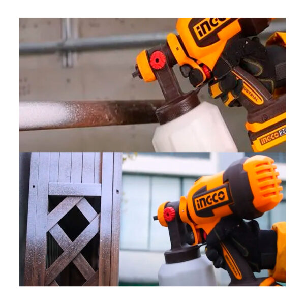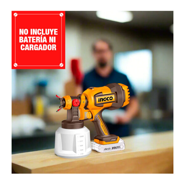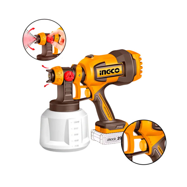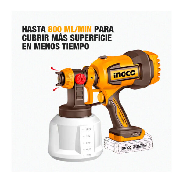 La pistola pulverizadora INGCO CSGLI2004 es una herramienta portátil que funciona con batería de 20 V (no incluye batería ni cargador), diseñada para aplicar pintura con comodidad y sin cables. Tiene un caudal máximo de 800 ml/min, capacidad del contenedor de 1 000 ml, presión de pulverización ajustable entre 0,1 y 0,2 bar y puede manejar pinturas con viscosidad de hasta 120 DIN-s. Además, incluye accesorios como boquillas de cobre (1,5 mm y 2,5 mm), aguja limpiaboquillas, copa medidora de viscosidad, y boquilla sopladora para residuos.