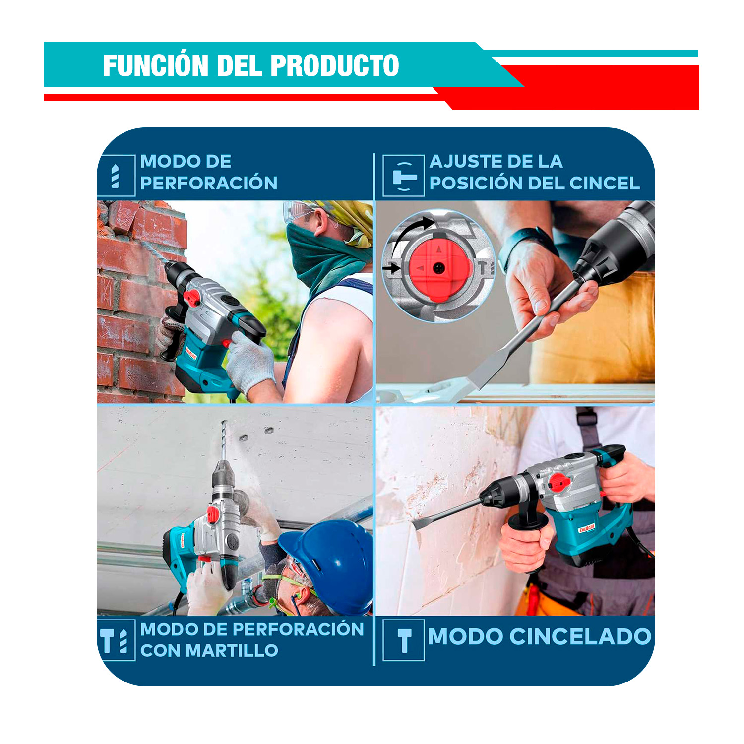 Diseñado para los trabajos más exigentes, este potente rotomartillo combina fuerza, precisión y versatilidad en una sola herramienta. Sus múltiples modos de trabajo permiten perforar, percutir y cincelar con total facilidad, logrando resultados rápidos y profesionales en concreto, ladrillo, metal o madera. Su sistema de cambio rápido de accesorios y su diseño robusto garantizan comodidad, seguridad y eficiencia en cada uso, convirtiéndolo en el aliado ideal para obras, instalaciones y remodelaciones. Perfecto para quienes buscan rendimiento, durabilidad y alto desempeño en cada proyecto.