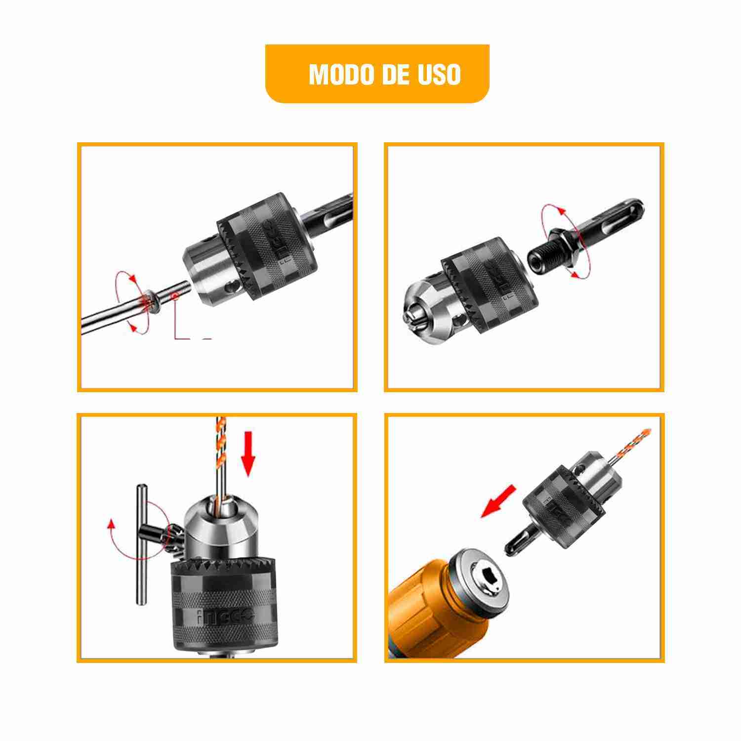 Adapta y acepta cualquier tipo de broca como cualquier taladro convencional pero sin perder la potencia del rotomartillo