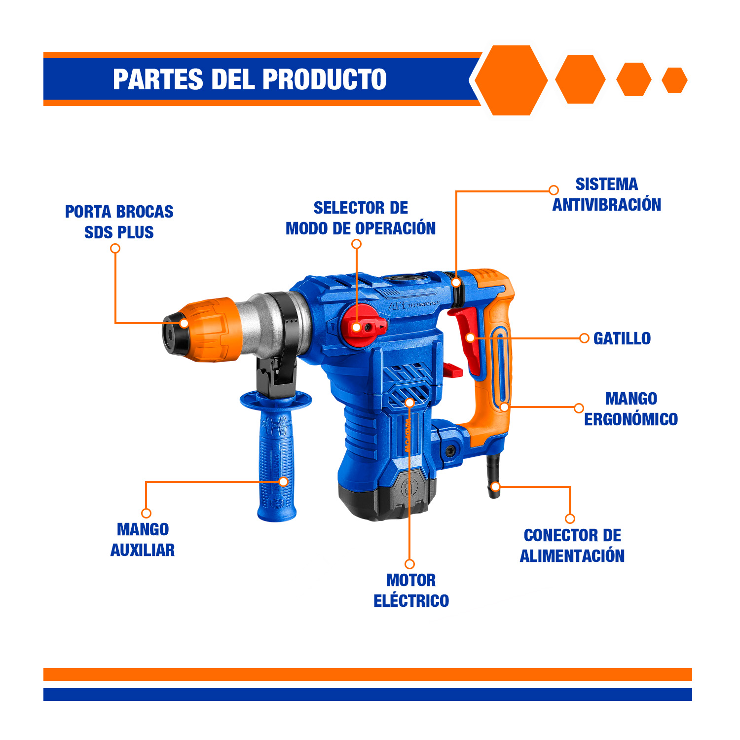 Potencia y resistencia se unen en esta herramienta diseñada para trabajos exigentes. Con un motor de alto rendimiento y sistema de impacto de gran fuerza, permite perforar y demoler superficies de concreto, acero y madera con total eficiencia. Su diseño ergonómico con sistema antivibración reduce la fatiga, brindando mayor comodidad en largas jornadas de trabajo. Además, incluye un completo set de accesorios y estuche de transporte que facilitan su uso y almacenamiento, convirtiéndola en la opción ideal para profesionales y aficionados de la construcción que buscan precisión, fuerza y durabilidad en una sola herramienta.SI