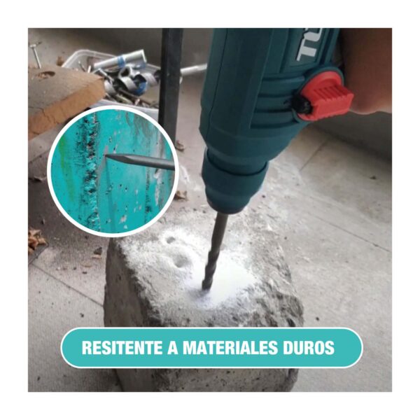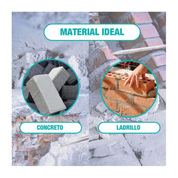 - Capacidad máxima de perforación: 16mm en hormigón, 10mm en acero, 20mm en madera.