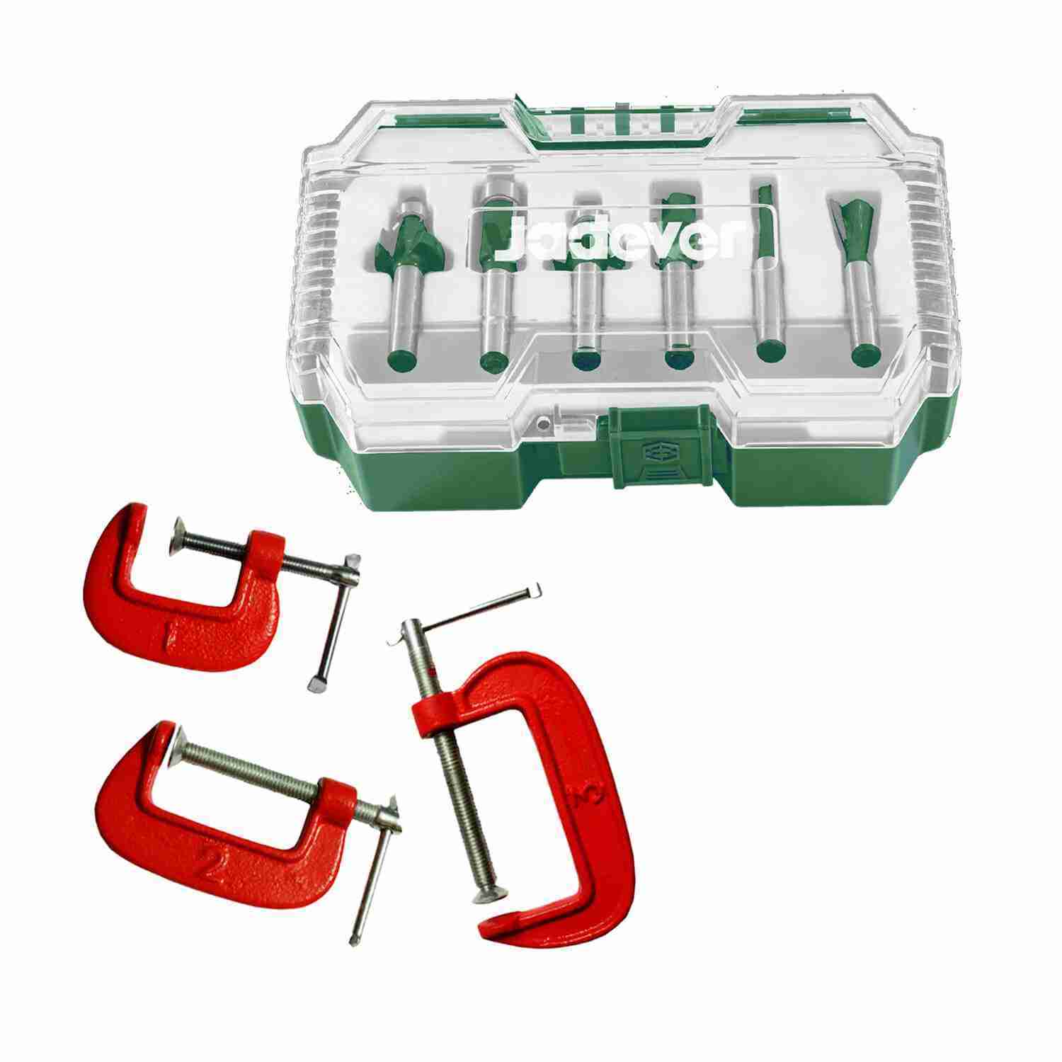 SET DE FRESAS 6MM 6PZS RUTEADORA JADEVER + 3 PRENSAS TIPO C